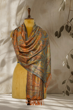 Revel in the vibrant allure of this Copper Orange Pure Silk Jamawar stole. This stunning piece features a lively, all-over paisley (buta) pattern in a rich palette of copper orange, accented with shades of teal, blue, and gold.