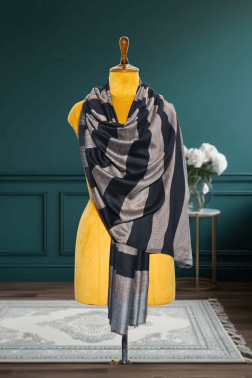 This elegant Navy Blue Kani Stripe Palla Cashmera Fine Wool Stole offers a sophisticated blend of classic design and rich tradition. The deep navy blue body features refined vertical stripes, adding a subtle texture and timeless appeal.