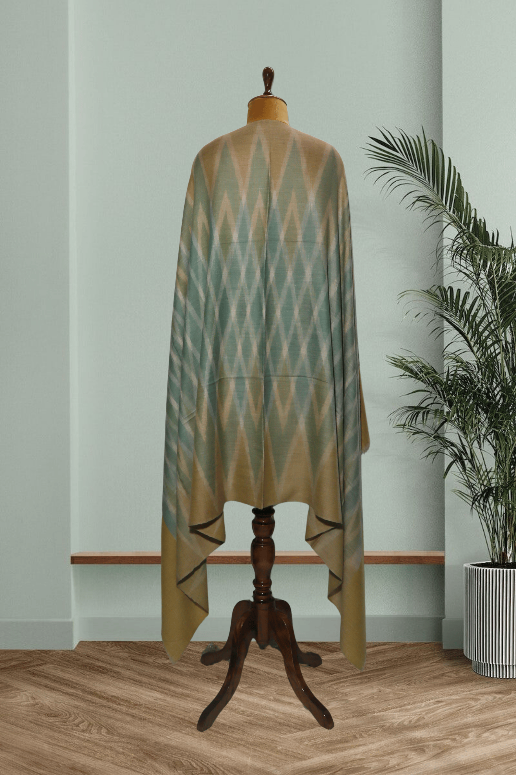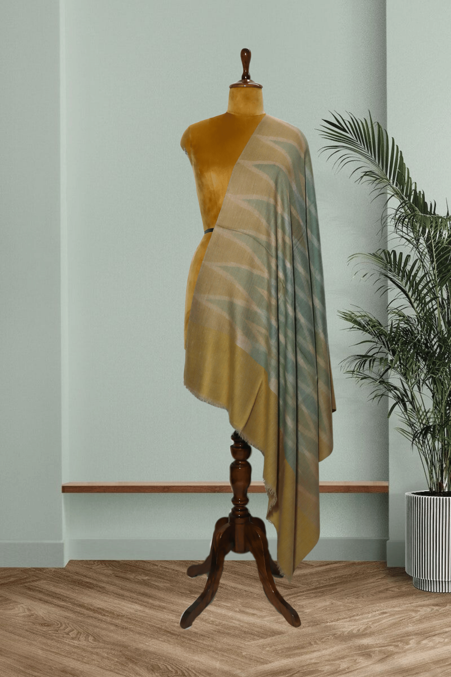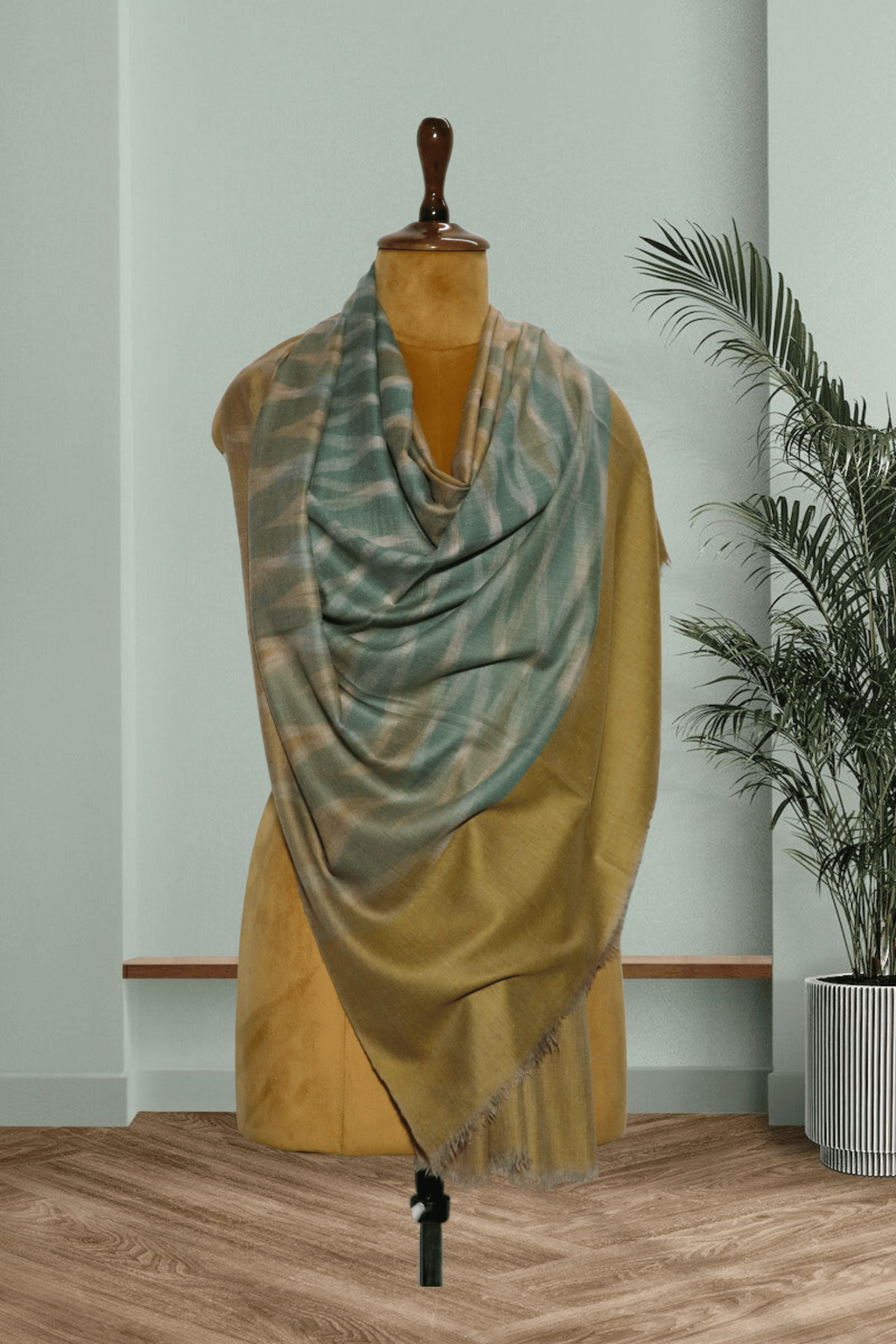 levate your style with the artistic flair of this Pure Pashmina Ikkat Shawl. Expertly hand-weaved in Kashmir from the finest Pure Pashmina wool, it guarantees an incredibly soft feel, lightweight warmth, and an elegant flow. The design showcases a sophisticated Ikkat pattern—characterized by its distinct, blurry-edged diamond and diagonal motifs—in a muted, earthy palette of Mustard/Olive Green, Soft Grey/Beige, and Muted Blue/Teal. The unique tie-dye weaving technique creates an abstract, painterly effect across the fabric. The generous inch size makes this shawl a modern, yet timeless, statement accessory.