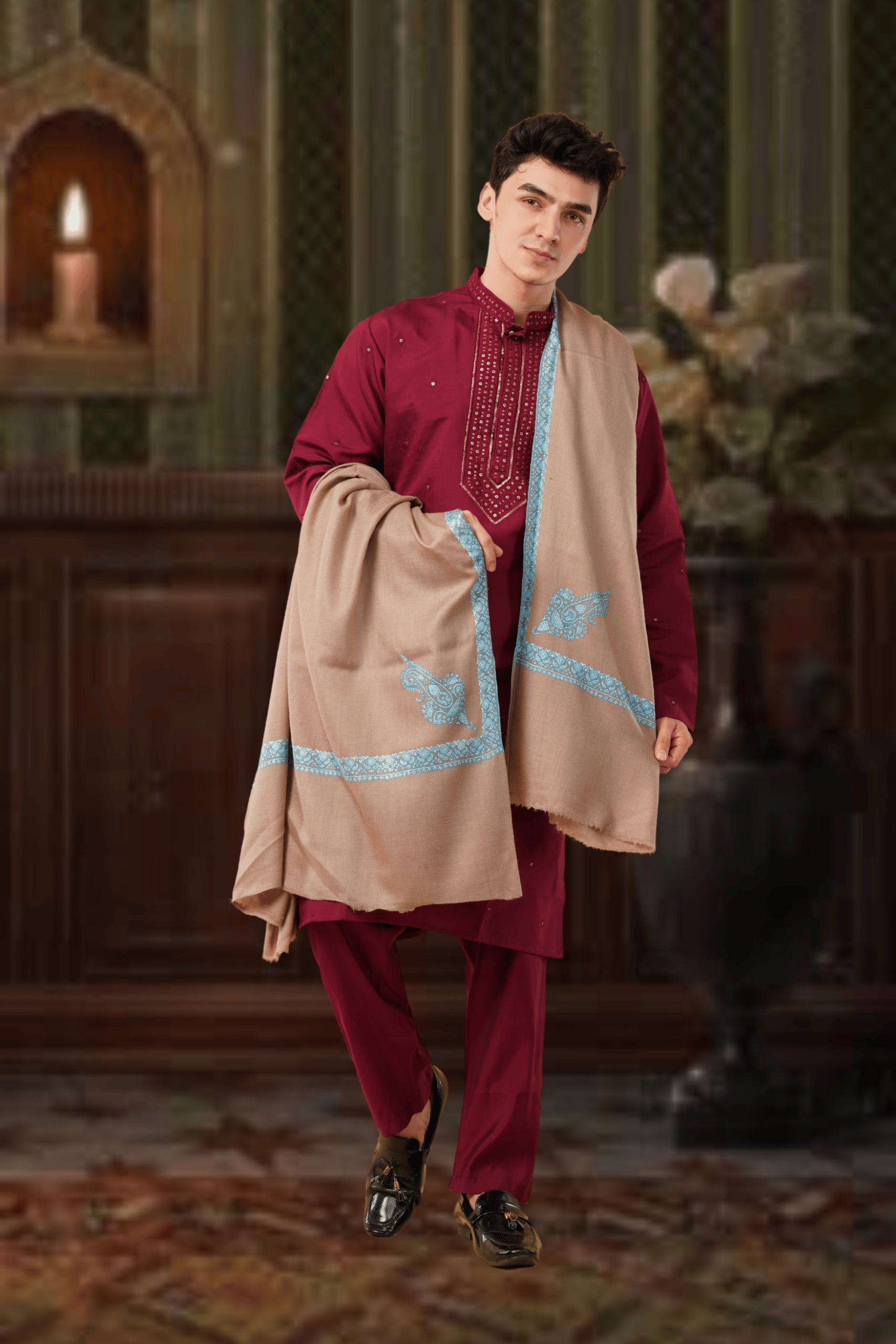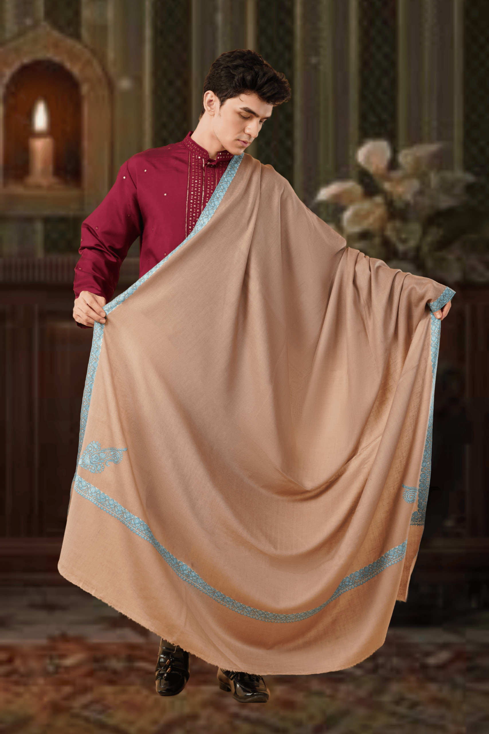 Description: Discover understated elegance with this Beige Haishidaar Pure Pashmina Shawl for men. Made from the softest pure Pashmina, this shawl provides exceptional warmth and a smooth, luxurious feel. It is beautifully adorned with intricate hand embroidery along its borders and corners, a style known as “Haishidaar.” The gentle teal embroidery in delicate patterns stands out gracefully against the refined beige background, making it a versatile and sophisticated accessory for traditional or contemporary wear.