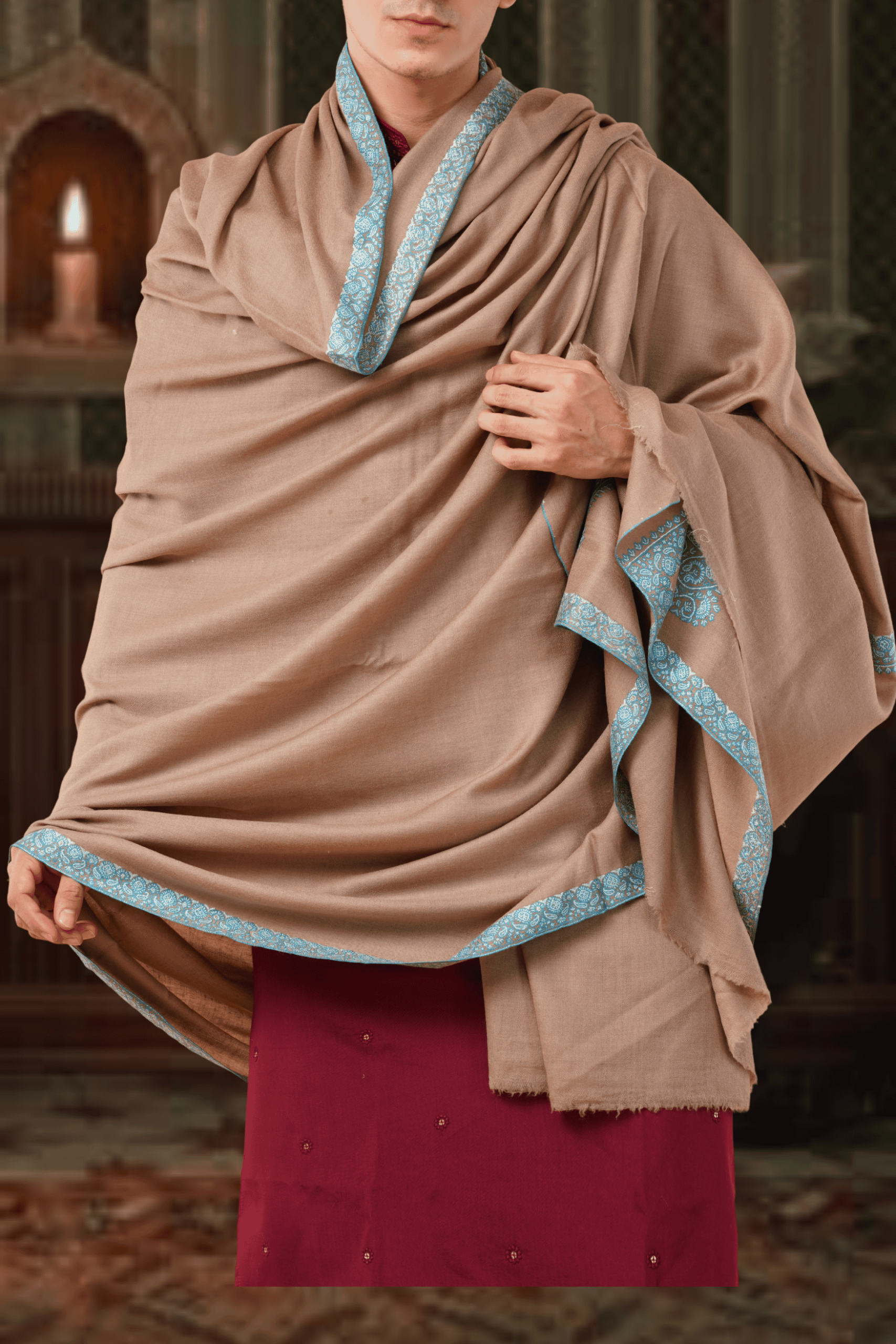 Beige Haishidaar Pure Pashmina Shawl with Teal Hand Embroidery for Men