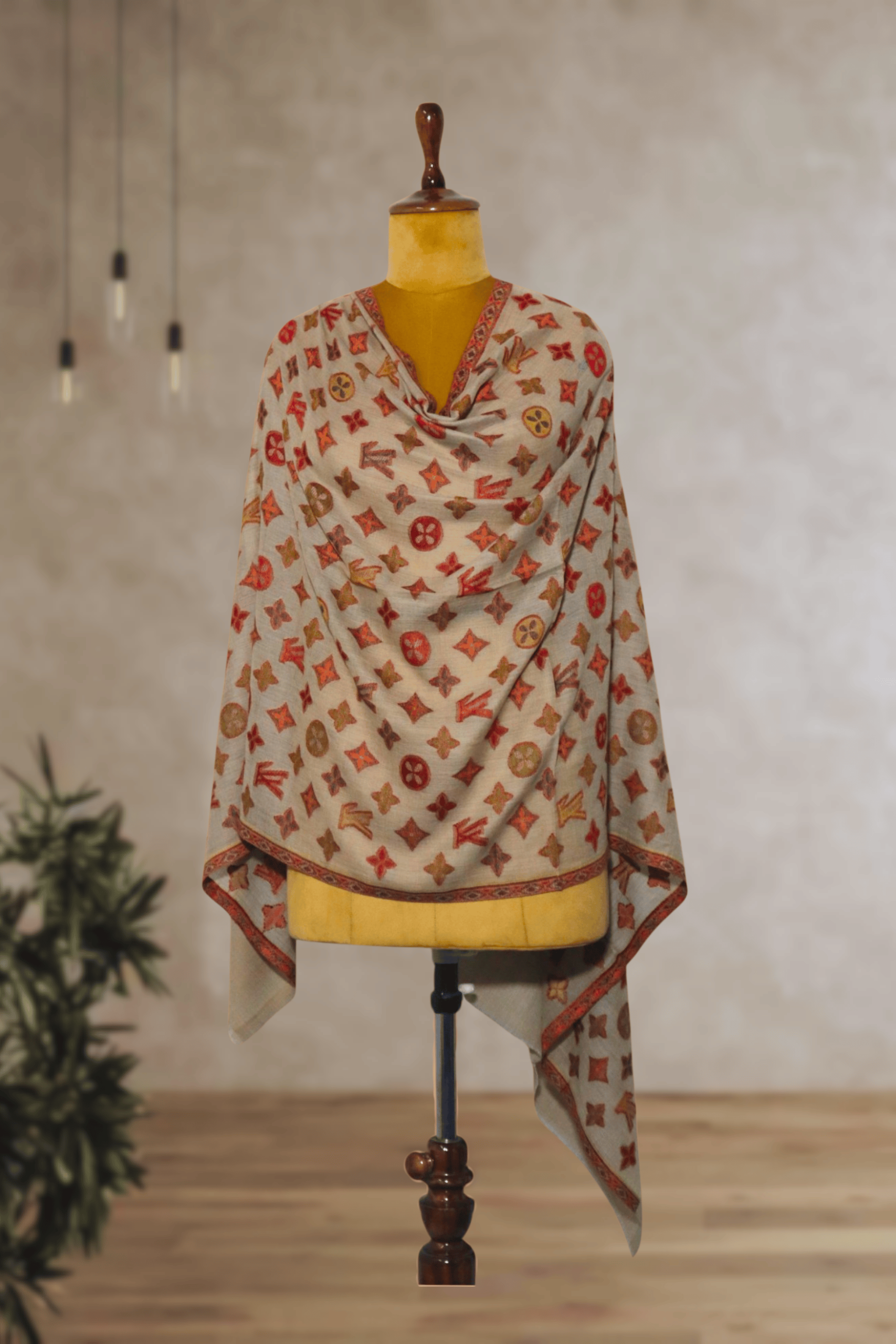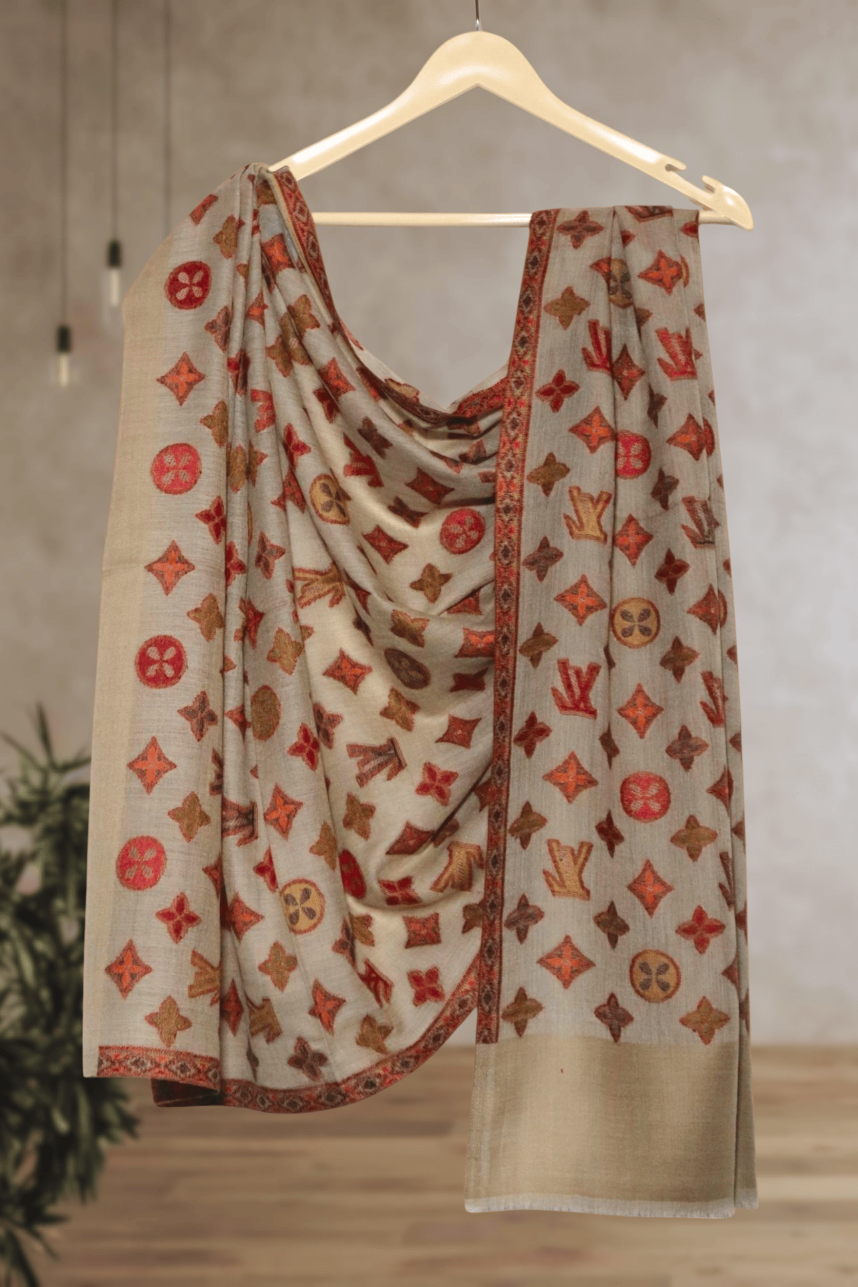 - Description: This contemporary Beige LV-Inspired Design Kani Weave Stole offers a modern take on traditional weaving. The soft beige Semi pashmina base is intricately woven with a repeating pattern of stylized motifs in shades of brown, orange, and red, reminiscent of a famous luxury brand’s iconic symbols. The subtle border provides a cohesive finish, blending classic craftsmanship with a fashionable edge. This lightweight and warm stole is a chic accessory for those who appreciate unique design.