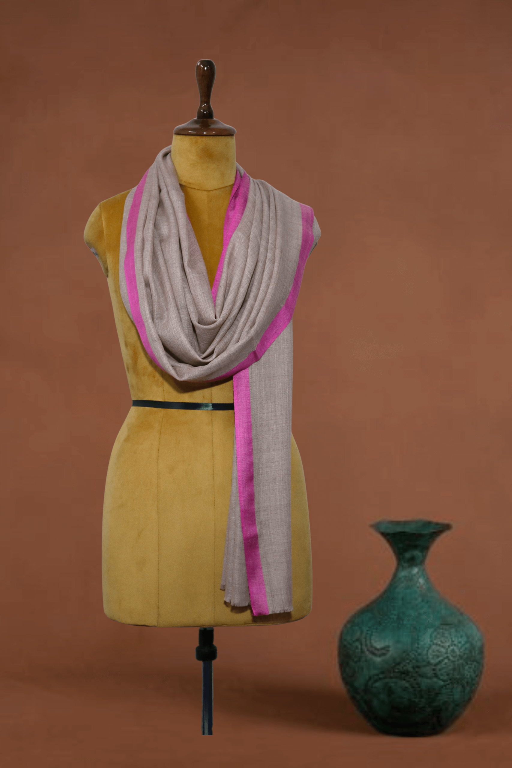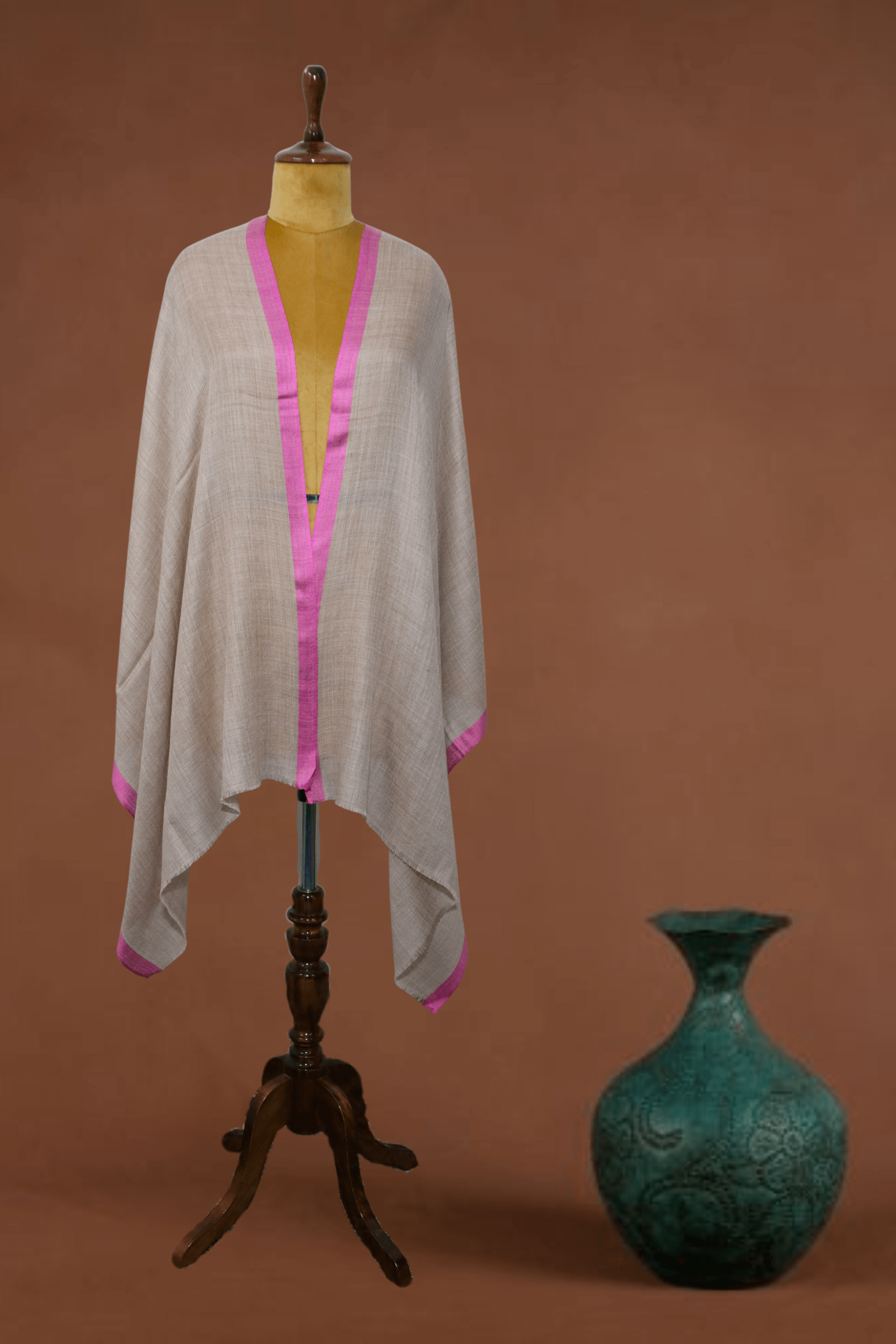 Brighten your wardrobe with this chic hand-woven stole, featuring a soft Pale Beige/Light Taupe body beautifully contrasted by a vibrant Hot Pink border along both long edges. Woven from premium Cashmere Fine Wool, this stole offers a beautiful combination of light warmth and luxurious texture. The striking, contemporary border design adds a lively and unexpected pop of color to the neutral body, making it a perfect accessory for adding a fashionable twist to both casual and dressy outfits.