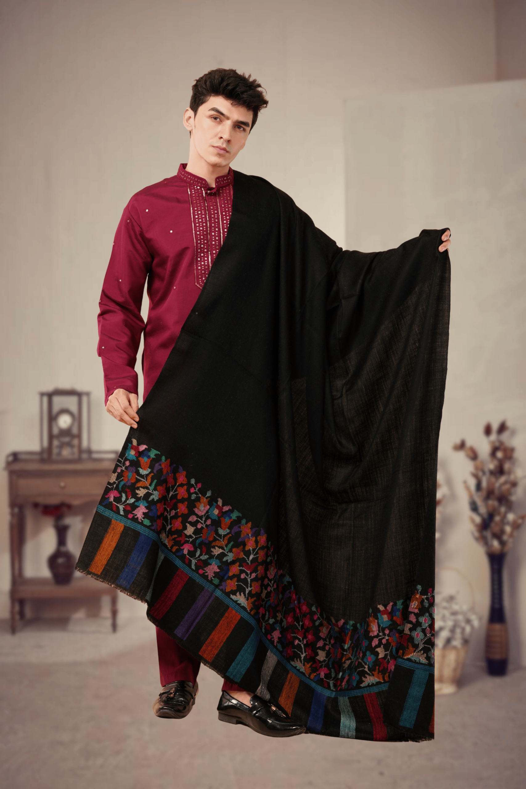 Description: Elevate your traditional wardrobe with this exquisite Black Kani Palladaar Pure Pashmina Shawl for men. Crafted from the finest Pashmina wool, this shawl offers unparalleled warmth and a luxurious drape. Its defining feature is the stunningly detailed hand embroidery on the pallu, creating a “palla daar” effect with vibrant floral that burst forth in a spectrum of colors. The deep black body provides a striking backdrop, making this a sophisticated and statement-making accessory perfect for formal occasions or adding a touch of grandeur to any ensemble.