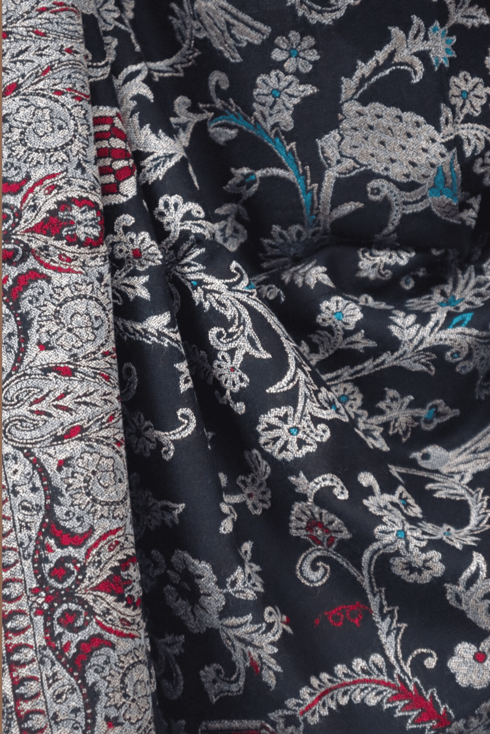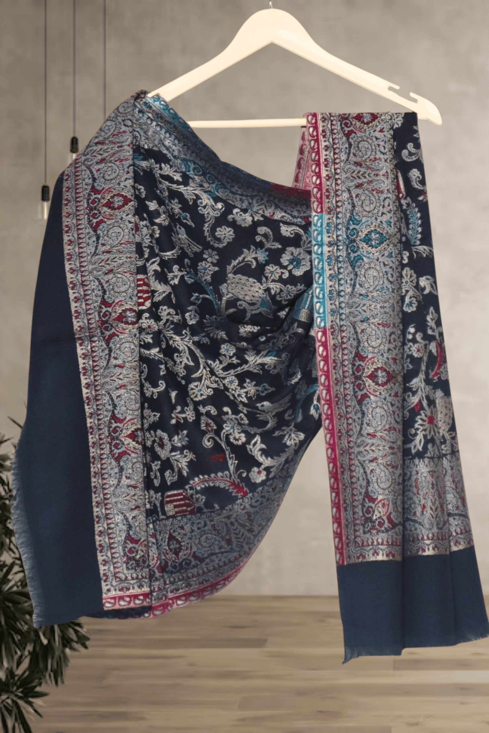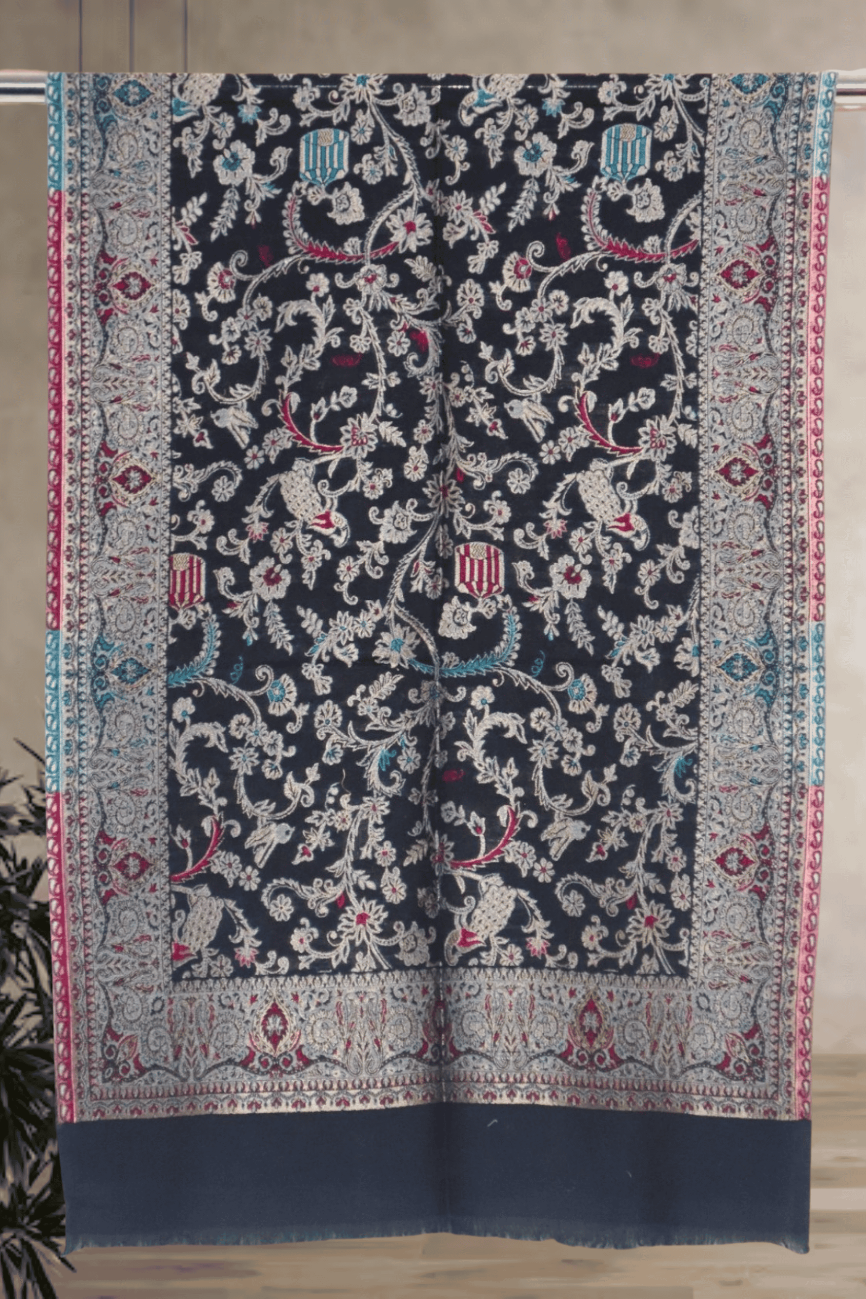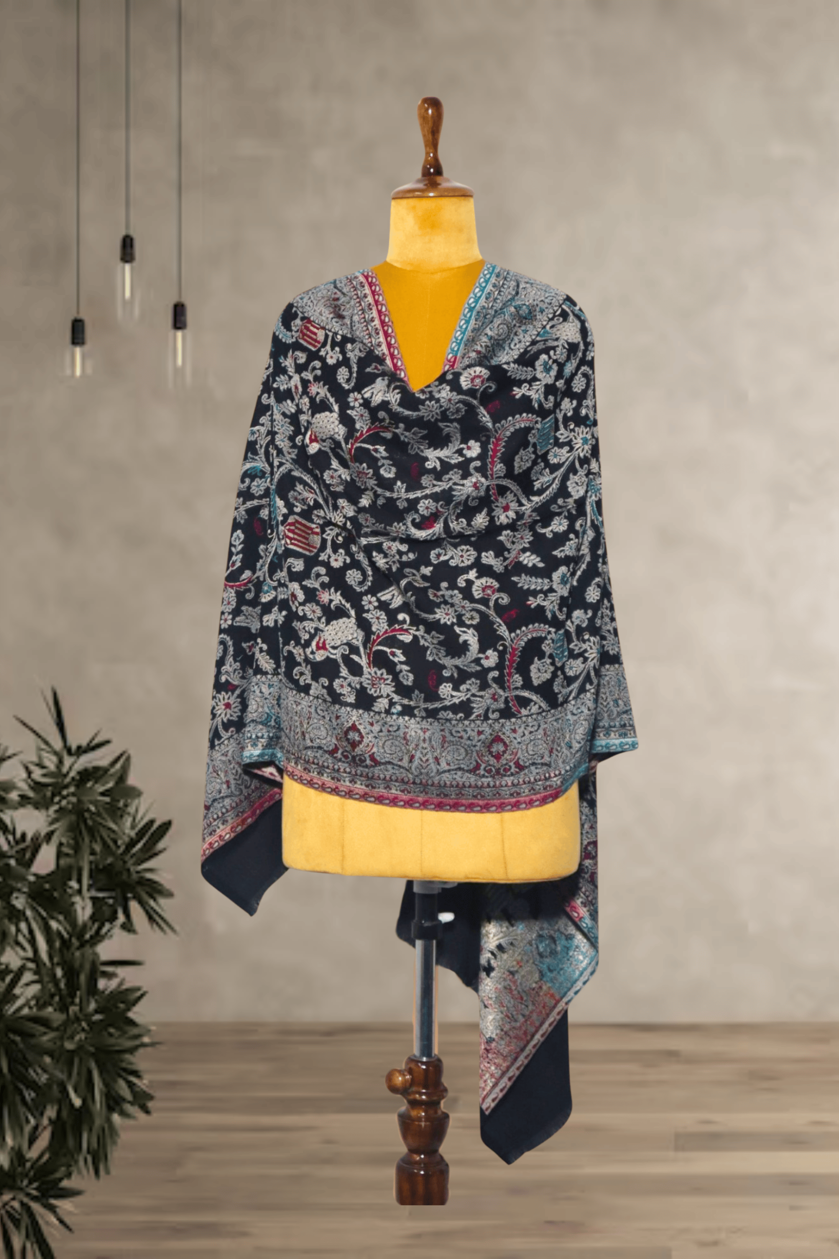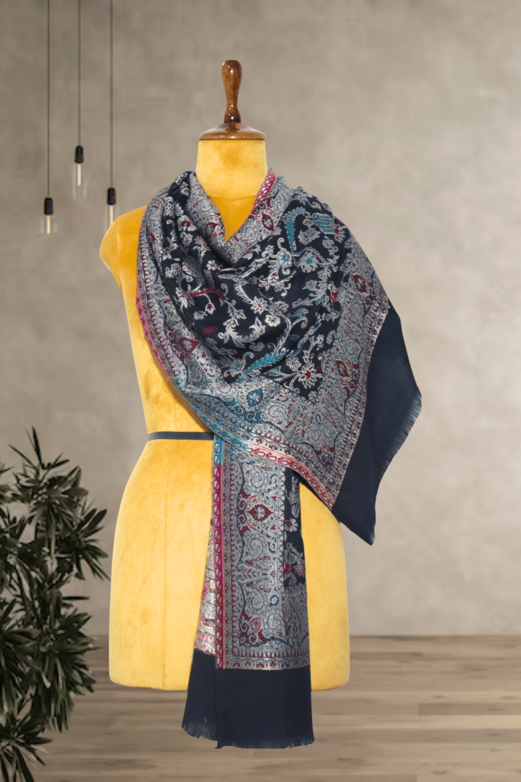 - Description: This captivating Black Zari Kani Jama Stole is a fusion of rich tradition and shimmering elegance. Crafted from fine wool, the deep black base provides a dramatic backdrop for the intricate Kani weaving, which is further enhanced with sparkling zari threads. The stole features a dense pattern of traditional floral and paisley motifs throughout the body, with a prominent border showcasing more elaborate designs in various colors including grey, pink, and blue, all highlighted with zari. This luxurious stole is perfect for adding grandeur and warmth to any attire.
