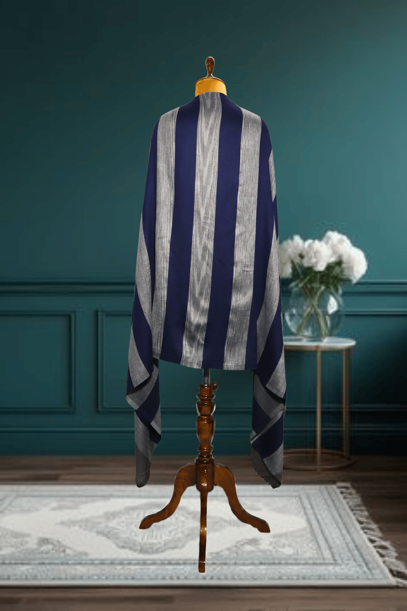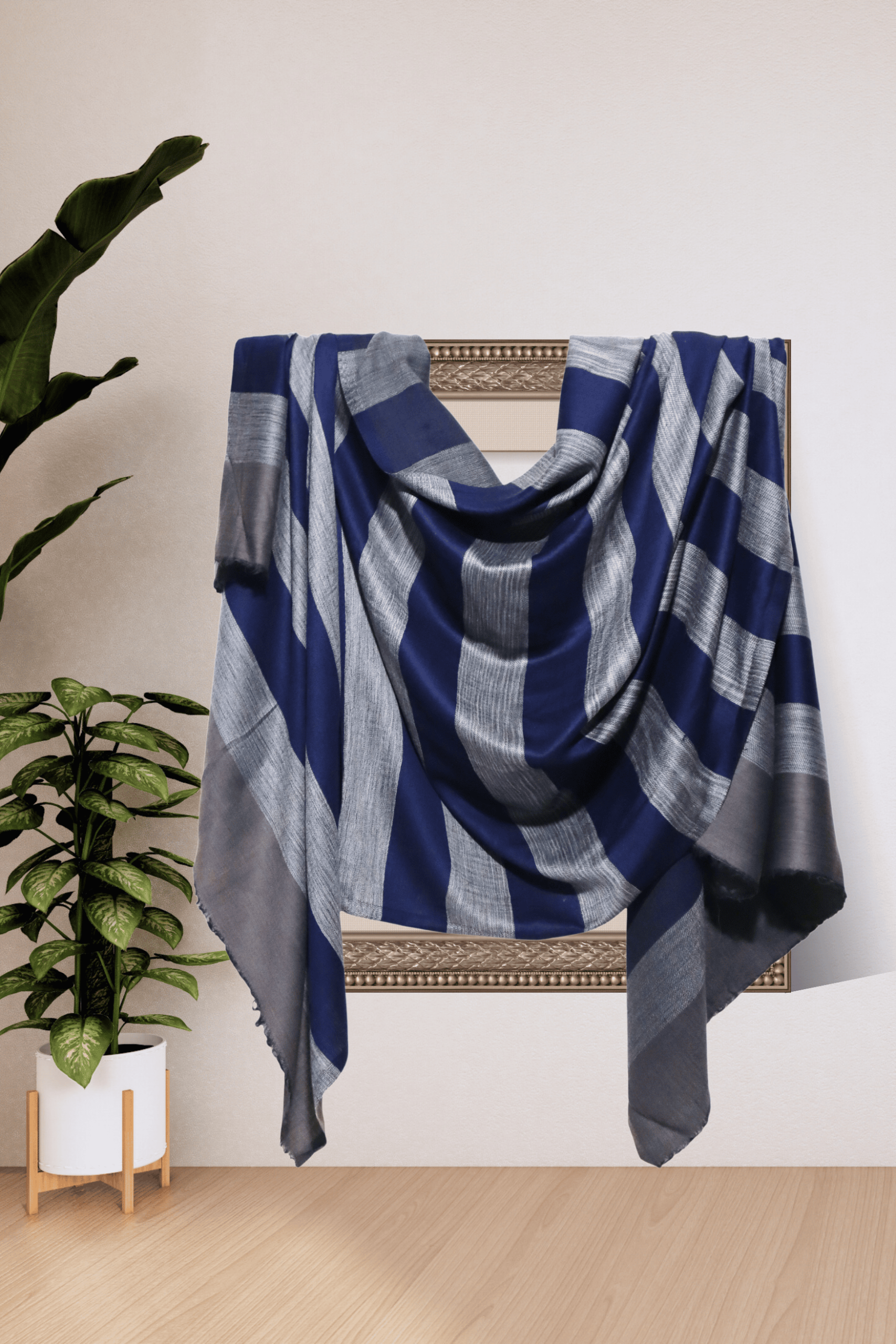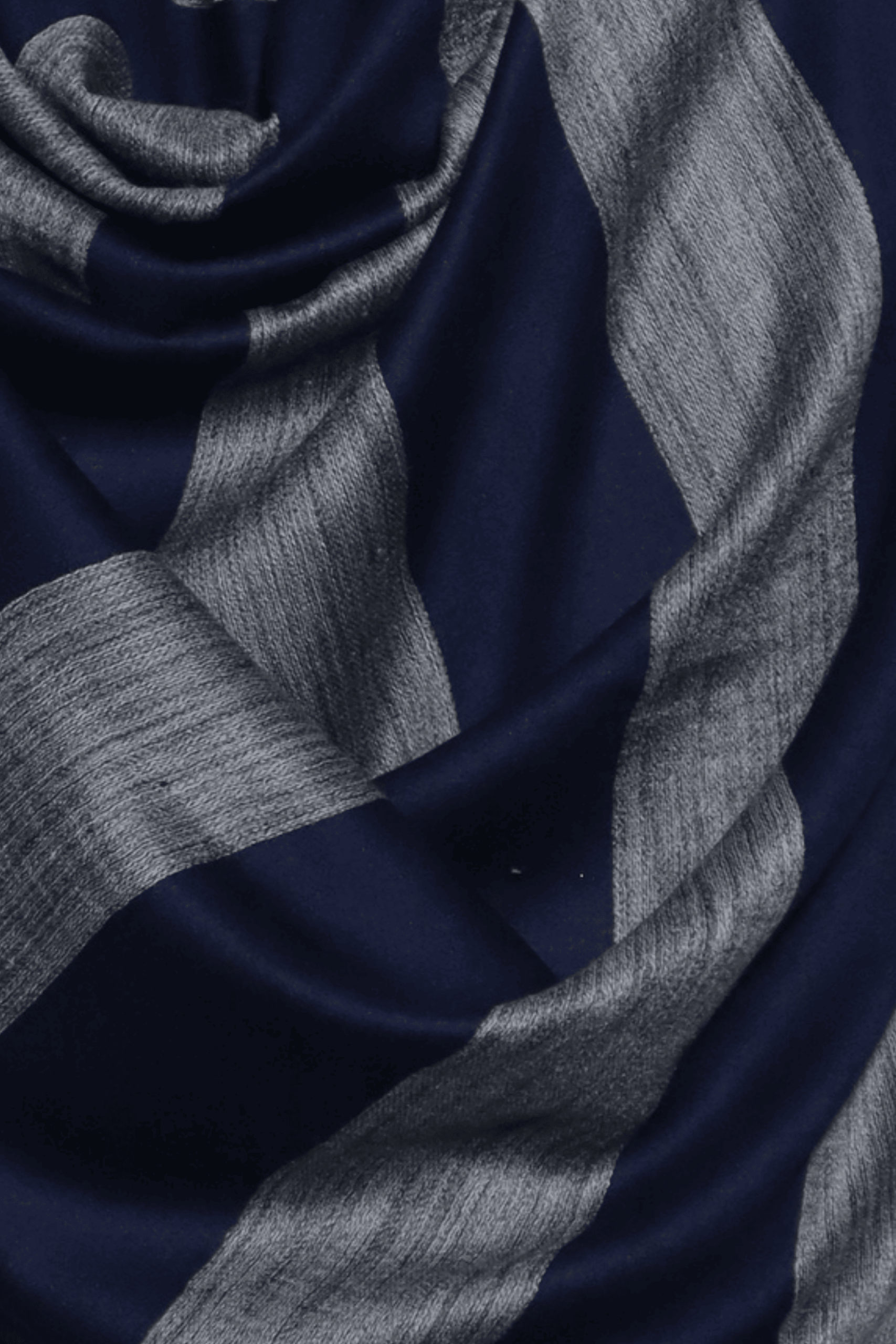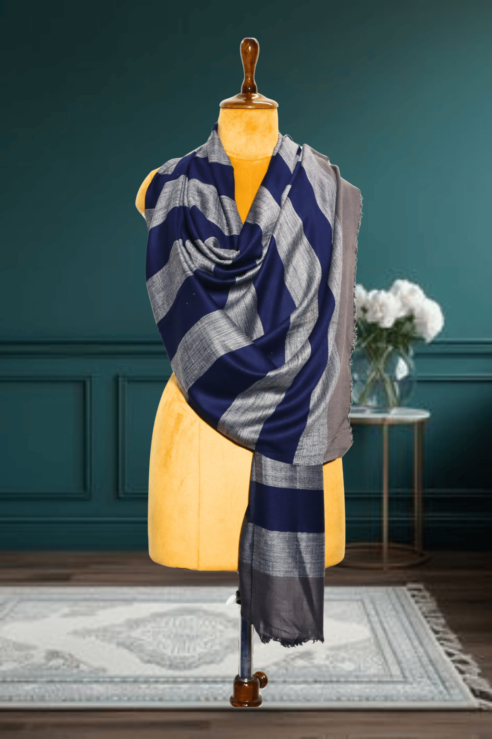 Cashmere Fine Wool Bold Striped Shawl in Navy Blue and Silver-Gray