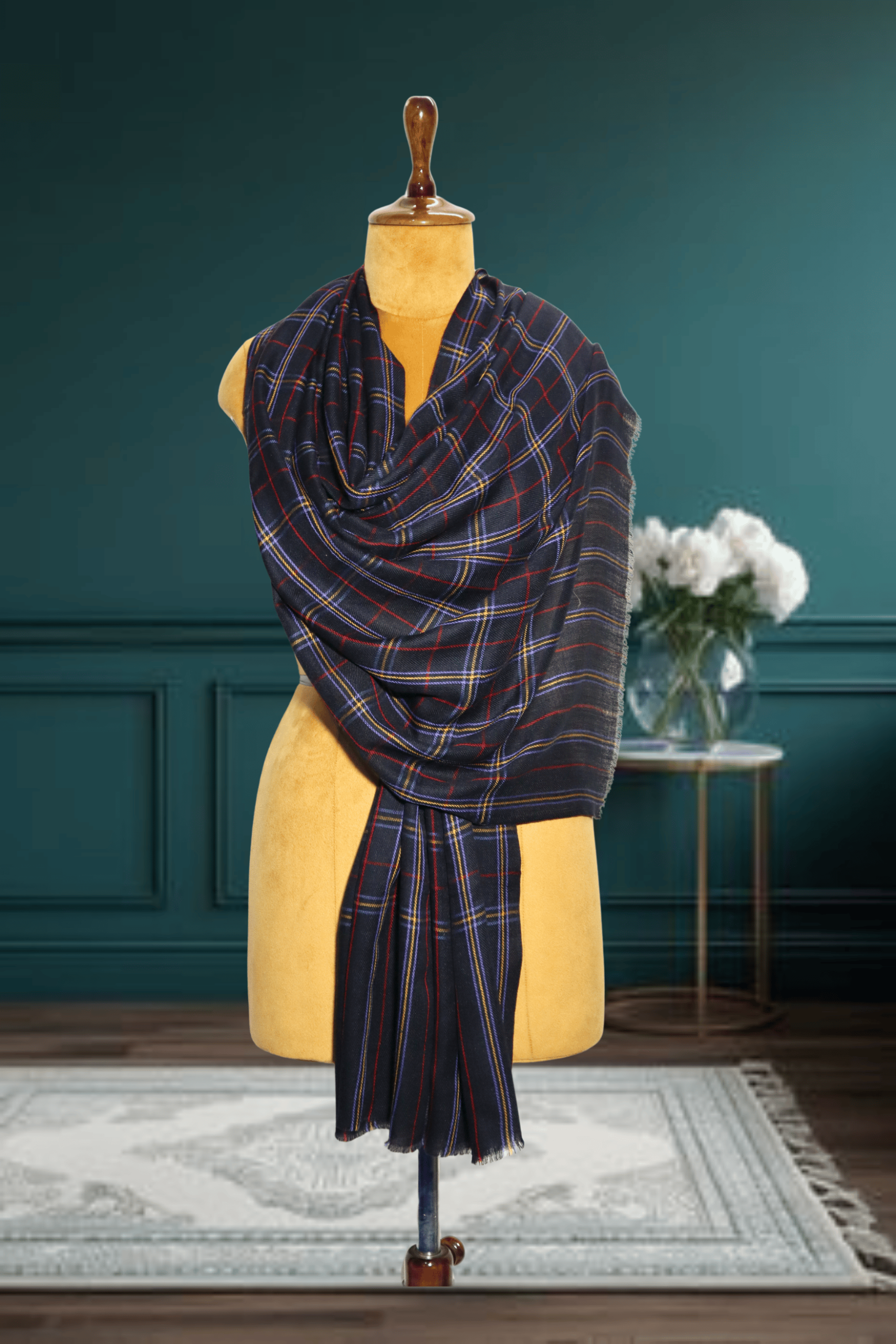 The superior feel of the cashmere fine wool provides natural warmth without feeling heavy. The design features a dramatic dark base—likely deep navy or black—overlaid with an intricate tartan check pattern accented with fine lines of red and white/light blue. This high-contrast detailing gives the shawl a sophisticated, tailored appearance. Handcrafted expertise is guaranteed, as this piece is manufactured by Ally’s Textiles.