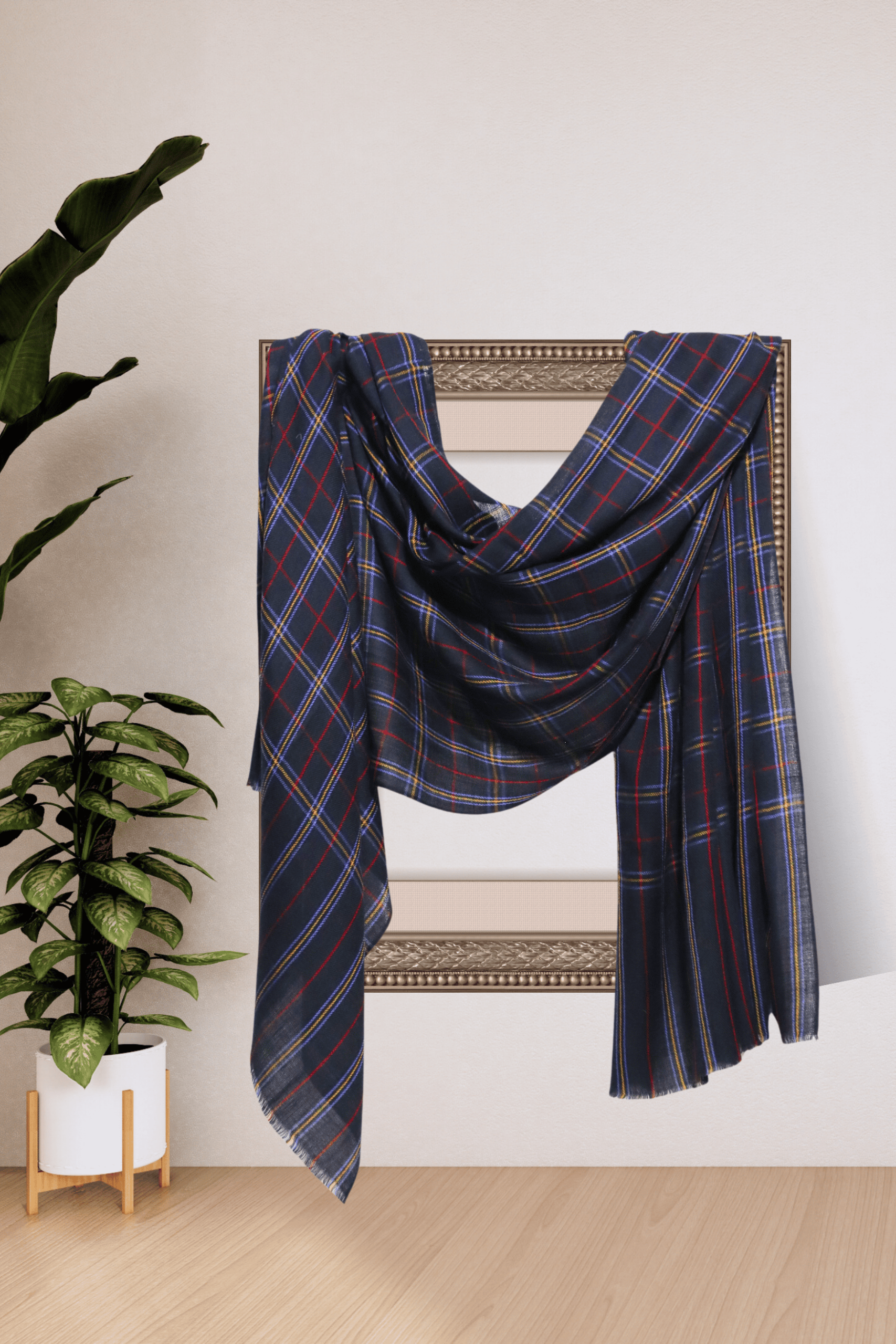 Cashmere Fine Wool Tartan Check Shawl in Deep Navy with Red Accent