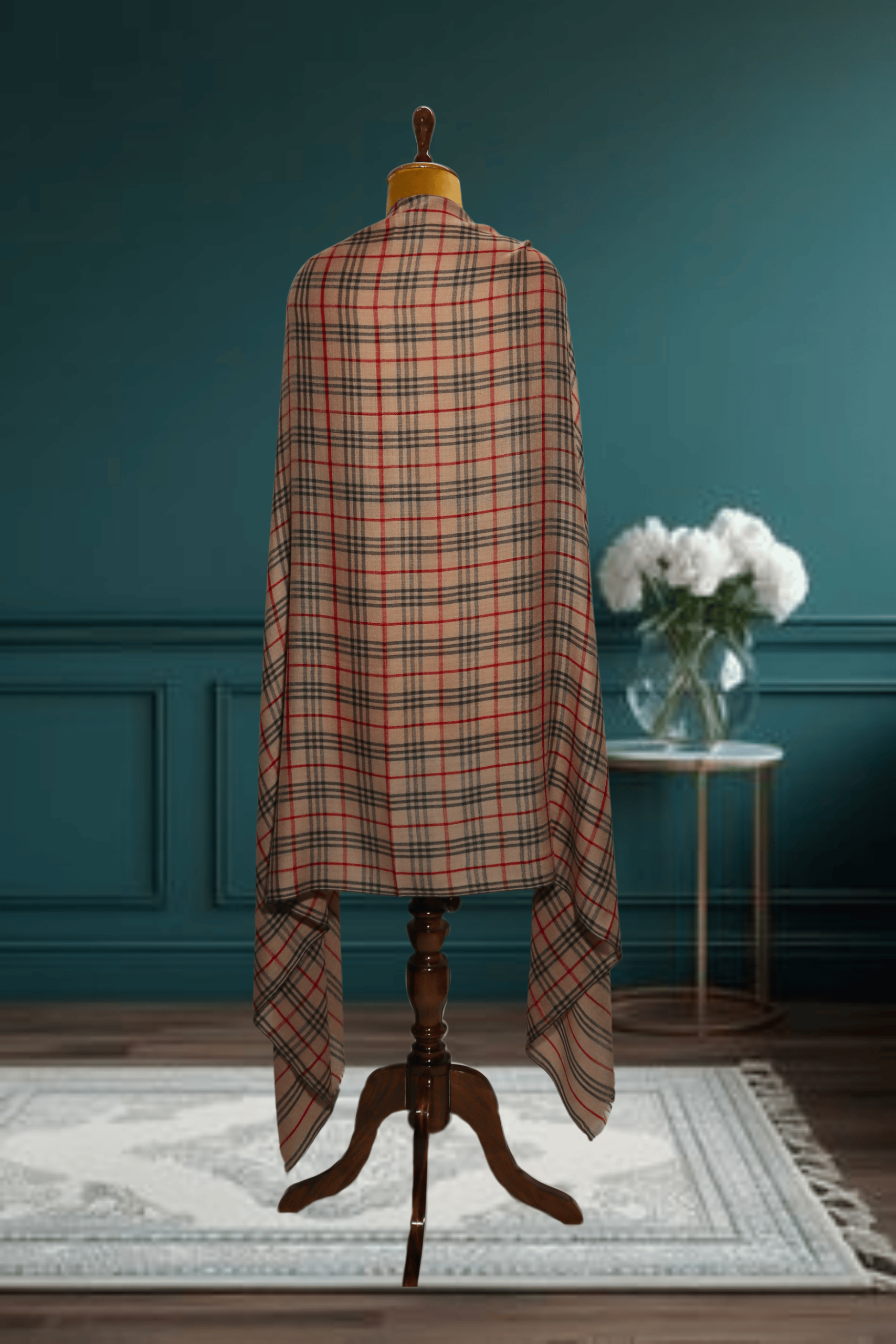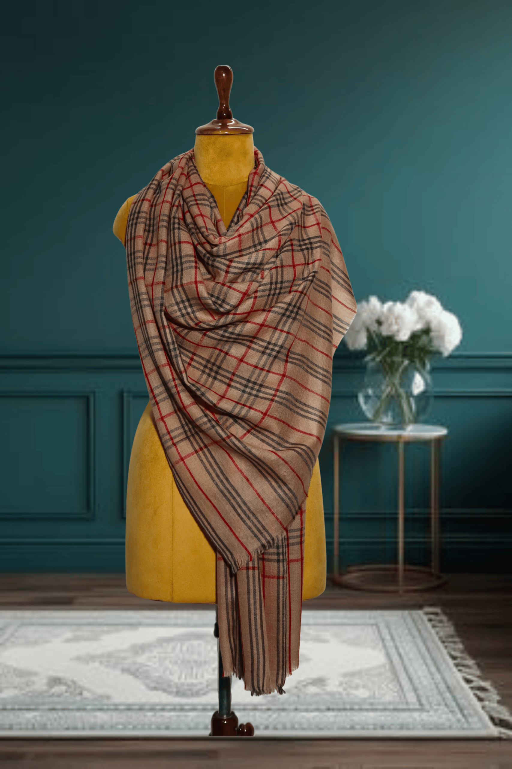 The premium cashmere fine wool material provides exceptional warmth and a soft hand-feel while maintaining a lightweight and graceful drape. The shawl showcases an elegant, Heritage Check/Tartan Plaid pattern on a versatile Beige/Light Tan base. The design is intricately detailed with precise intersecting lines of Black, Brown, and vibrant Red. This careful weaving ensures a rich texture and lasting quality. Quality and superior finish are guaranteed, as this piece is expertly manufactured by Ally’s Textiles.