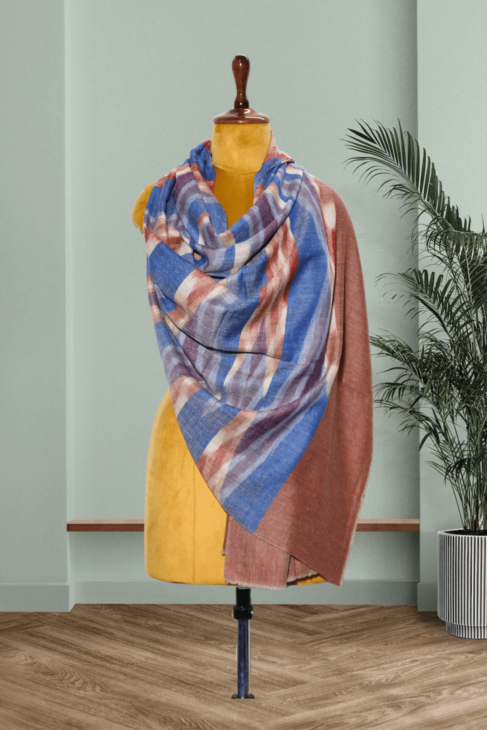 Coastal Blue & Terracotta Pure Pashmina Ikkat Shawl