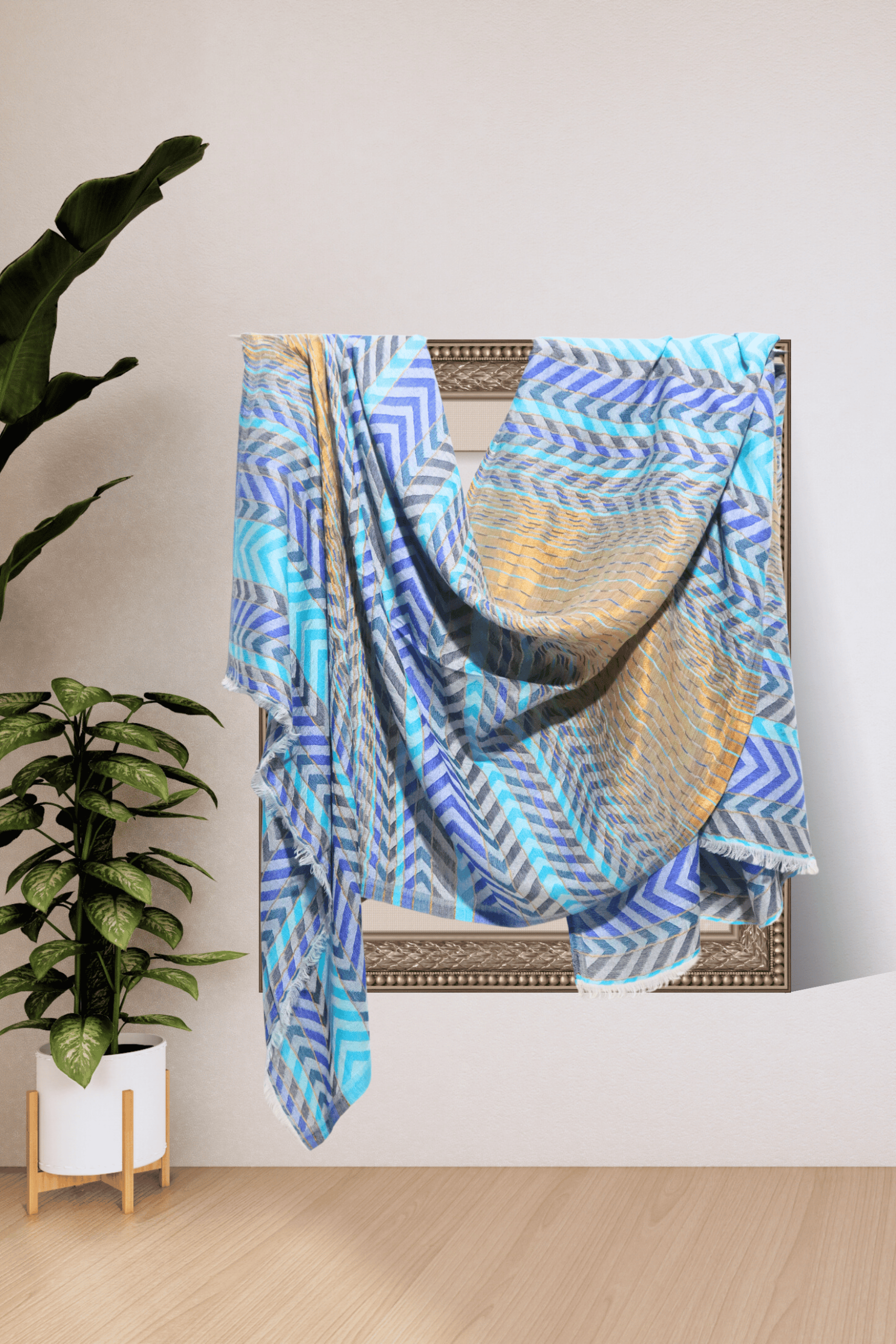 Make a bold statement with this modern Zari Stole. Expertly hand weaved from soft Cashmere Fine Wool, this stole is lightweight, exceptionally warm, and drapes beautifully. The design features a dynamic, all-over Chevron (Zig-Zag) pattern in cool tones of Royal Blue, turquoise, and gray, highlighted by shimmering Zari threads that give the fabric a subtle golden sheen. This contemporary piece from Kashmir perfectly blends traditional weaving techniques with a modern aesthetic, making it an eye-catching and versatile accessory for any season.