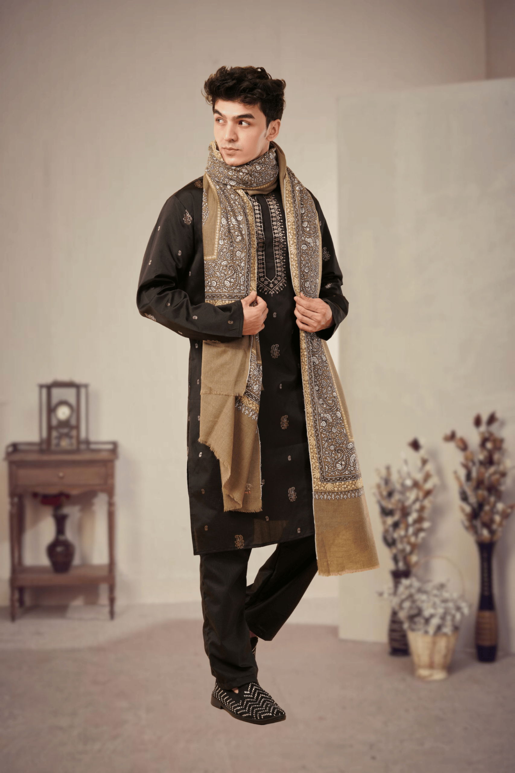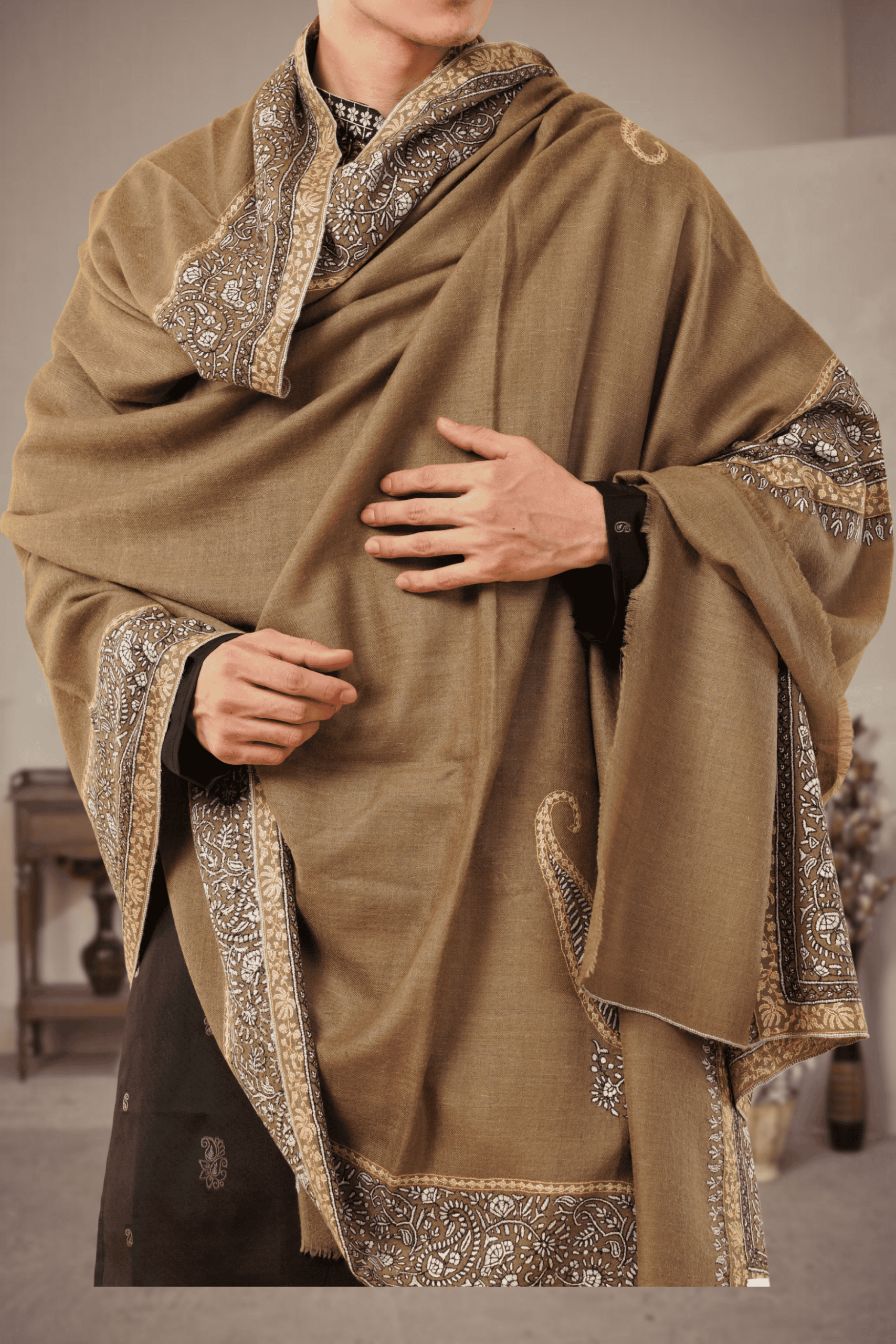 Design: This men’s shawl features exquisite reversible sozni hand embroidery along its borders and ends. The intricate paisley and floral motifs, woven with fine threads, are meticulously crafted to be visible and equally beautiful on both sides of the shawl, allowing for versatile styling.