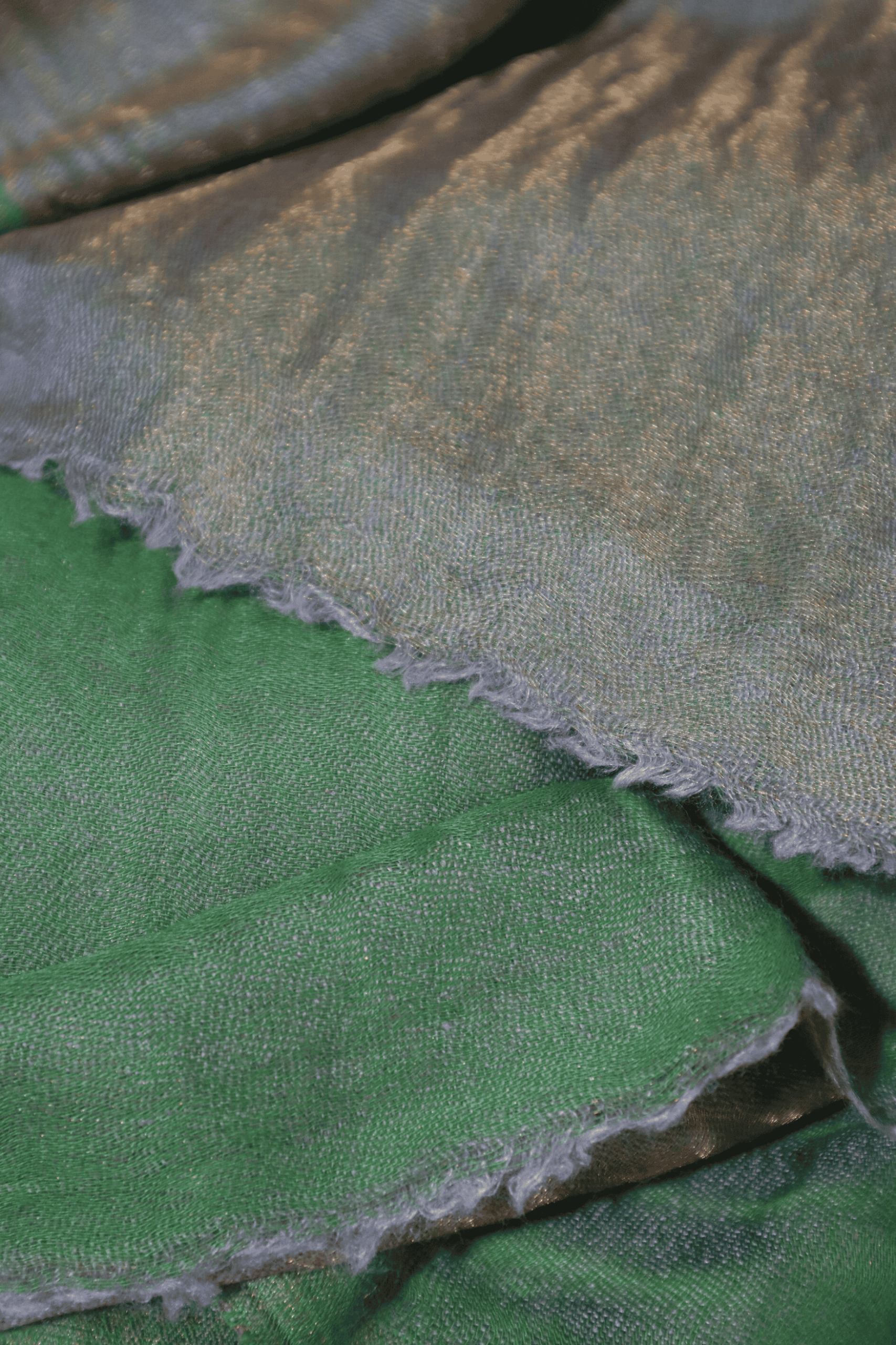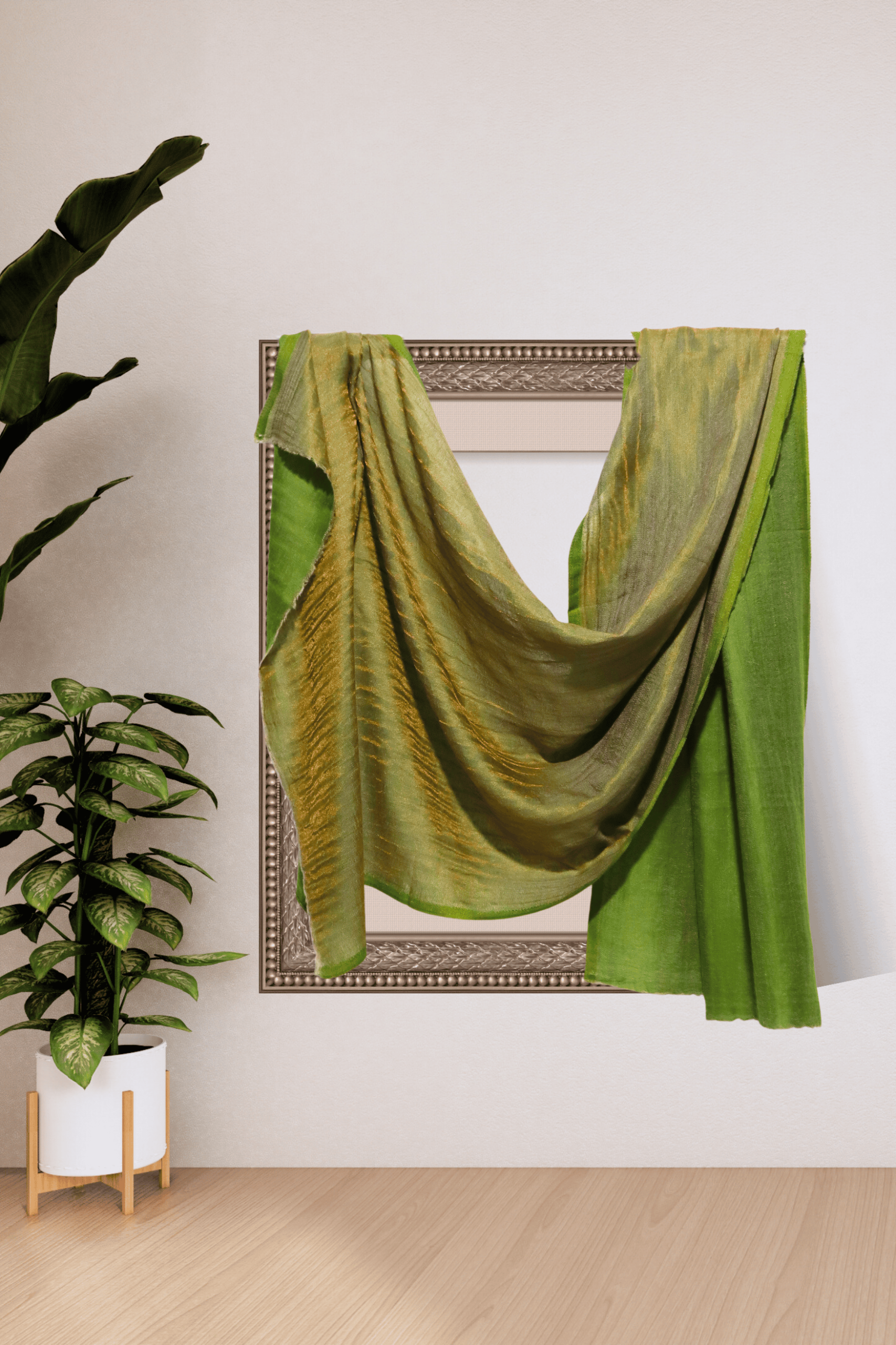 Wrap yourself in the rich, organic beauty of this stunning Reversible Zari Stole. Crafted using traditional Kashmiri hand weaving techniques from sumptuously soft Cashmere Fine Wool, it offers exceptional lightweight warmth. The unique reversible design features a beautiful dual-tone look: one side showcases an iridescent Olive Green or gold-tinged hue, created by interwoven Zari threads, while the reverse displays a solid, deep Forest Green or vibrant lime green. The captivating metallic shimmer contrasts beautifully with the rich green base, making this accessory versatile for both day and formal evening wear and a true testament to fine Kashmiri craftsmanship.