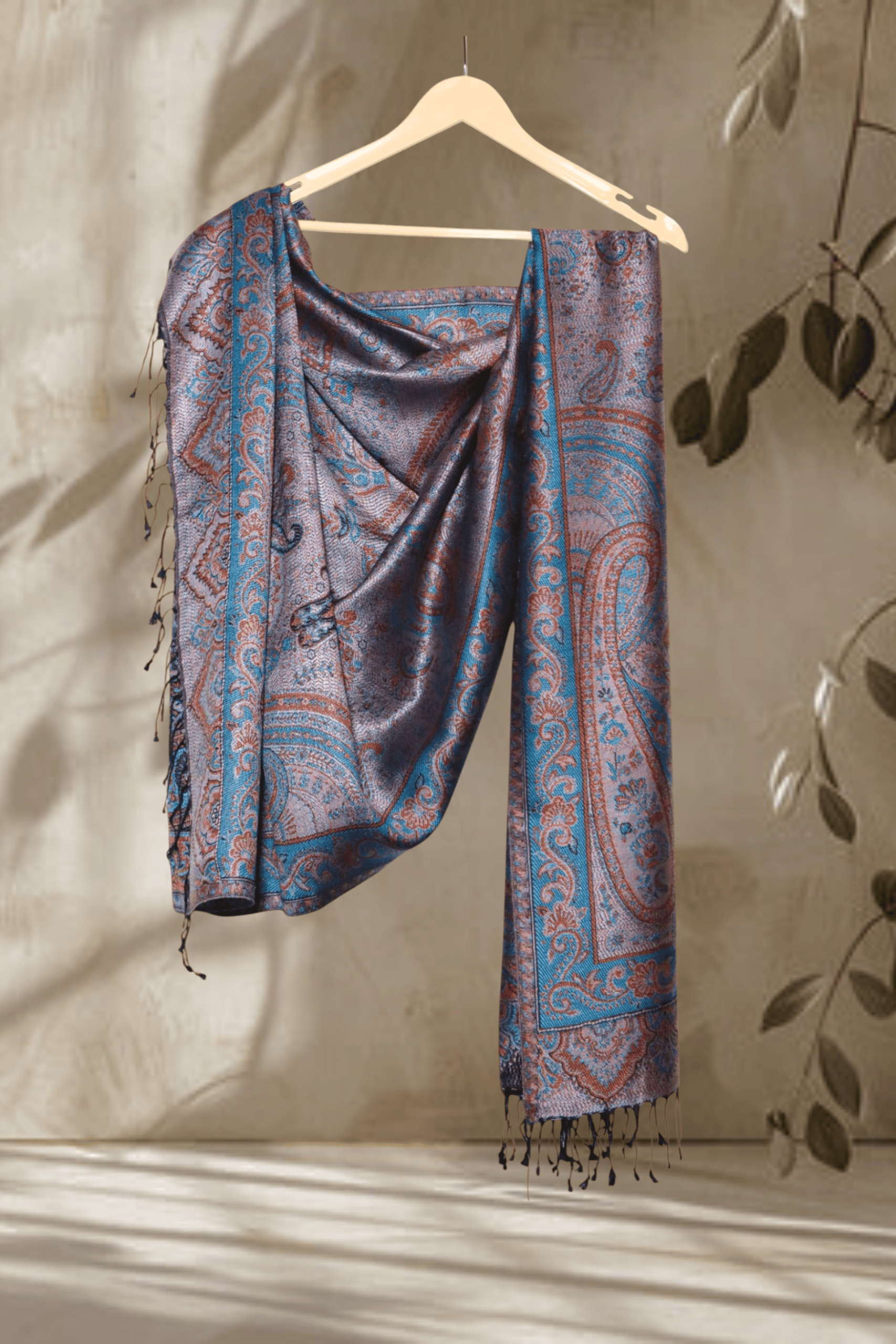 This exquisite Pure Silk Jamawar stole is a masterpiece of traditional Kashmiri craftsmanship. Adorned with a rich, all-over paisley (buta) pattern, the intricate design features shades of deep grey-blue, complemented by subtle hints of teal and muted browns.