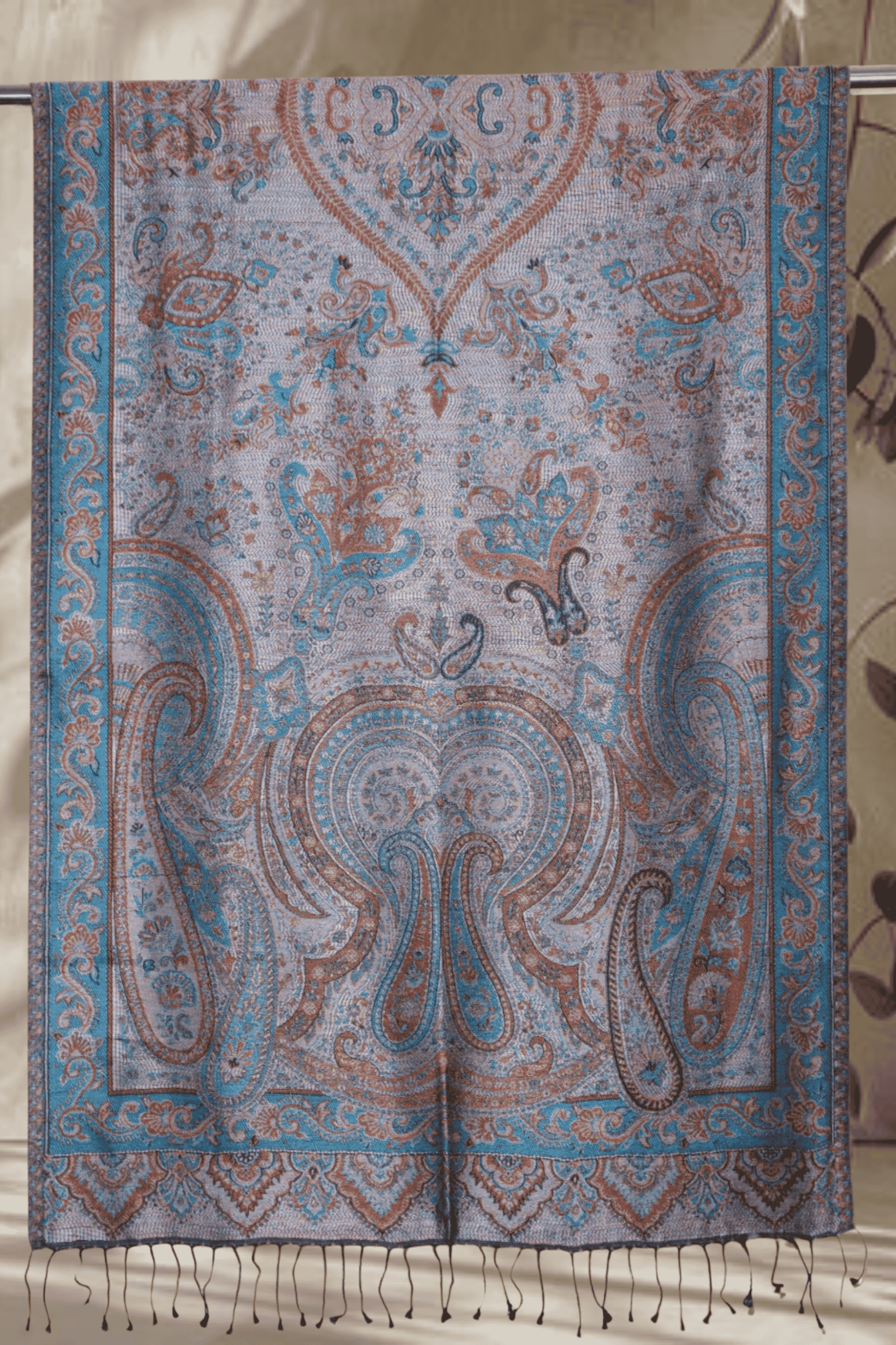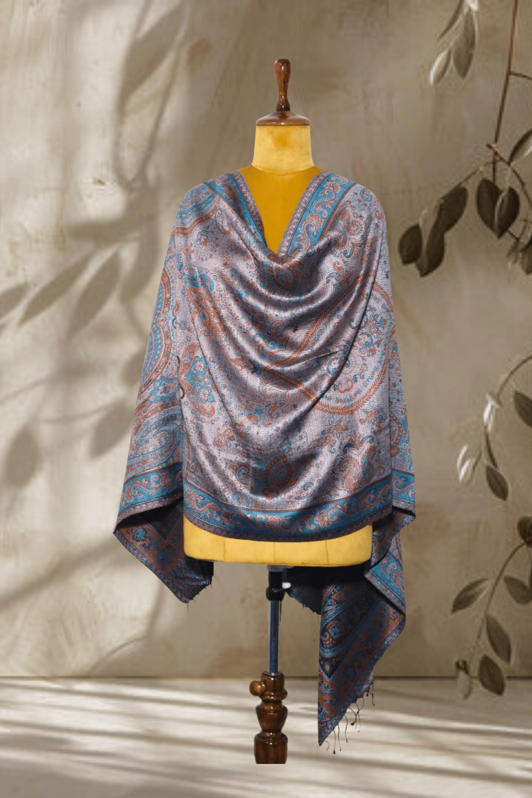 Grey-Blue Pure Silk Paisley Jamawar Stole