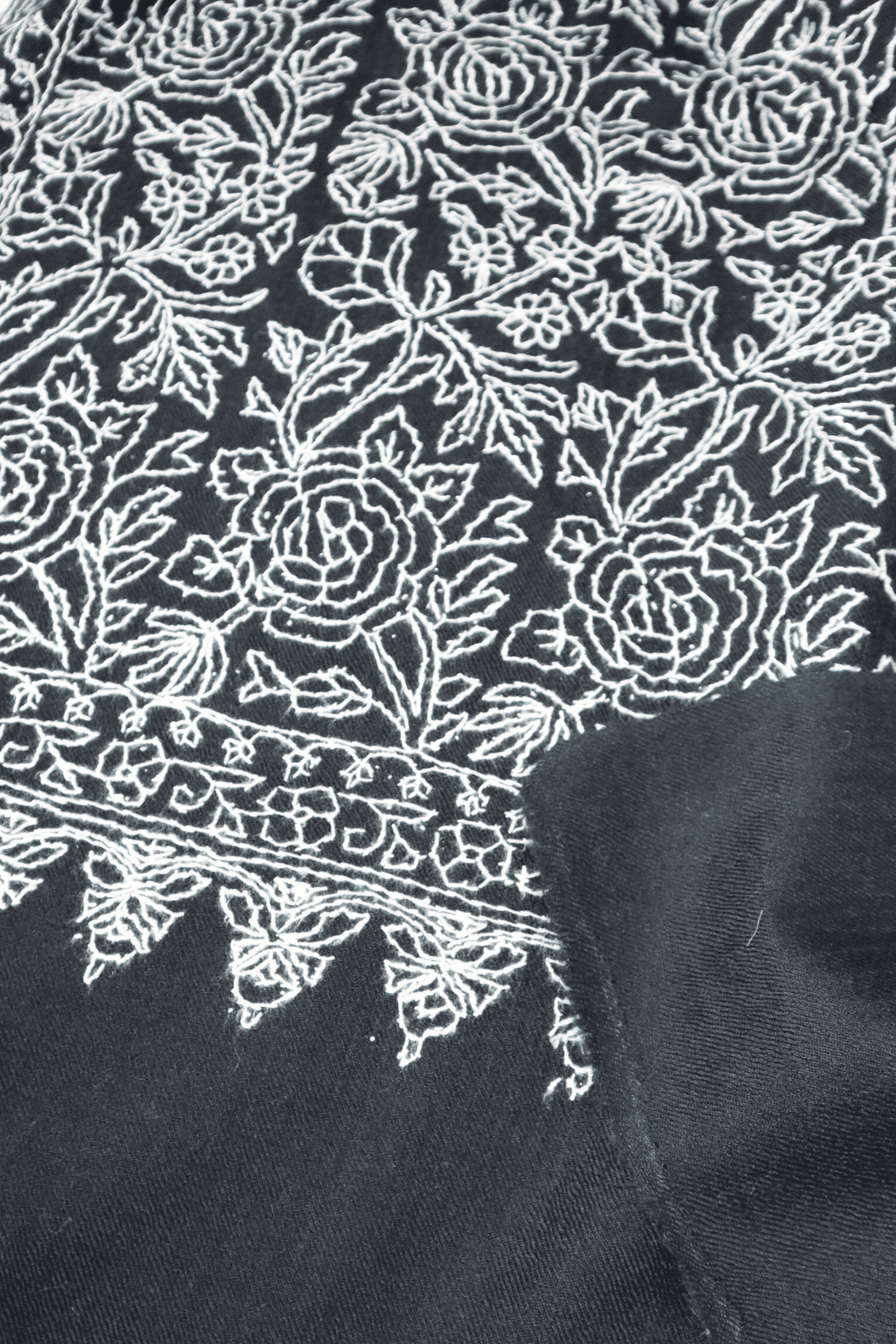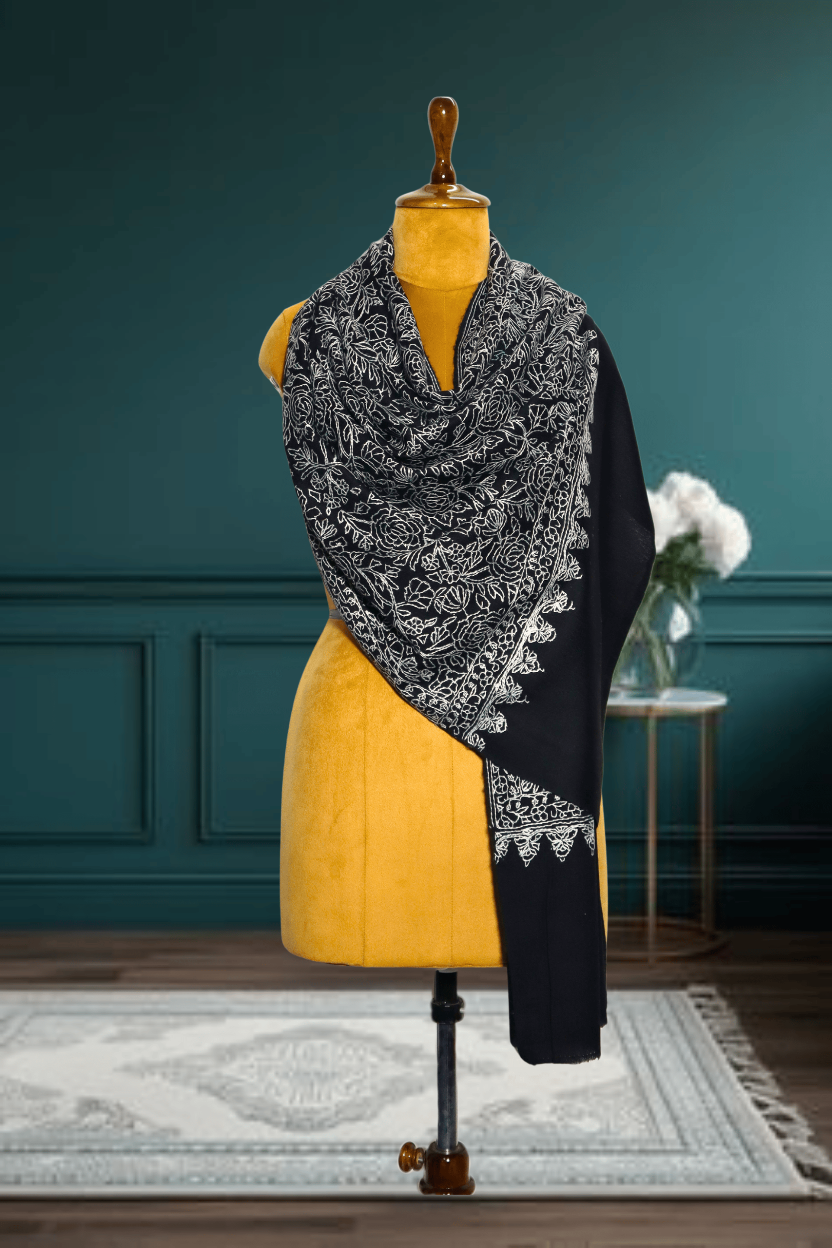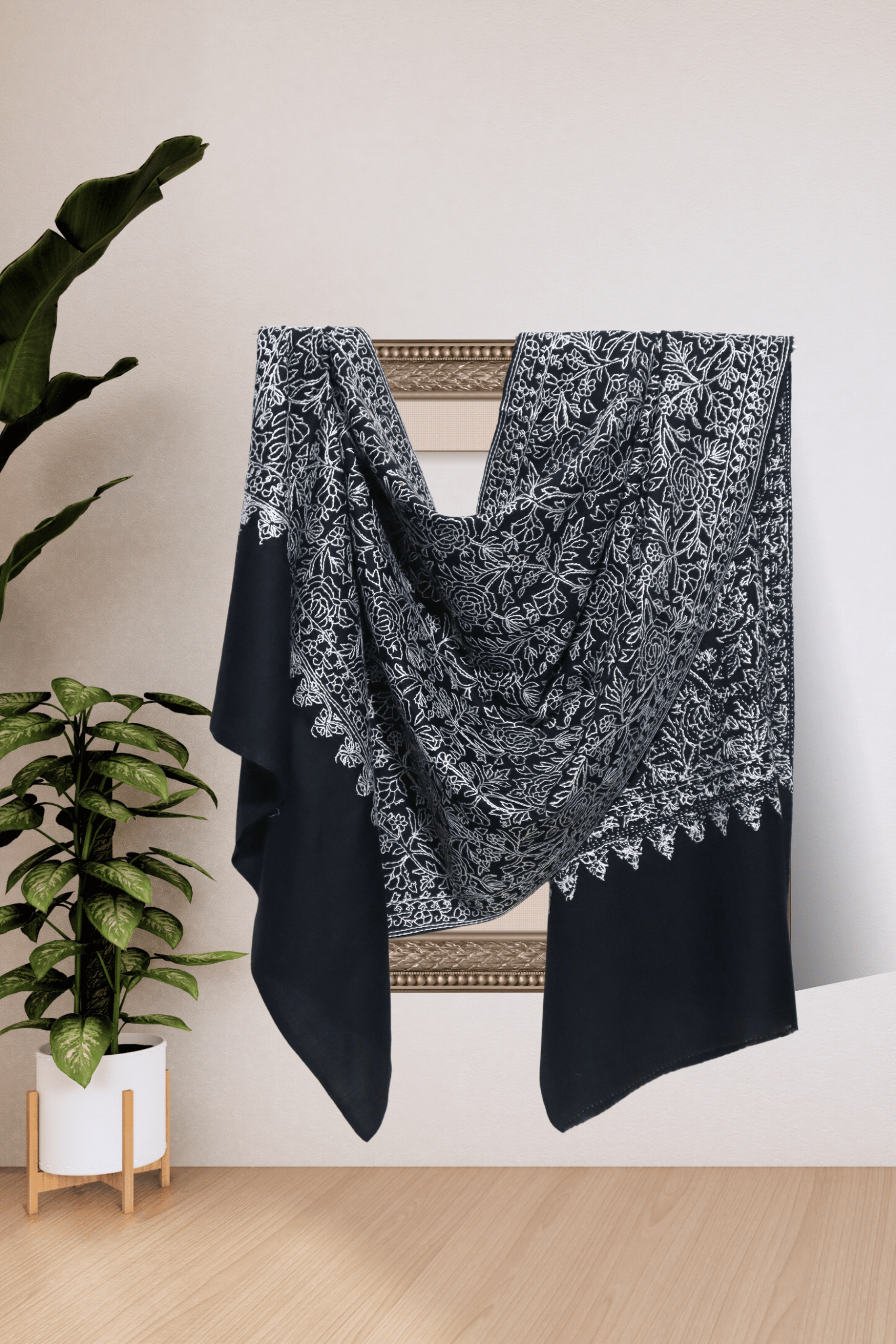 Make a striking statement with this stunning hand-embroidered semi-pashmina stole, featuring a timeless Black base with intricate White/Cream embroidery. The dramatic contrast highlights the dense, sophisticated floral and vine pattern that covers the majority of the fabric. This traditional Kashmiri needlework is meticulously hand-stitched by skilled artisans, offering a design that is both rich in detail and powerfully elegant. Crafted from a soft and warm semi-pashmina blend, this stole provides luxurious comfort while serving as the perfect, eye-catching accessory for formal occasions or sophisticated evening wear.
