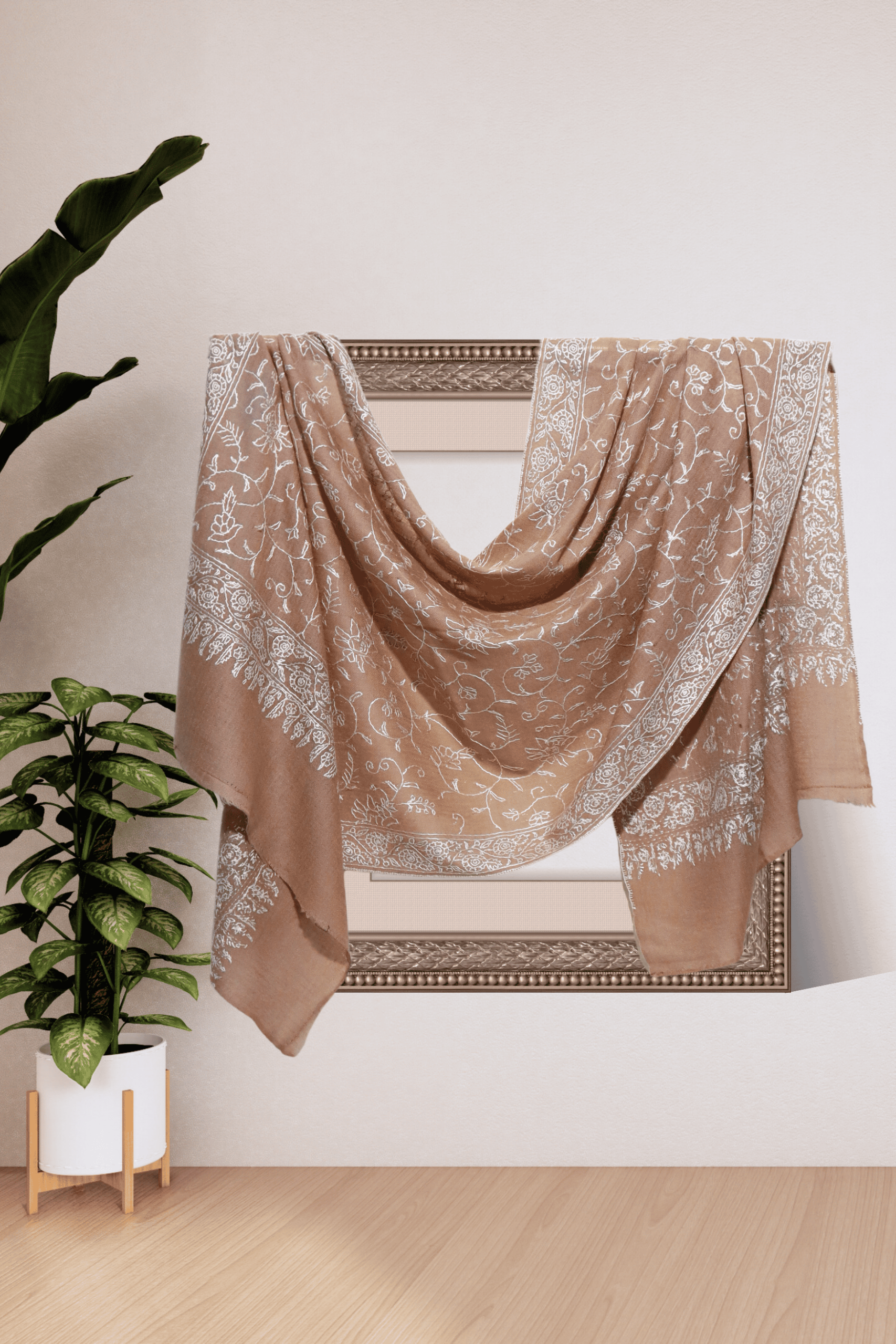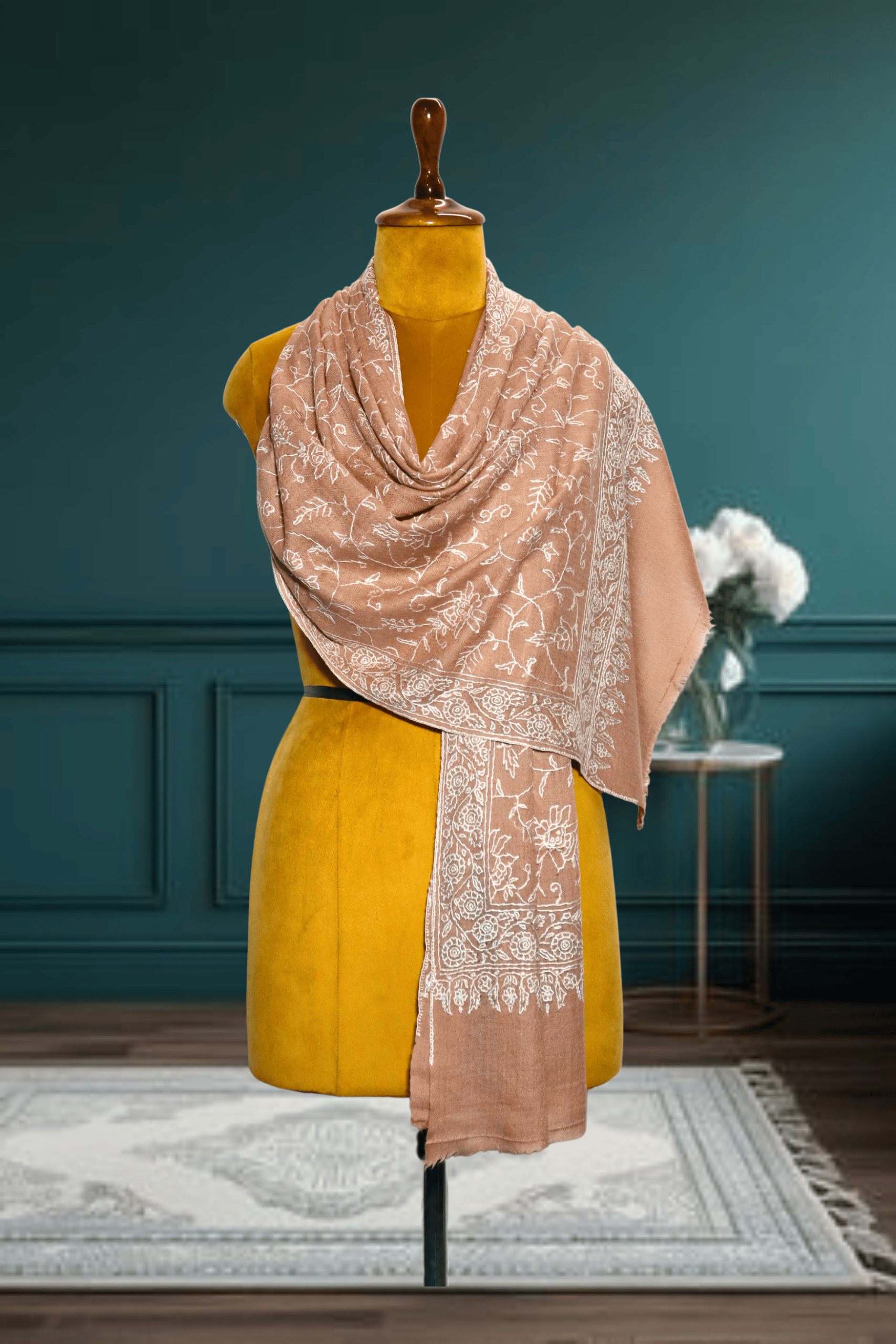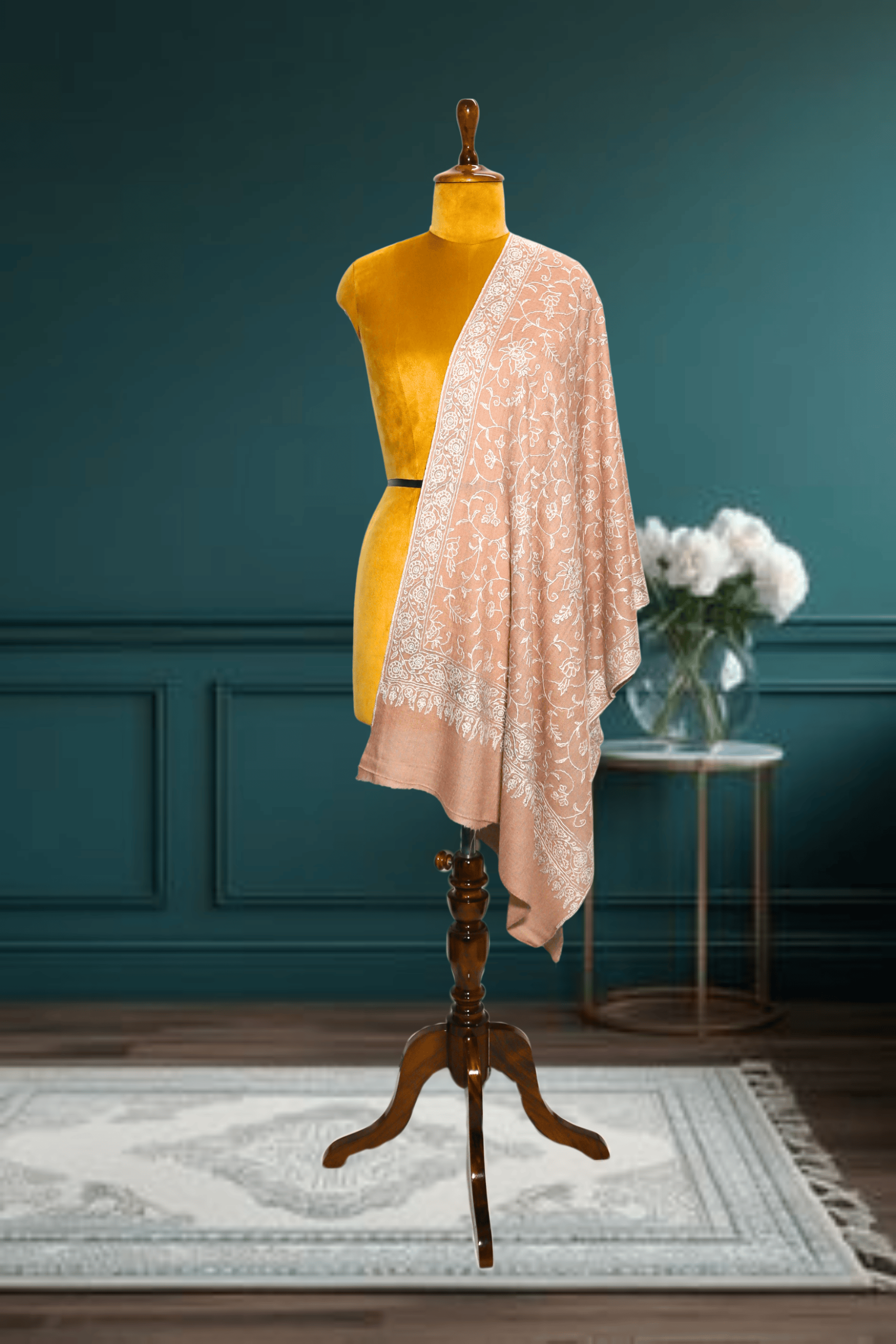 Adorn yourself with the delicate beauty of this hand-embroidered semi-pashmina stole, featuring a lovely Soft Peach base. The fabric is beautifully enhanced by contrasting White/Cream embroidery, which showcases an intricate, traditional floral and vine pattern. This meticulous needlework, a signature of revered Kashmiri craftsmanship, covers the body of the stole, leaving a clean, solid border at the ends. Crafted from a soft and comforting semi-pashmina blend, this piece offers lightweight warmth and a luxurious feel. It is a stunning accessory, perfect for adding a touch of feminine elegance and heritage style to any ensemble.