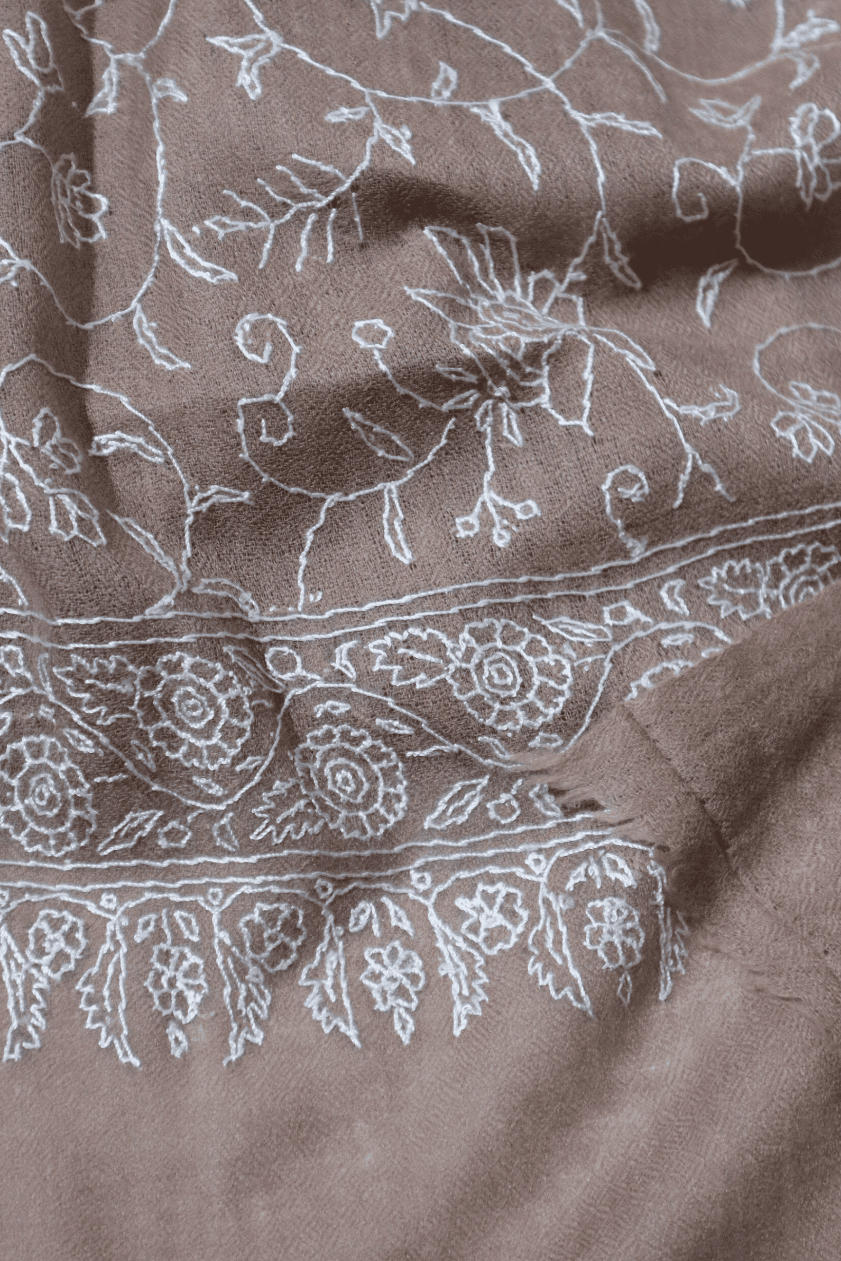 This meticulous needlework, a signature of revered Kashmiri craftsmanship, covers the body of the stole, leaving a clean, solid border at the ends. Crafted from a soft and comforting semi-pashmina.