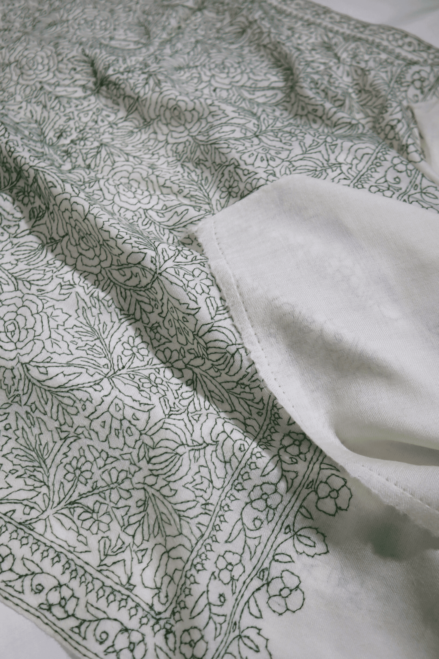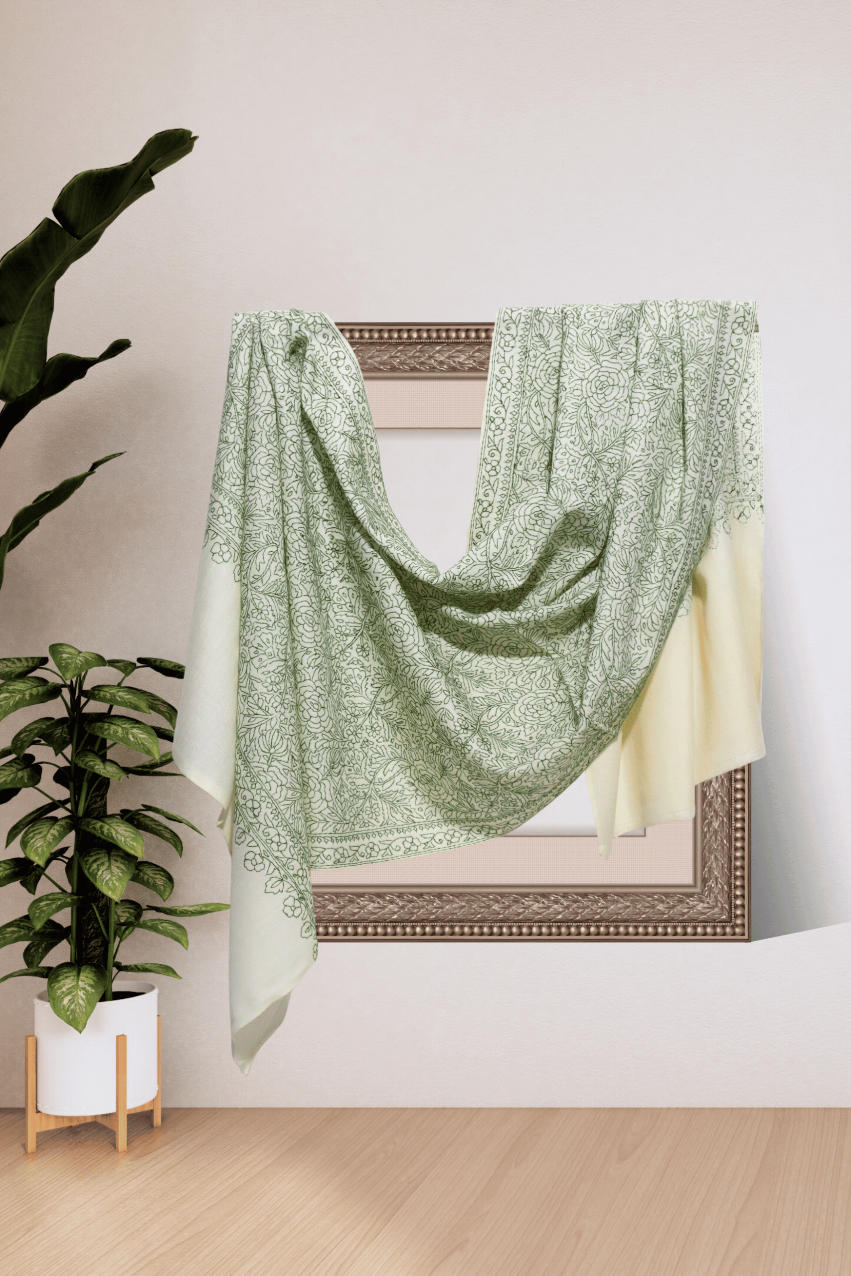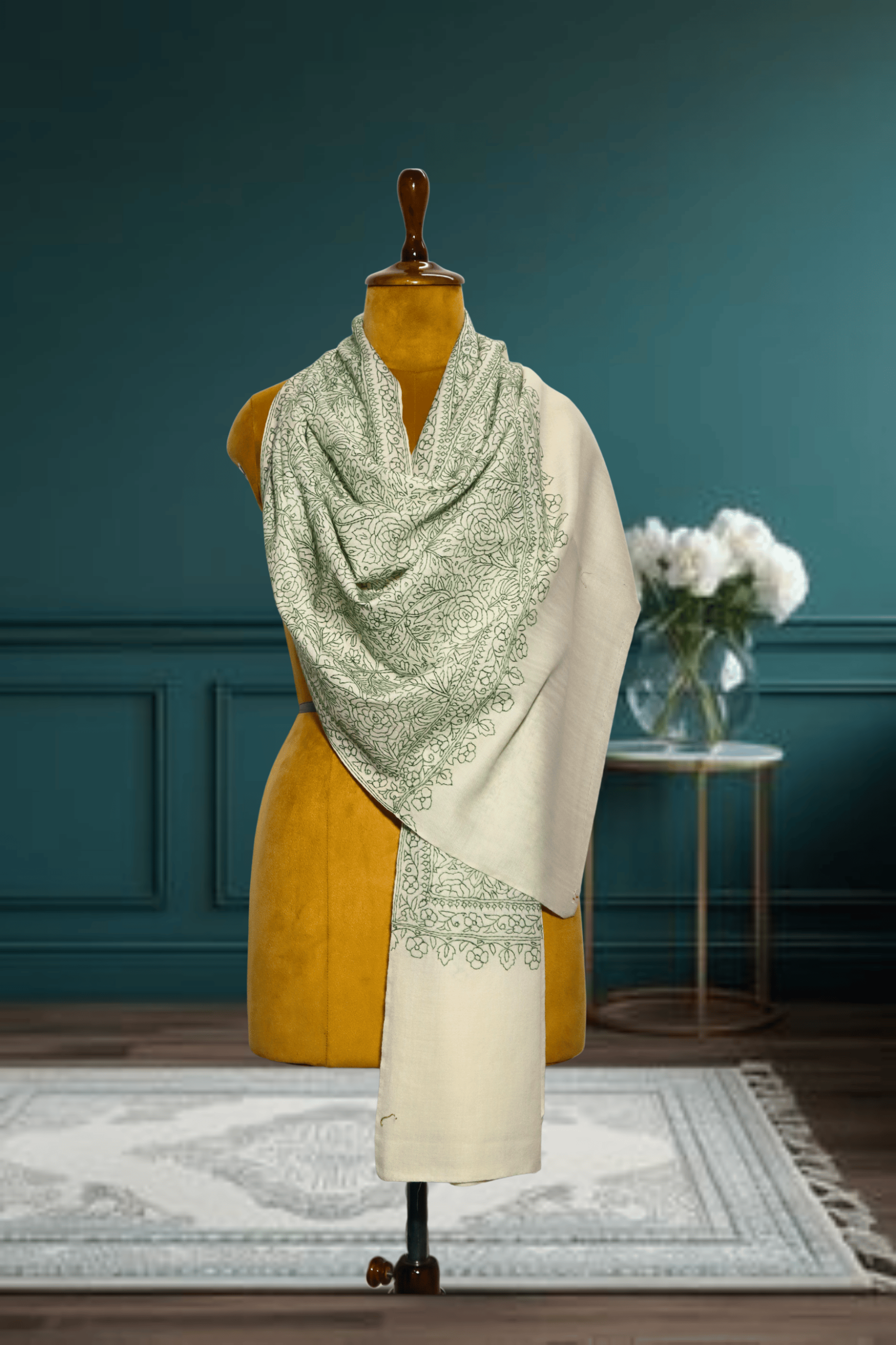 Drape yourself in the luxurious warmth and timeless artistry of this hand-embroidered semi-pashmina stole. Featuring intricate needlework in a soothing sage green hue against a soft, creamy off-white base, this piece is a testament to the revered craftsmanship of Kashmir. The delicate floral and vine pattern, known for its elegance, is meticulously applied by skilled artisans, making each stole a unique work of art. Lightweight yet incredibly warm, it is the perfect accessory to add a sophisticated layer of comfort and traditional beauty to any outfit, whether it’s for a formal event or a chilly evening.