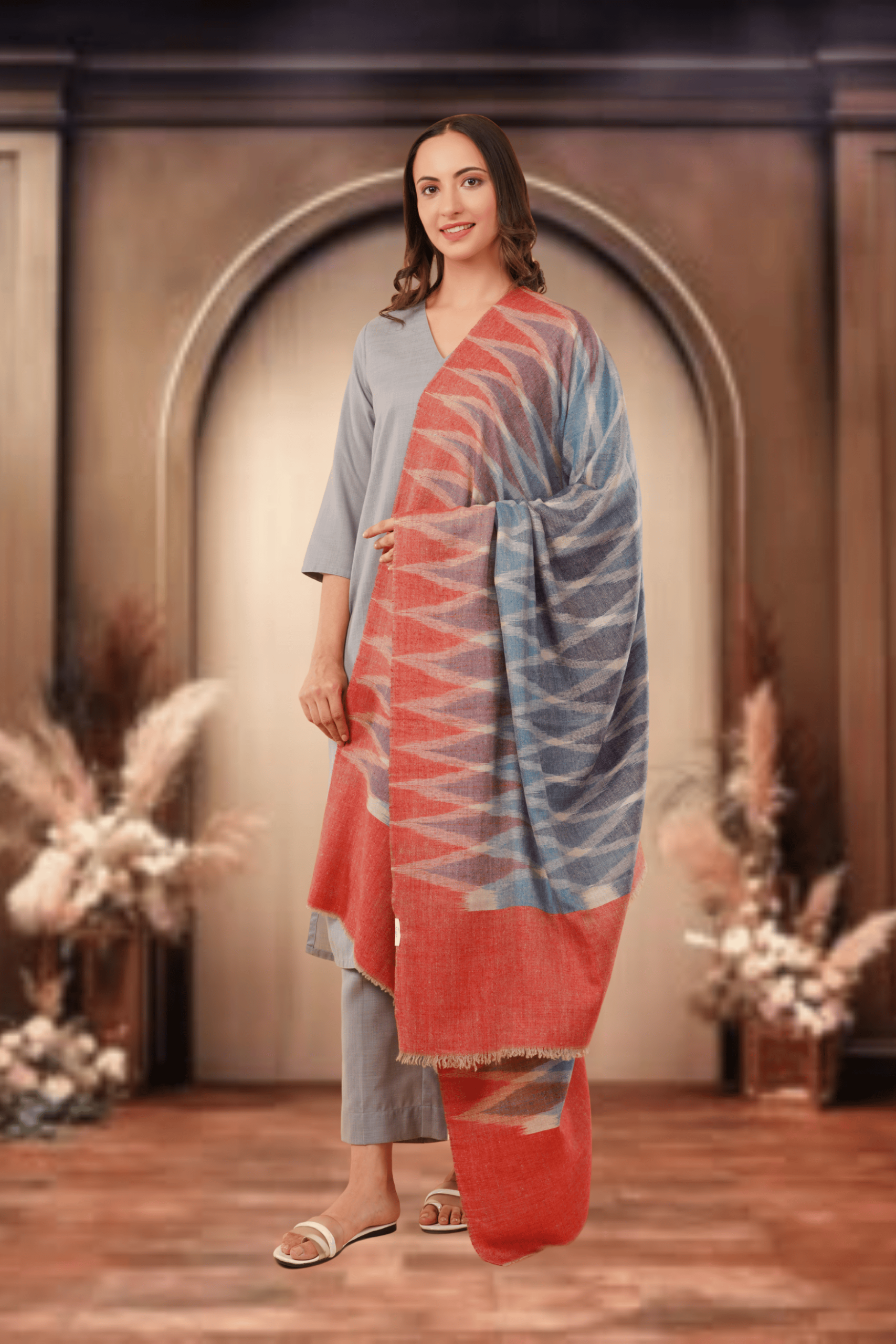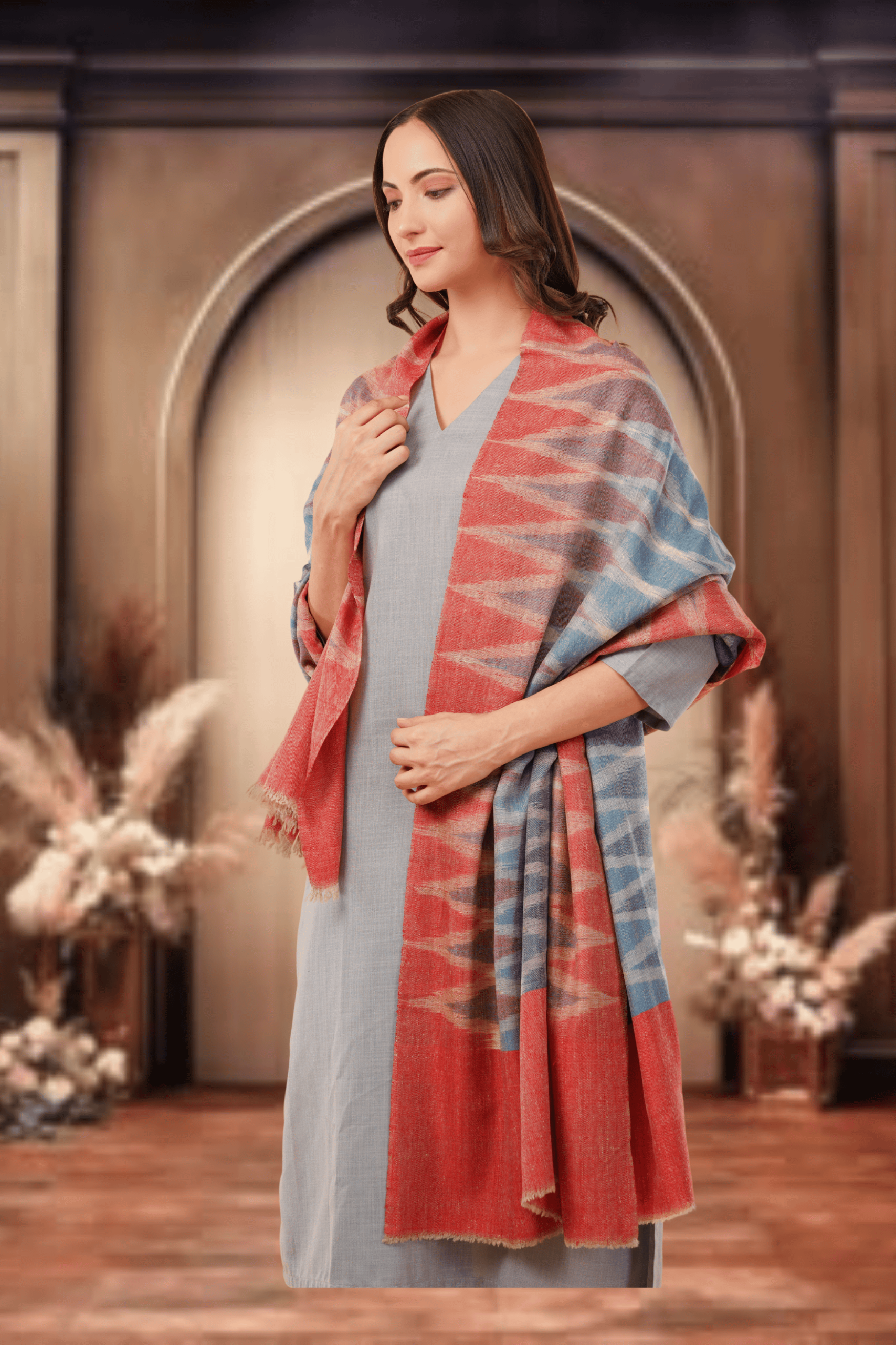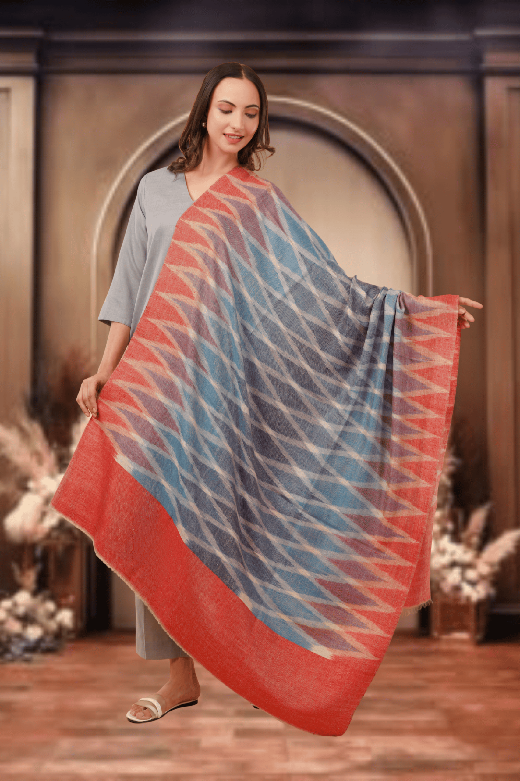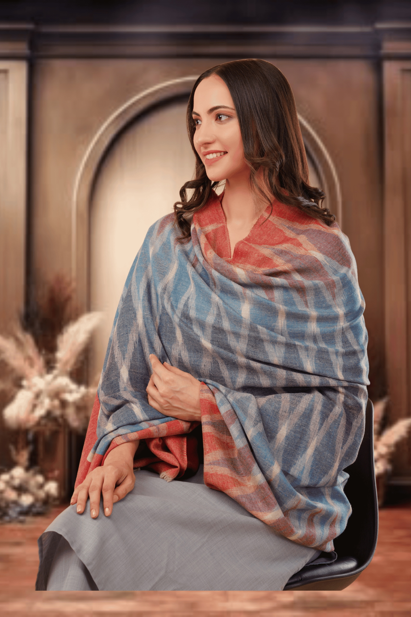 This shawl brings the classic aesthetics of Ikkat weaving to the softness of Kashmiri Pashmina. The geometric patterns in earthy hues create a distinctive visual texture against a soothing cream background. Lightweight yet insulating, it’s the ideal pick for someone who appreciates fusion—where South Asian craft traditions meet contemporary design.