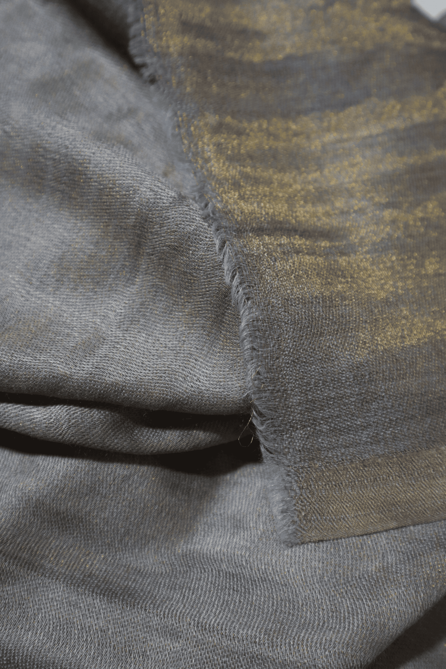 Add a touch of understated glamour with this beautiful Reversible Zari Stole. Expertly hand weaved in Kashmir from incredibly soft Cashmere Fine Wool, this stole provides lightweight warmth and an exquisite drape. The reversible design features two tones of Bronze and Gold Zari, creating a sophisticated metallic sheen. One side displays a dominant bronze/taupe hue with subtle gold shimmer, while the reverse features a more pronounced golden luster, offering versatility for any occasion. The subtle, horizontal texture woven throughout adds depth and character to this elegant and timeless accessory.