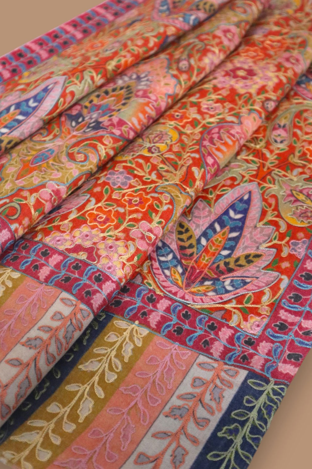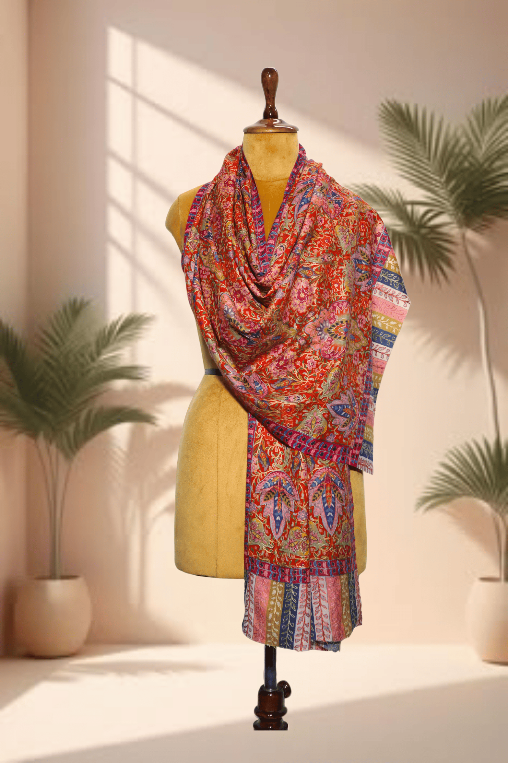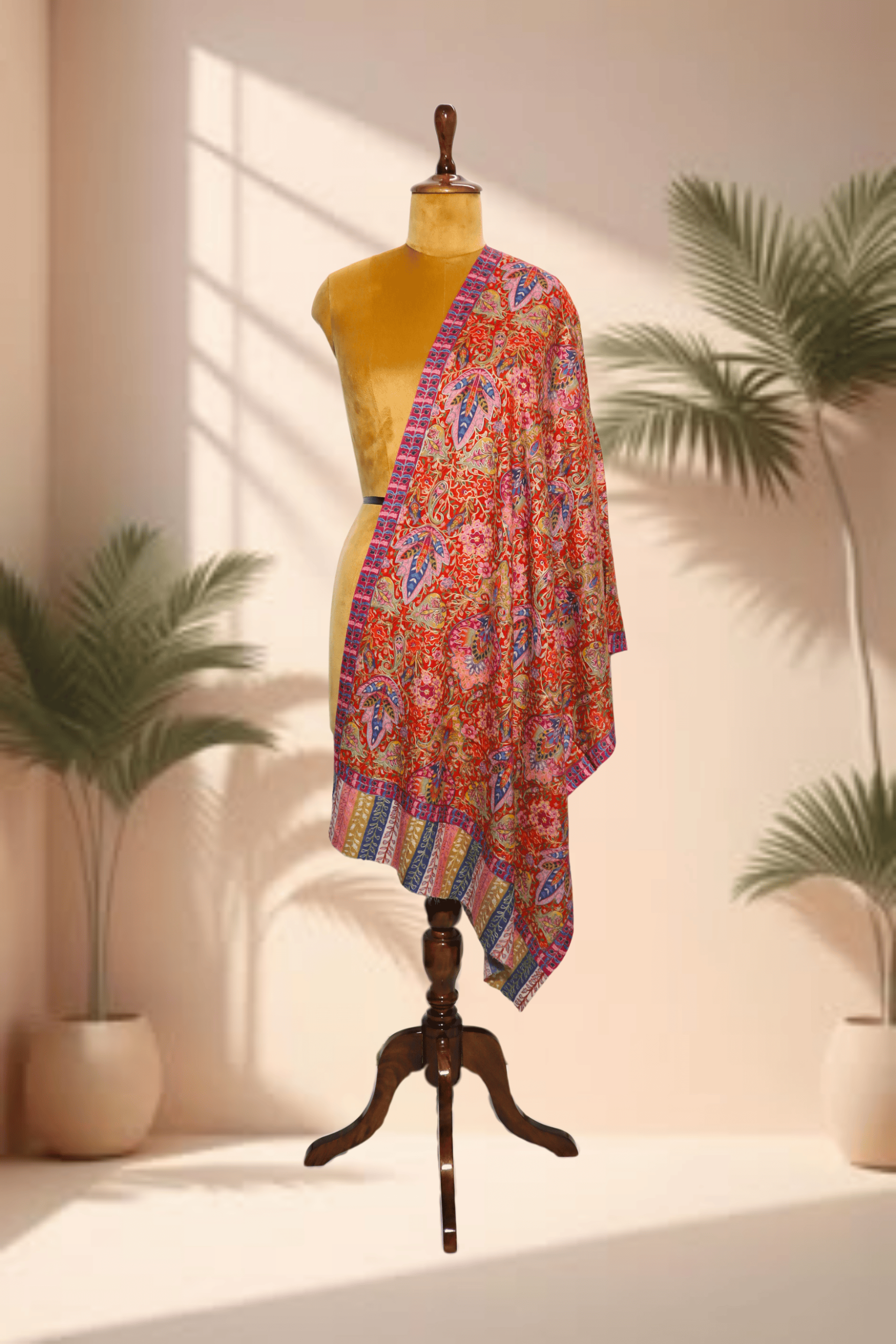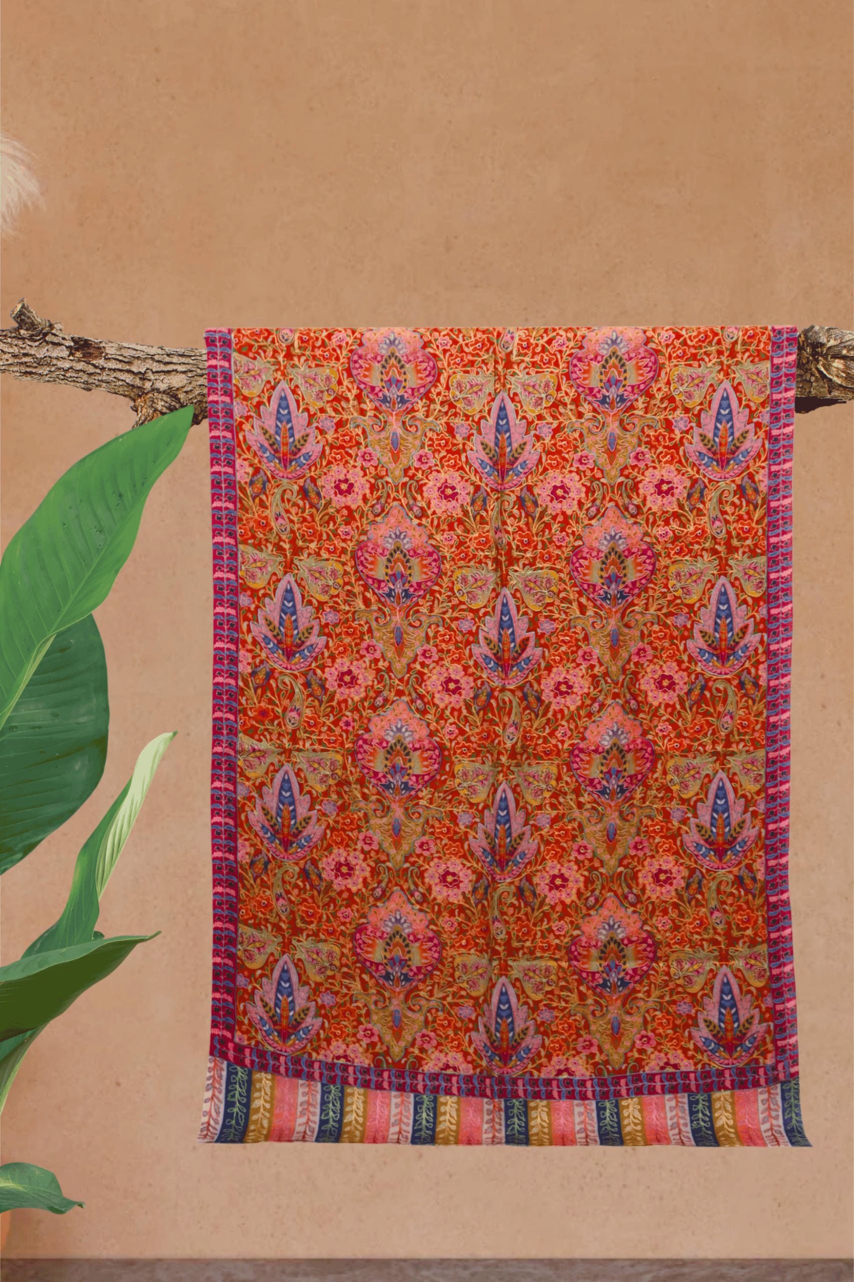 This earthy-toned Kalamkari stole features artistic peacocks woven into a garden of intricate vines and buds. Done in natural dyes and traditional hand-block technique, the warm beige wool base enhances the subtle detailing. Finished with finely embroidered accents along the edges, it reflects the organic charm and narrative tradition of Indian folk art.