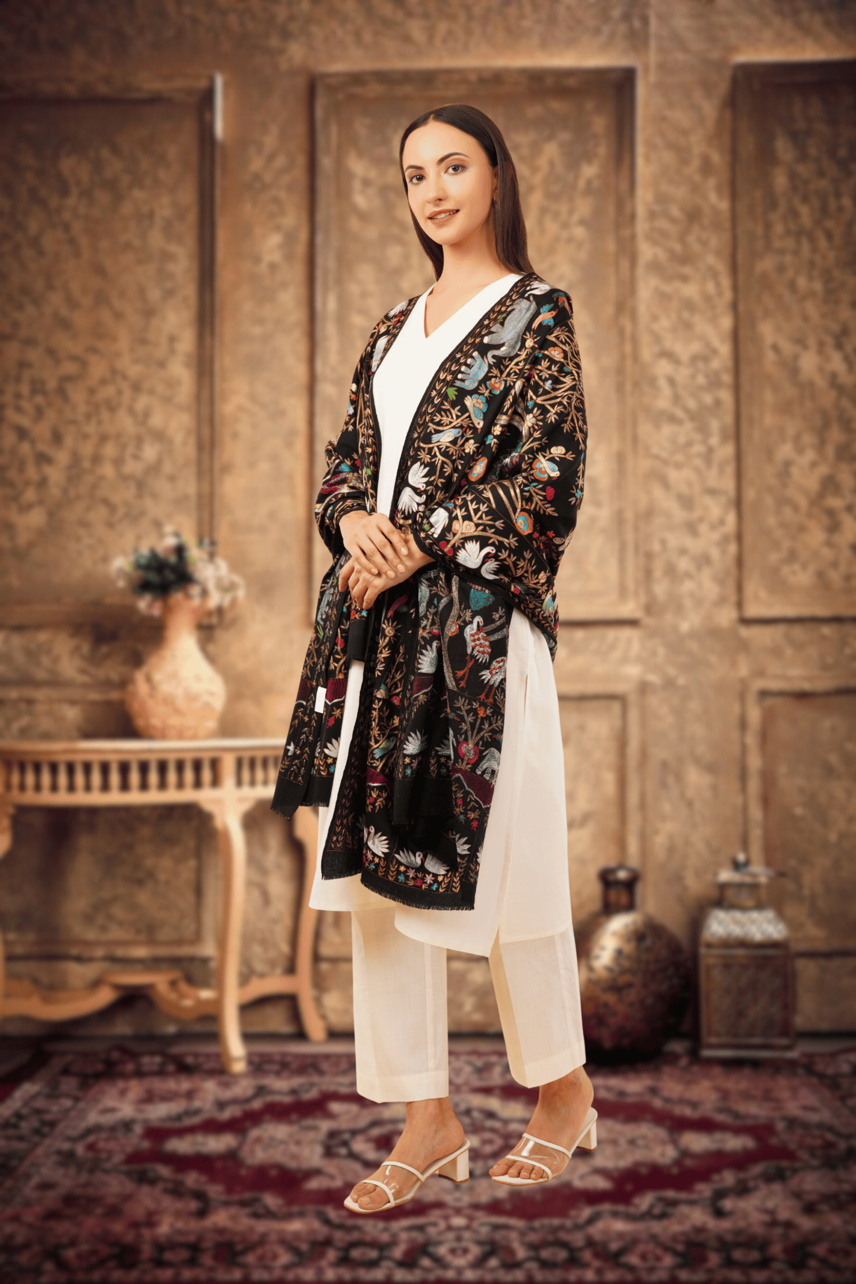 Larger than traditional shawls, this Kalamkari Jama is ideal for tall or broader individuals. The piece features exquisite hand-painted Kalamkari artwork—mythical florals and swirling vines—enhanced with elegant gold zari accents. Made from pure Pashmina, it combines the richness of Mughal-inspired artistry with modern wearability. A true statement piece for weddings and grand festivities.