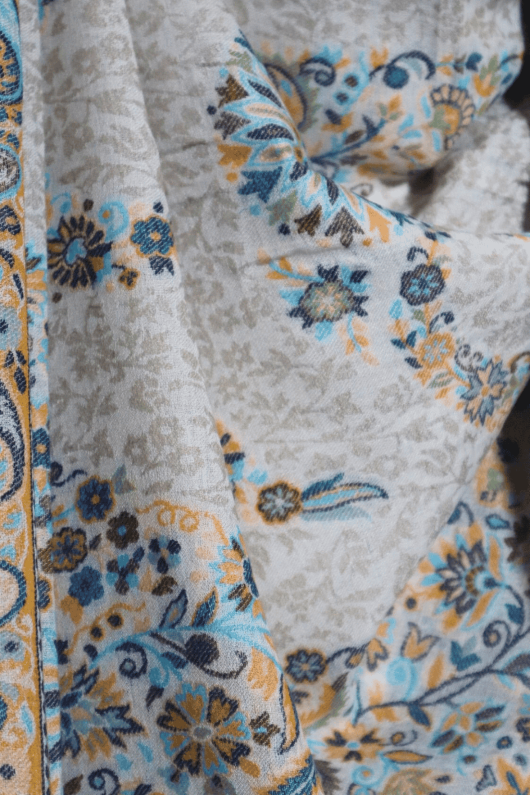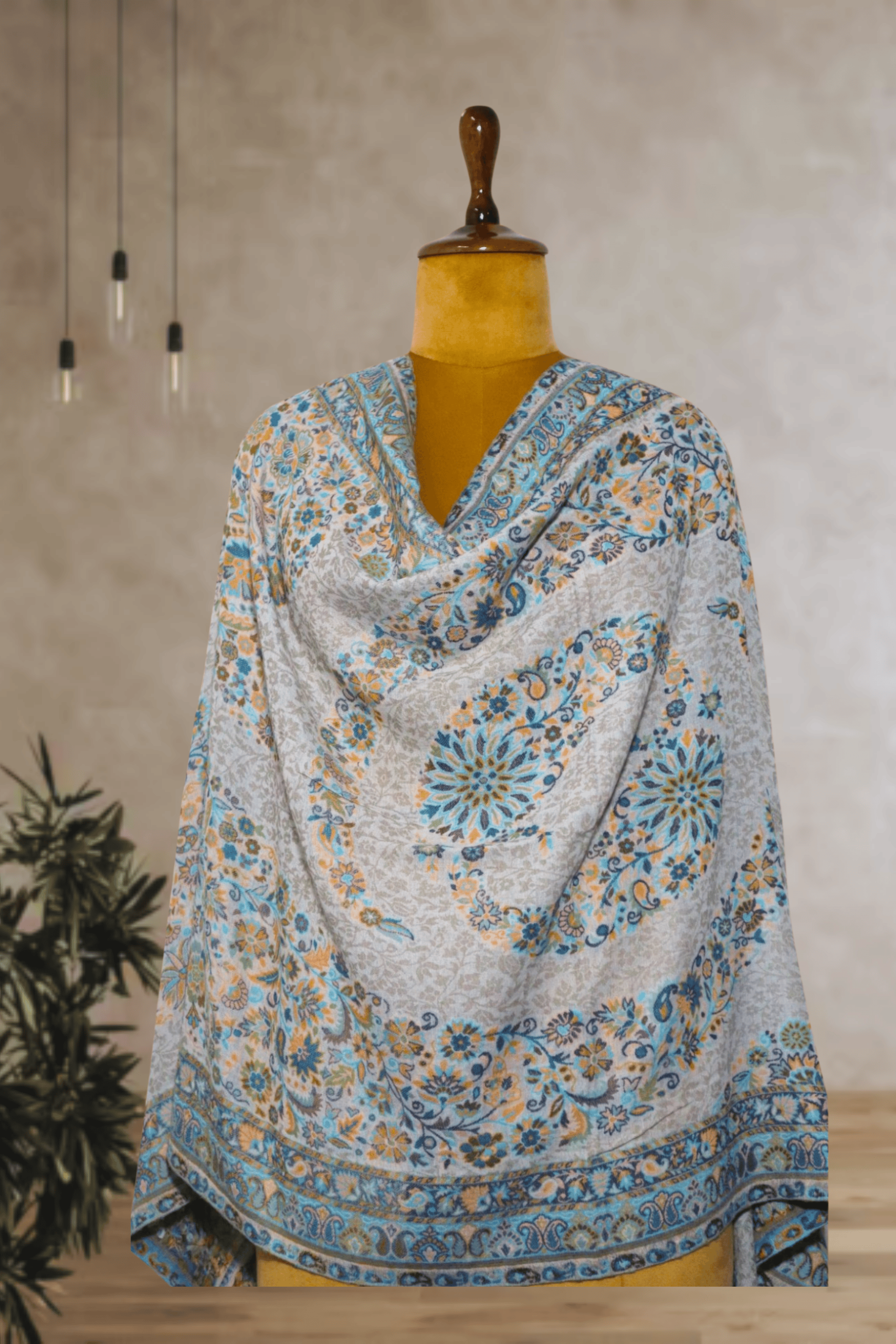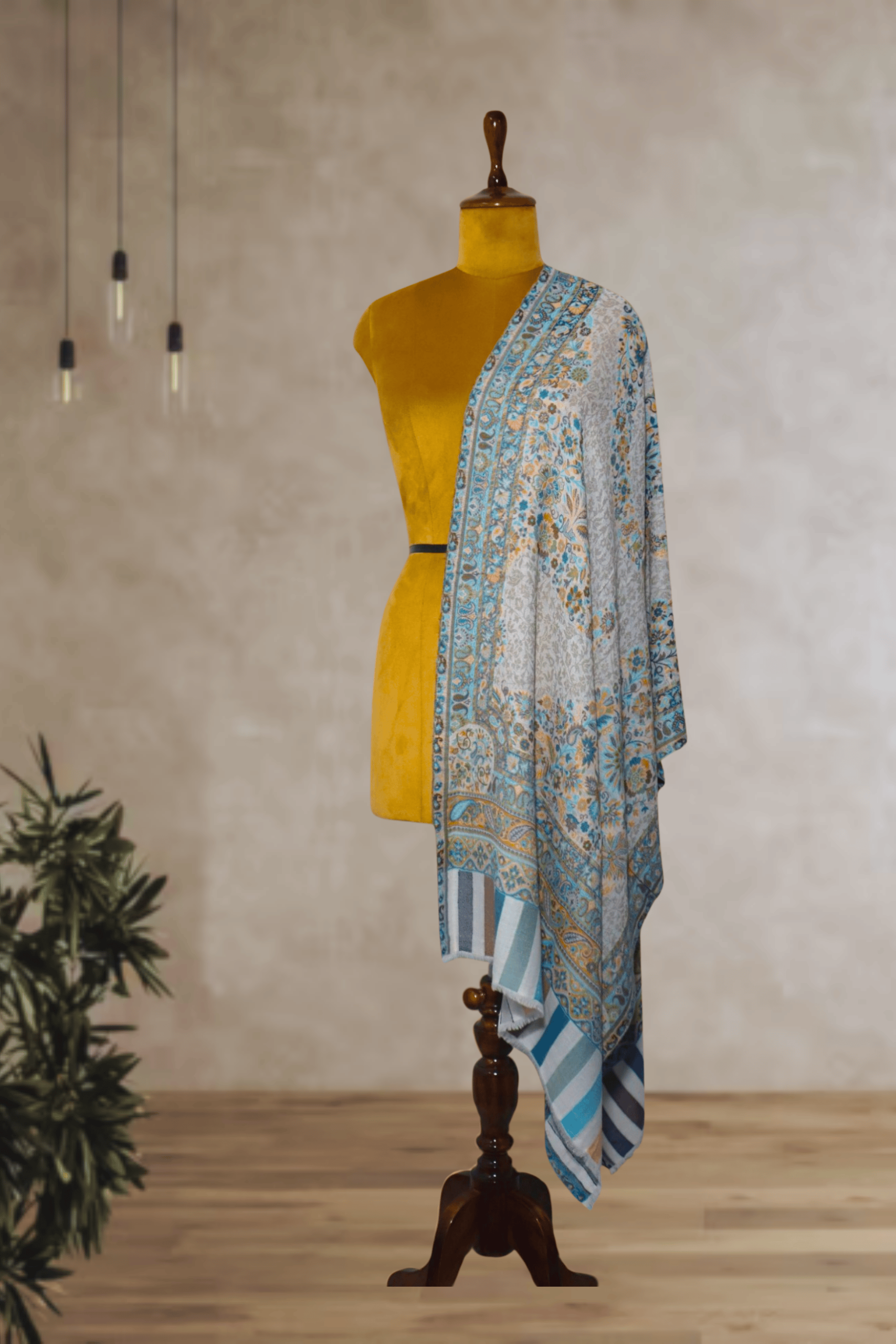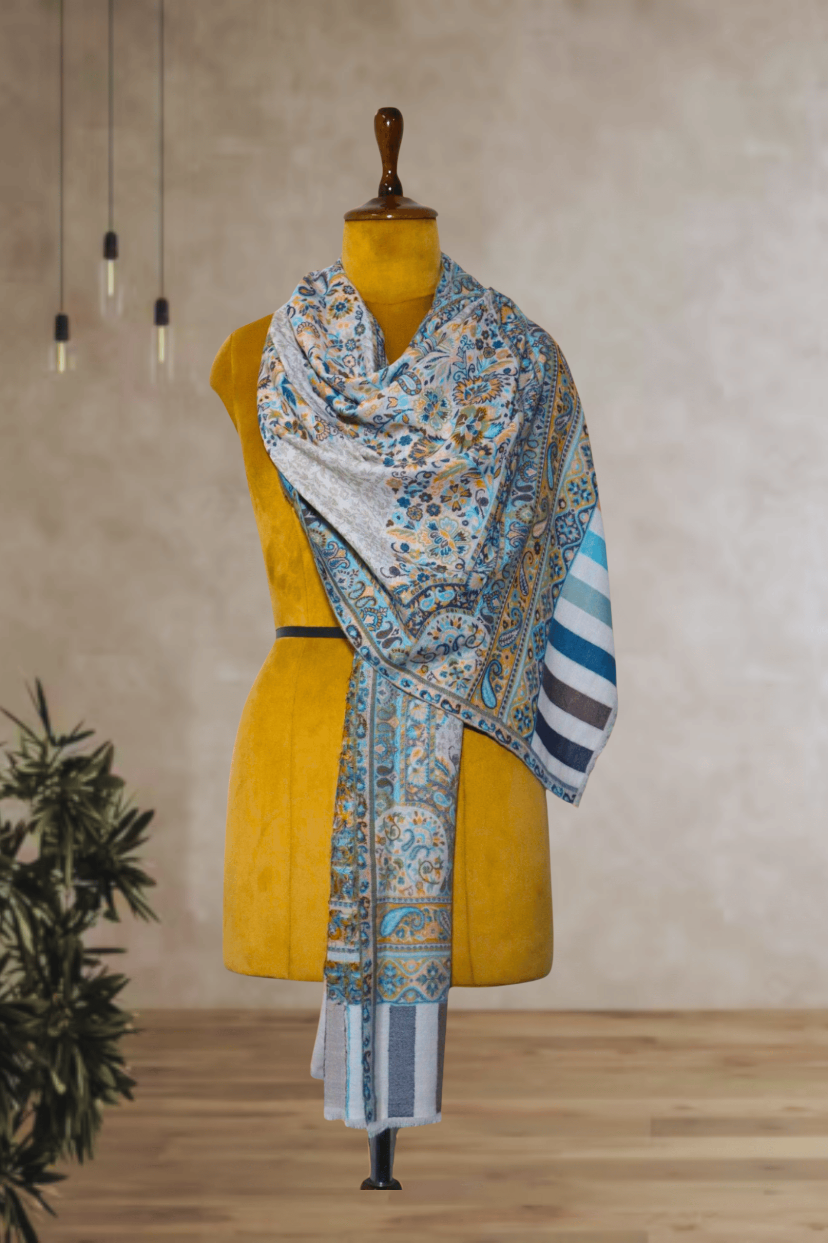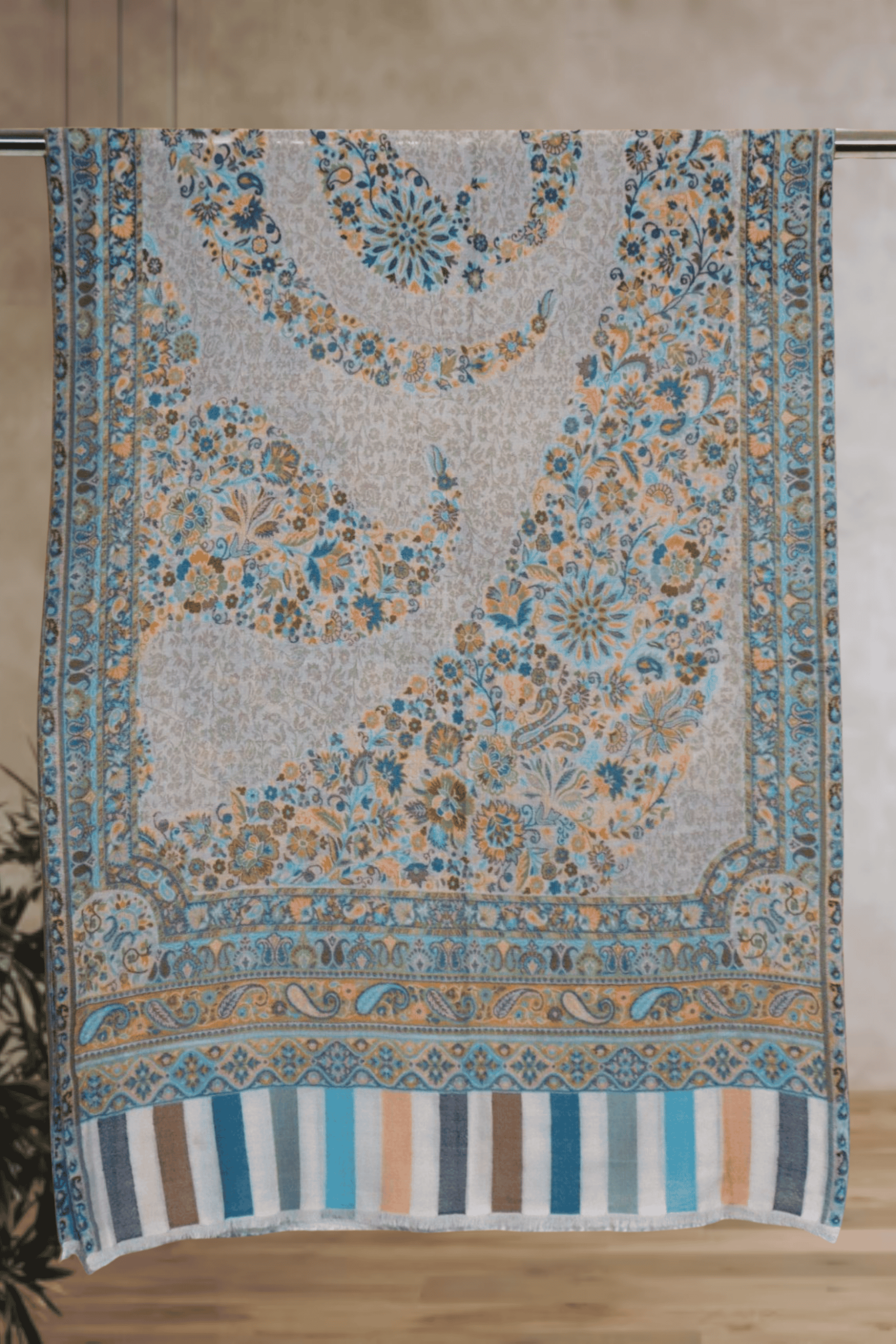 This Kani Jama shawl is a celebration of intricate craftsmanship and delicate hues. Inspired by traditional Kashmiri art, the stole features a fine all-over floral weave using the kani technique, portraying Mughal-style garden motifs in serene pastel shades.