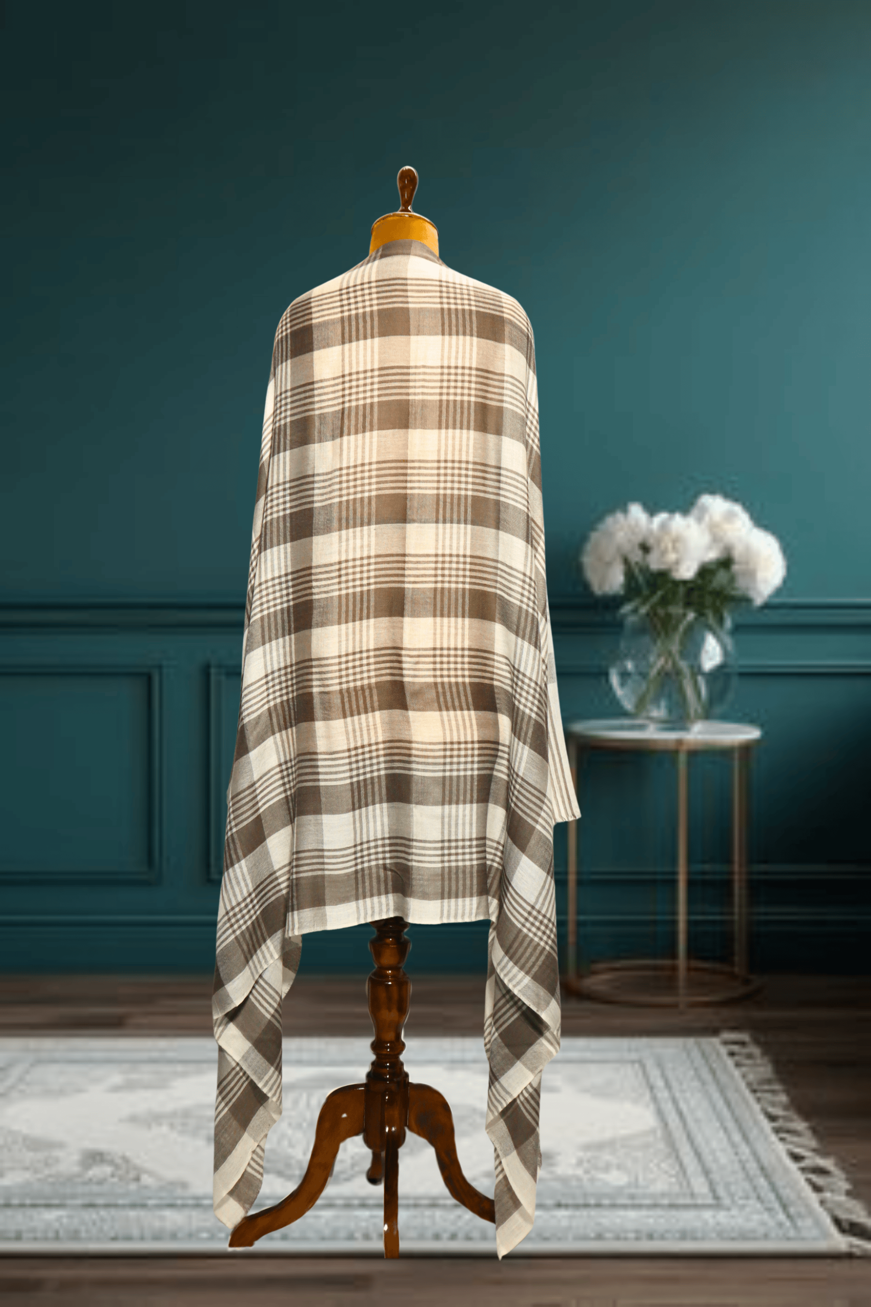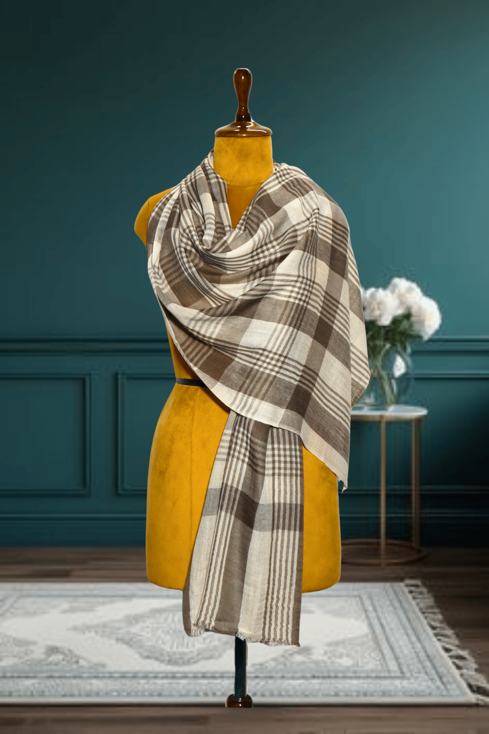 Luxurious Cashmere Fine Wool Check Shawl in Ivory and Taupe