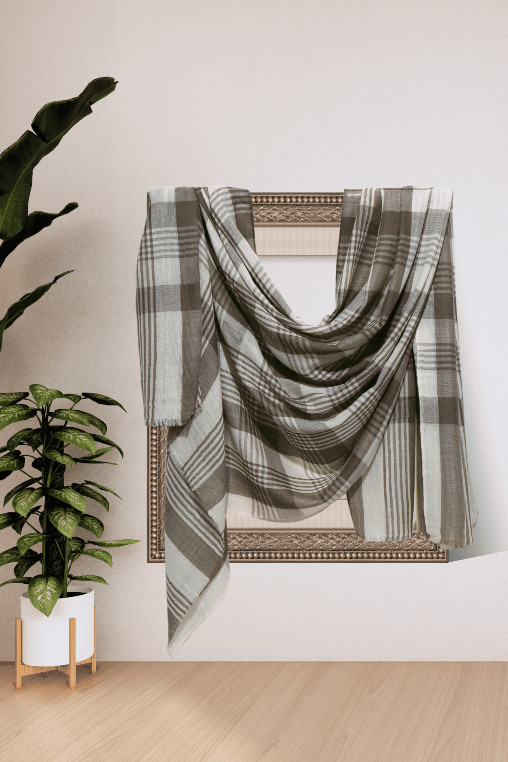 The shawl’s blend provides exceptional warmth yet remains lightweight and incredibly soft against the skin—the signature quality of fine cashmere. The classic check pattern in versatile ivory and taupe is woven with precision, creating a beautiful drape and enduring structure. Manufactured by Ally’s Textiles, this piece reflects dedication to quality and craftsmanship.