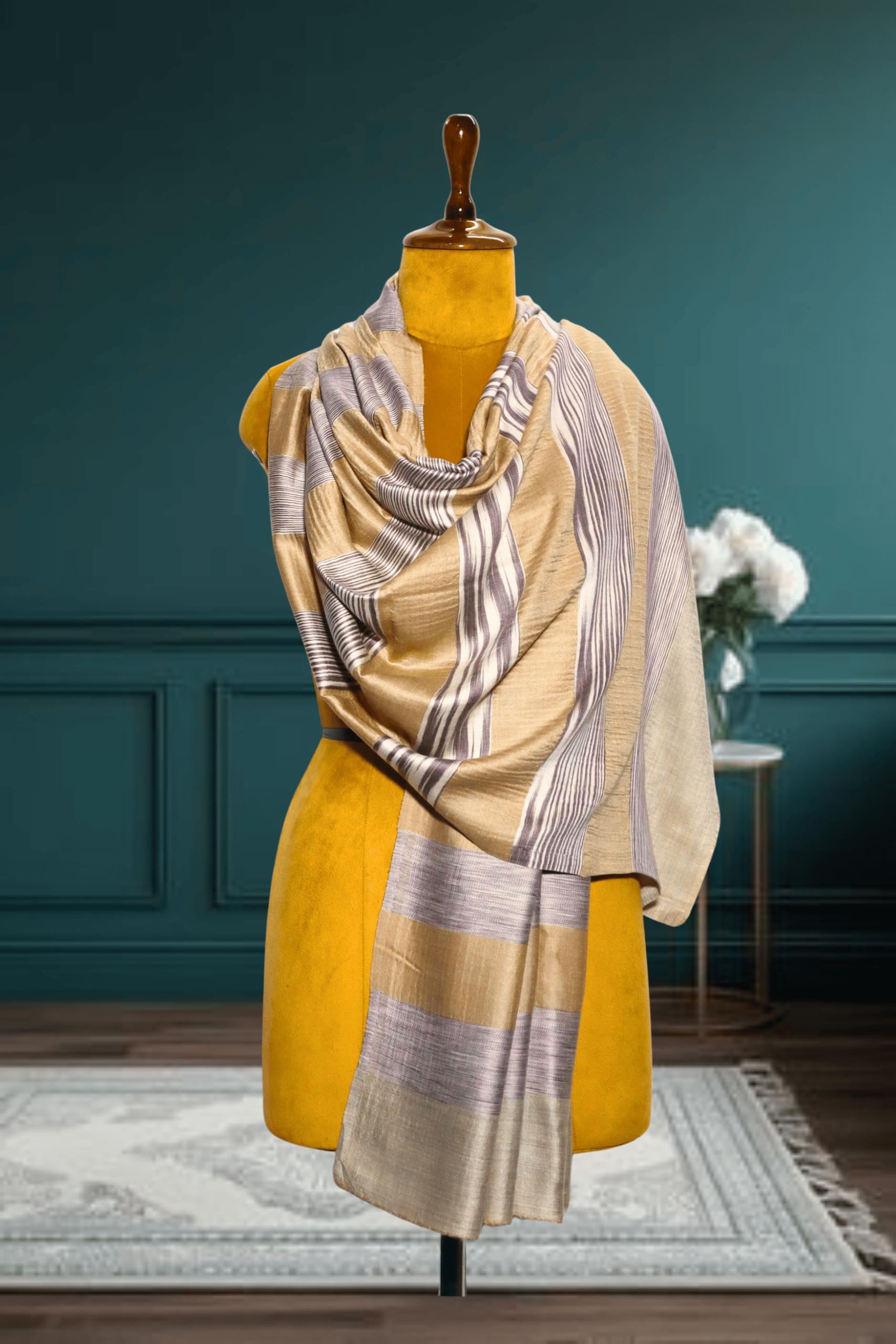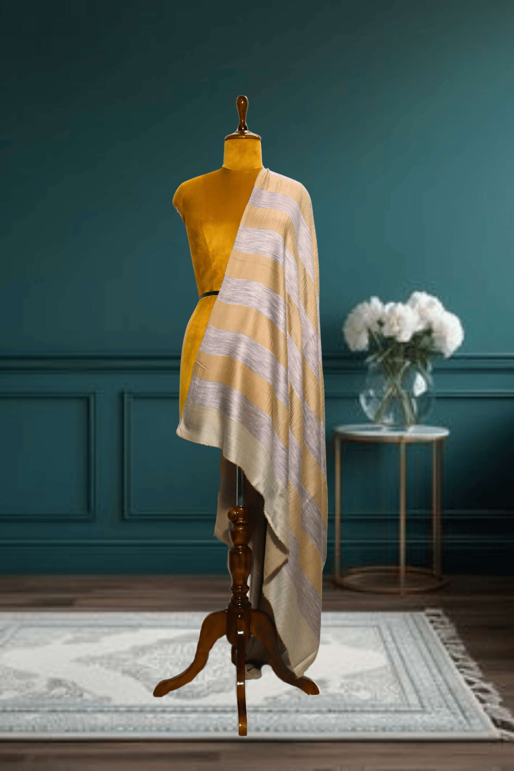 Luxurious Cashmere Fine Wool Striped Shawl in Golden Beige and Silver-Gray