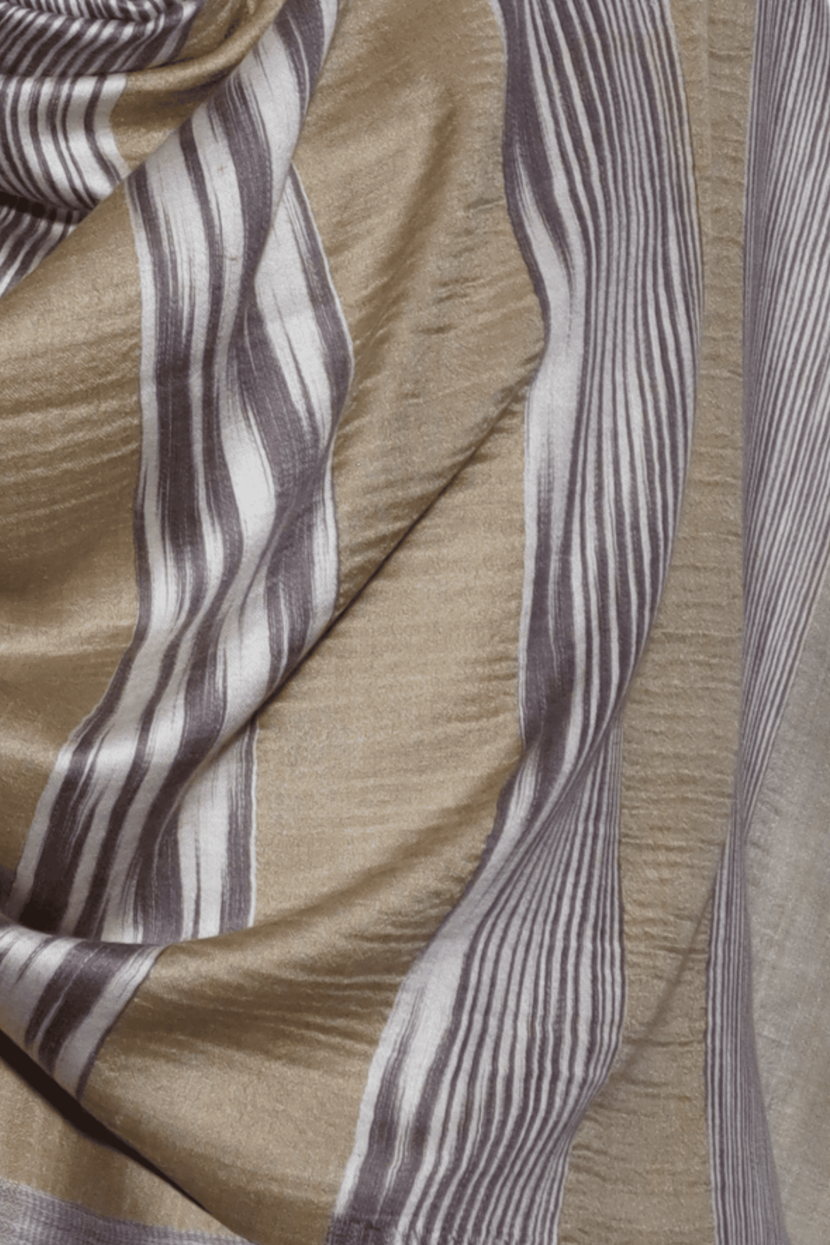 Crafted from a premium blend of cashmere fine wool, this shawl delivers an unparalleled soft feel and comforting warmth without any heaviness. The distinguishing feature is the contemporary two-tone stripe design, alternating between a warm golden beige and a cool silver-gray. The fine weaving technique ensures a beautiful drape and shimmer, highlighting the quality of the material.