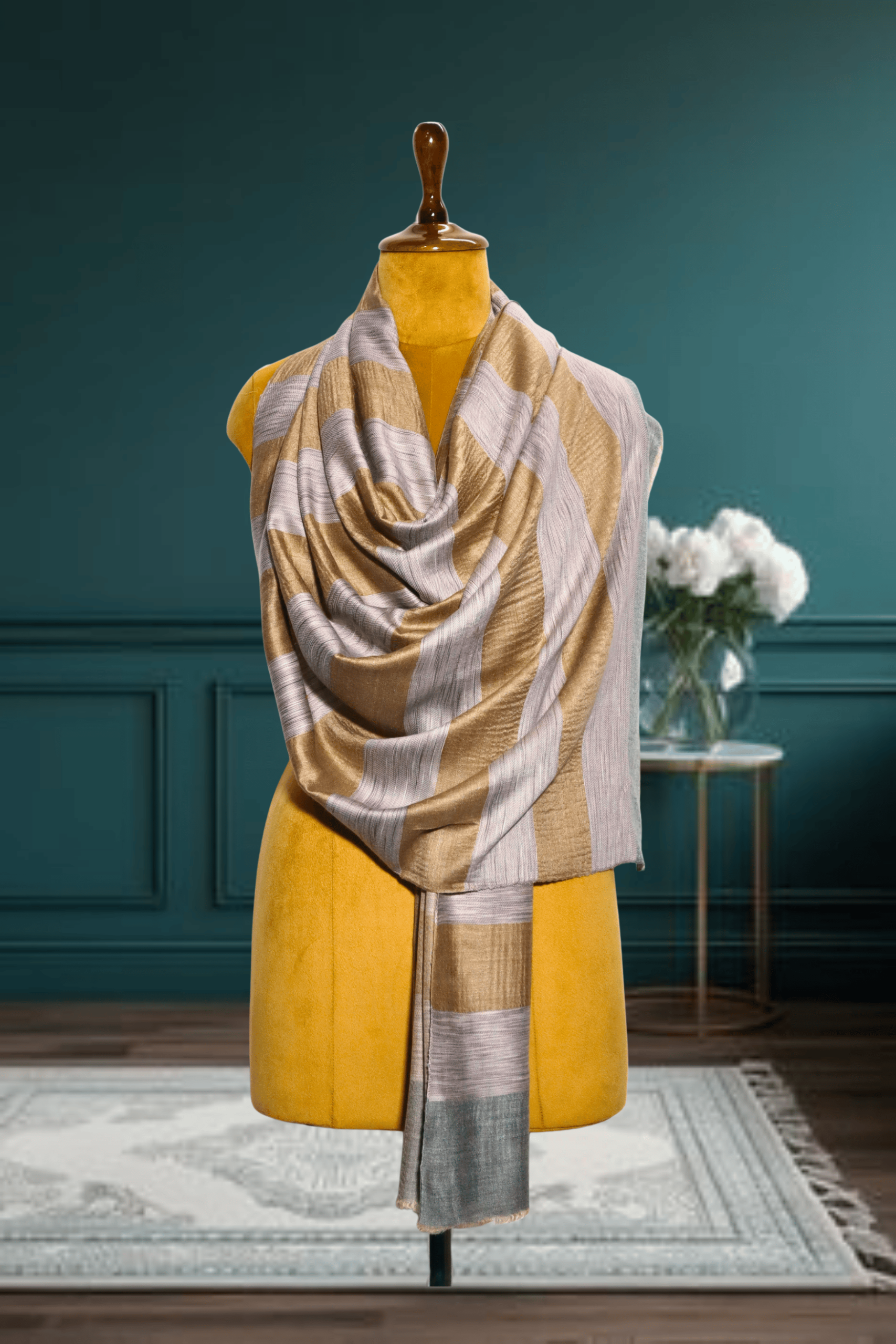 Luxurious Cashmere Fine Wool Striped Shawl in Shimmering Gold and Silver