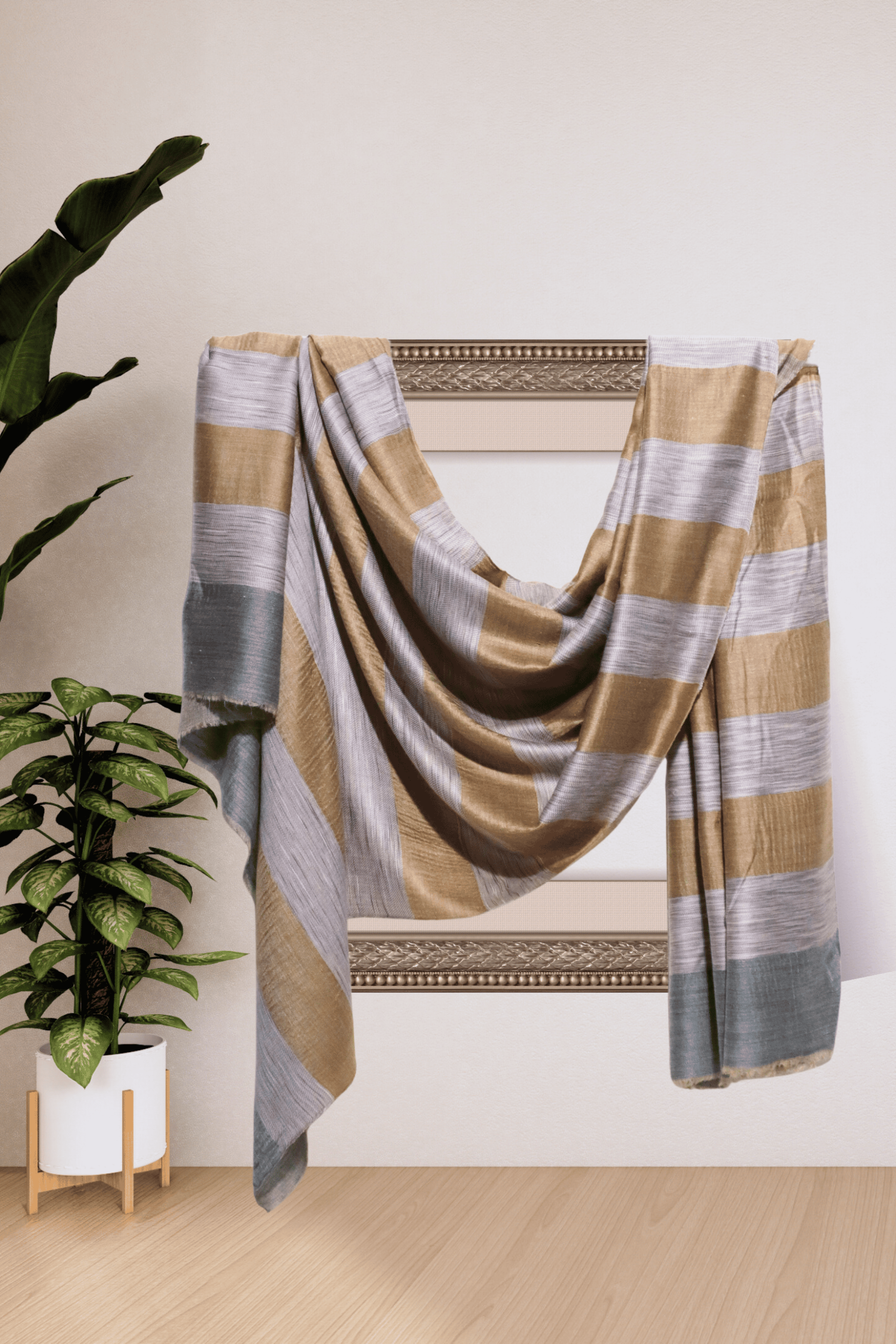 Crafted from a premium cashmere fine wool blend, this shawl delivers exquisite softness and comfortable warmth without feeling bulky. The defining feature is the bold horizontal stripe pattern, woven with alternating bands of rich metallic gold/bronze and cooler silver/light gray. This shimmering effect is achieved through the weaving technique, giving the shawl a luminous quality that catches the light beautifully. It is proudly manufactured by Ally’s Textiles, ensuring a superior finish.