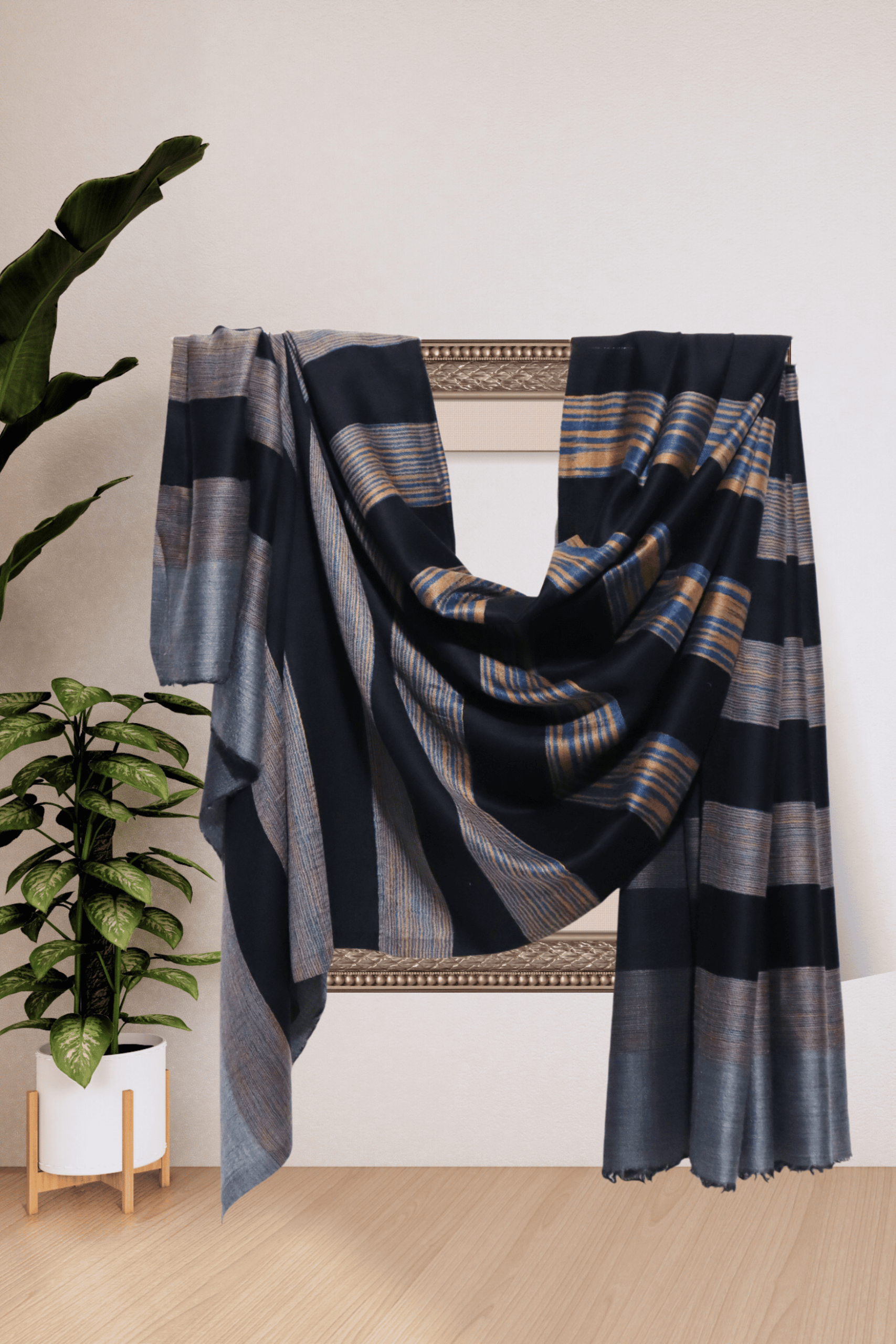 Luxury Cashmere Fine Wool Striped Shawl in Midnight Blue and Pale Gold
