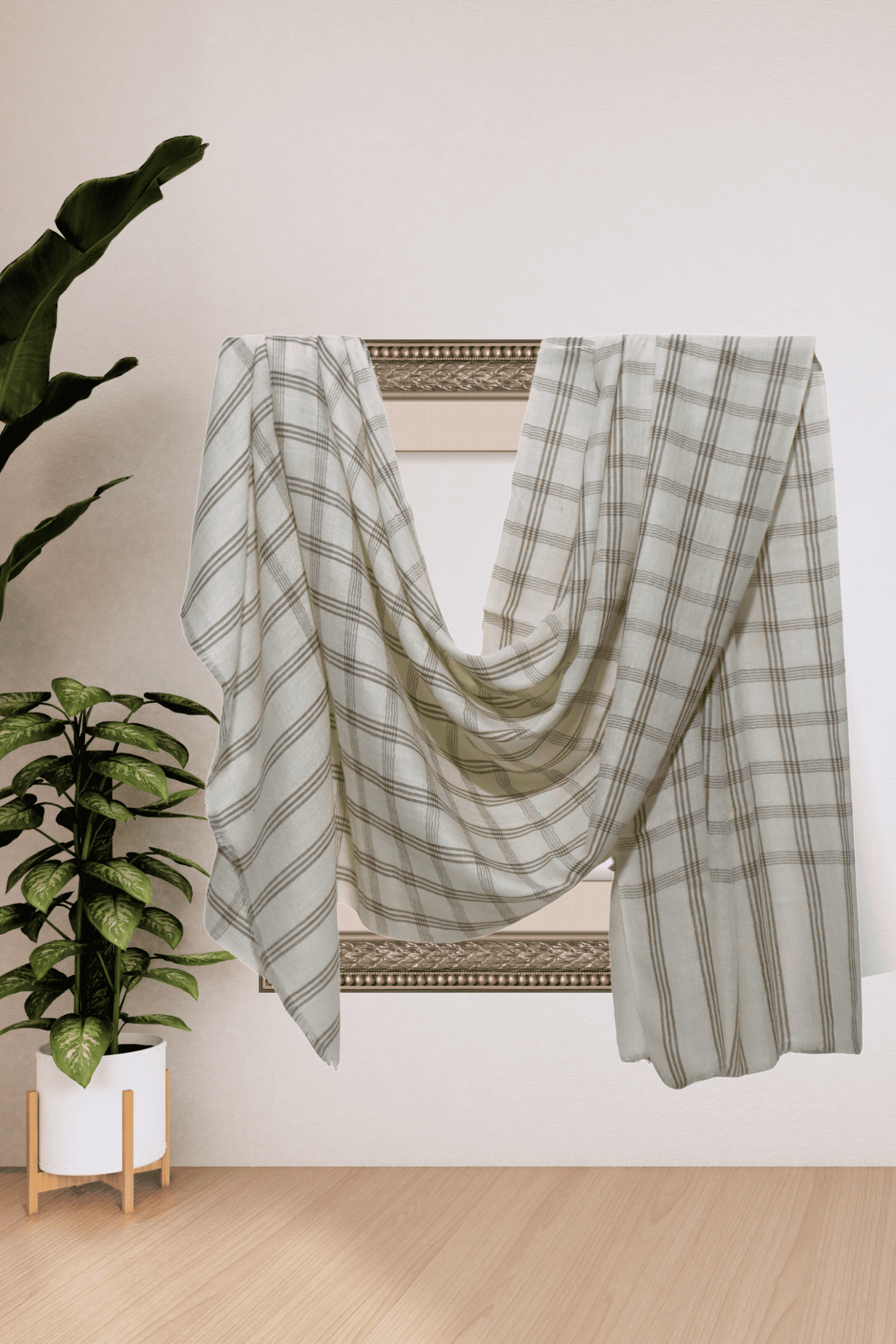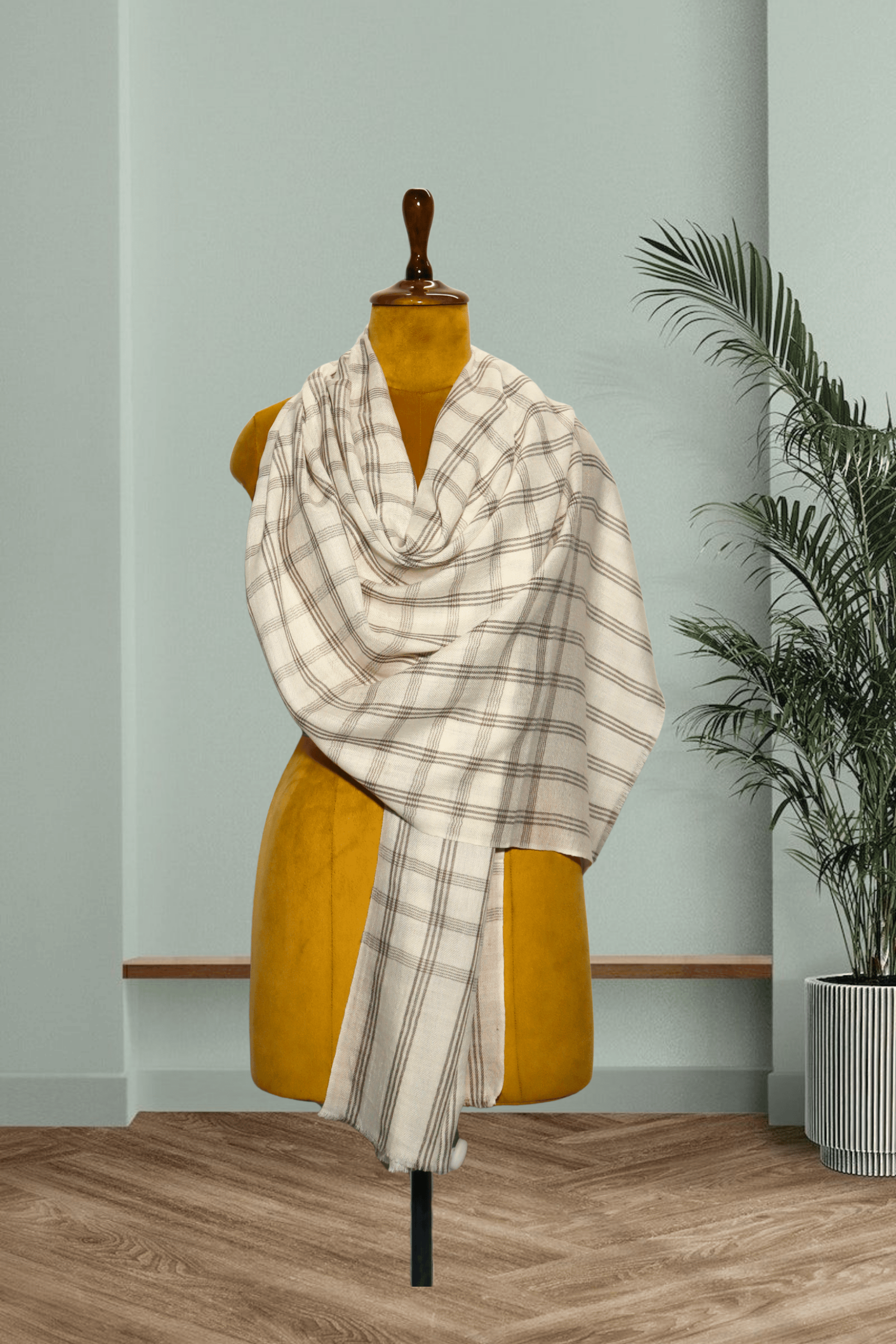 The superior feel of the cashmere fine wool material provides natural warmth and a beautifully soft hand-feel, ensuring a comfortable and elegant drape. The design features a prominent Classic Check pattern in a versatile, muted palette, combining blocks of Cream/Ivory and Taupe Brown. The meticulous weaving technique guarantees a high-quality finish and enduring aesthetic, proudly brought to you by Ally’s Textiles.