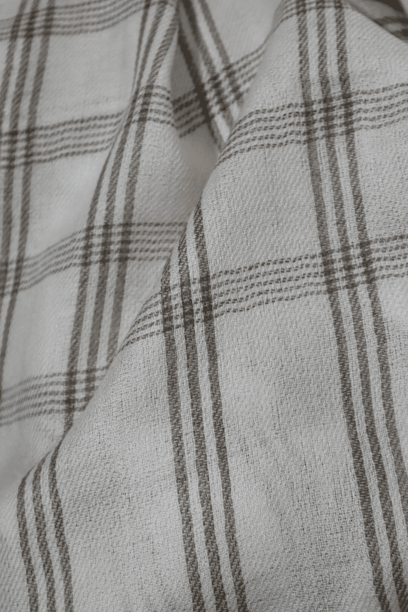 An exceptionally soft cashmere fine wool stole, featuring a timeless, large-scale check in elegant neutral tones.