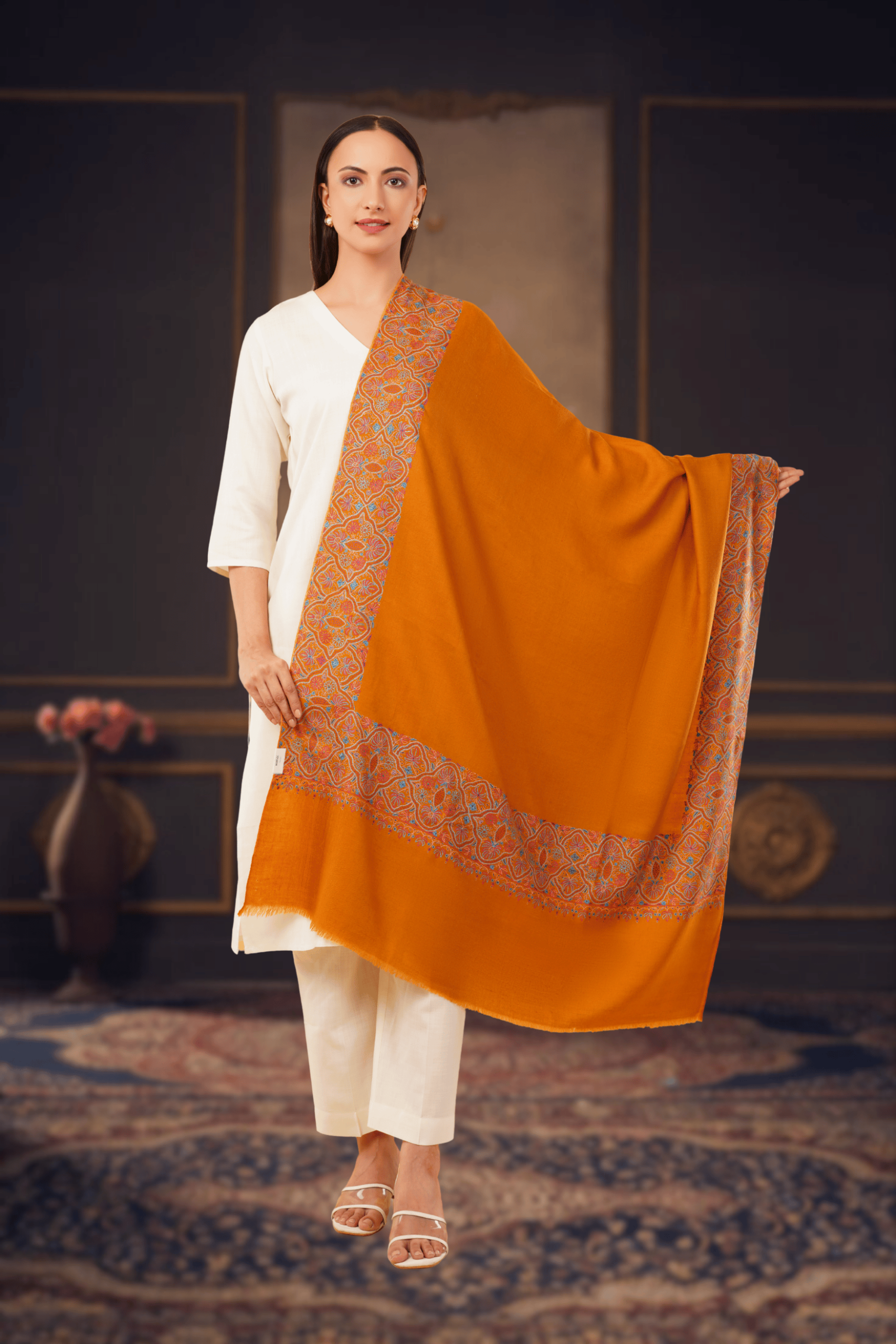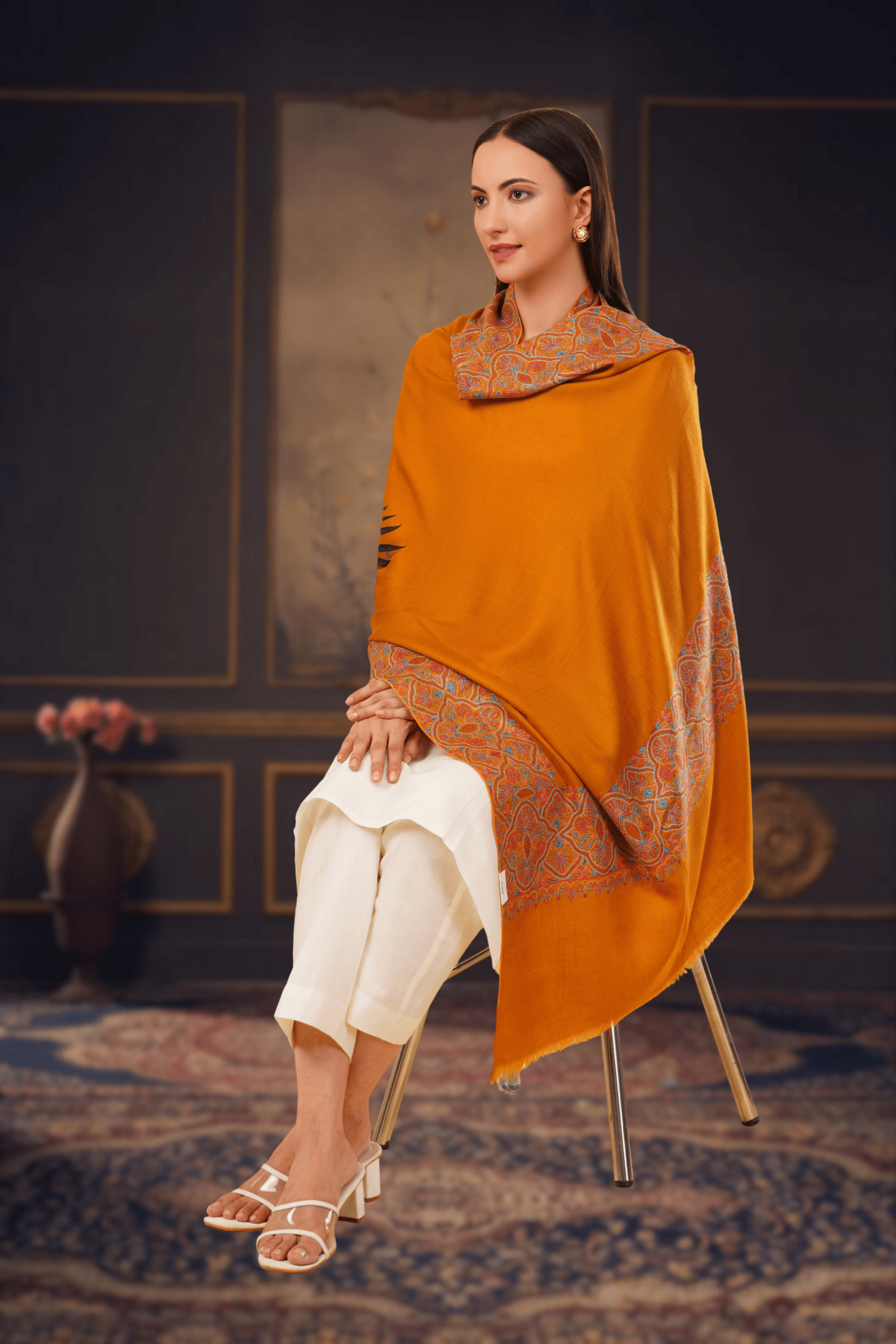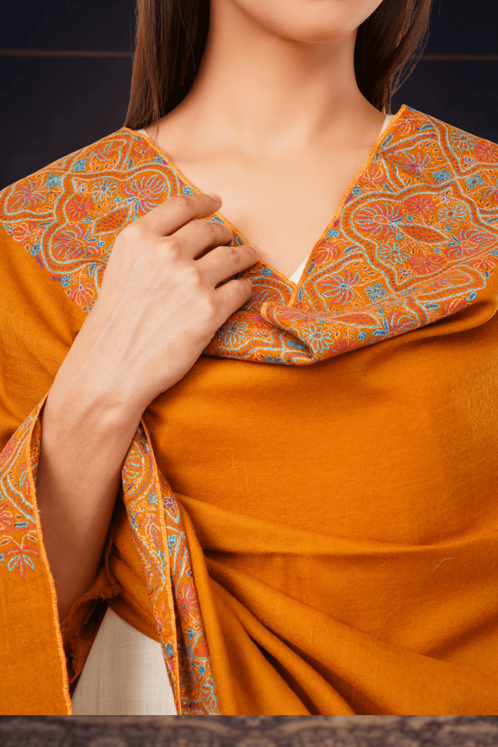 Ochre Pashmina Shawl with Sozni Border Embroidery