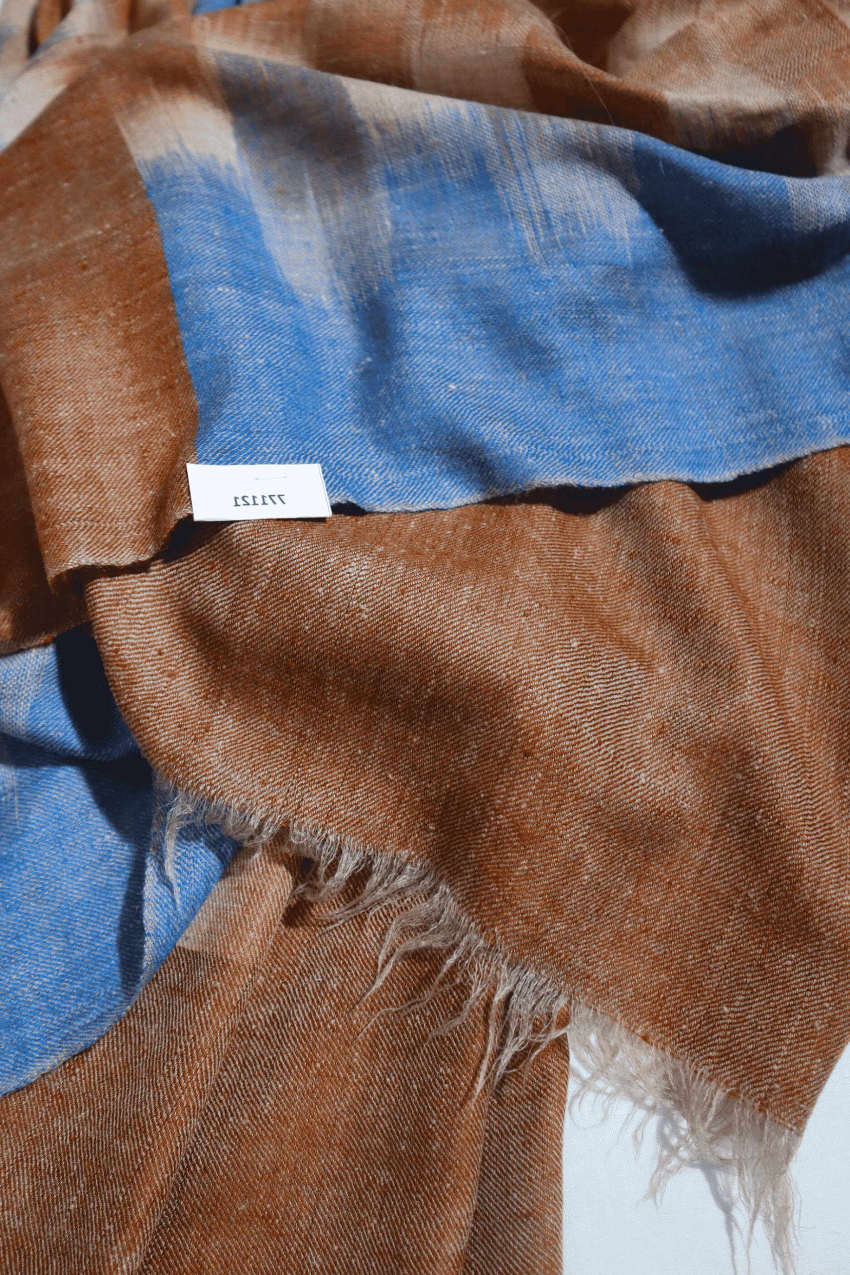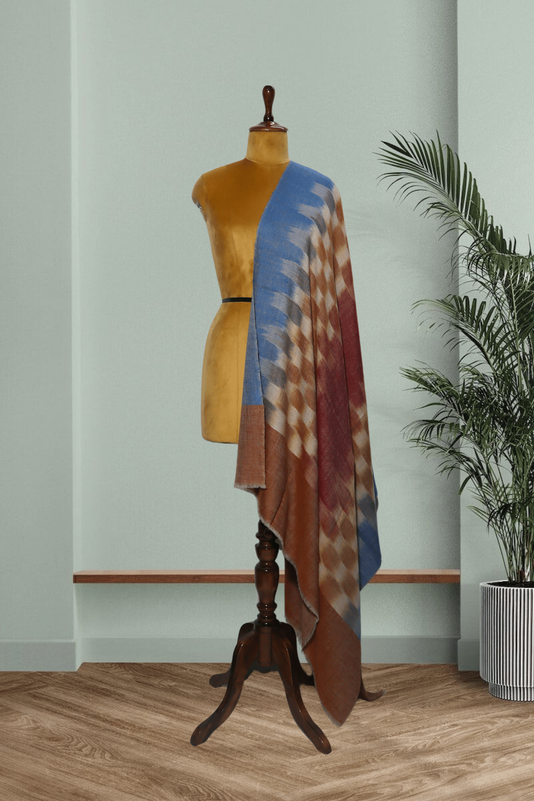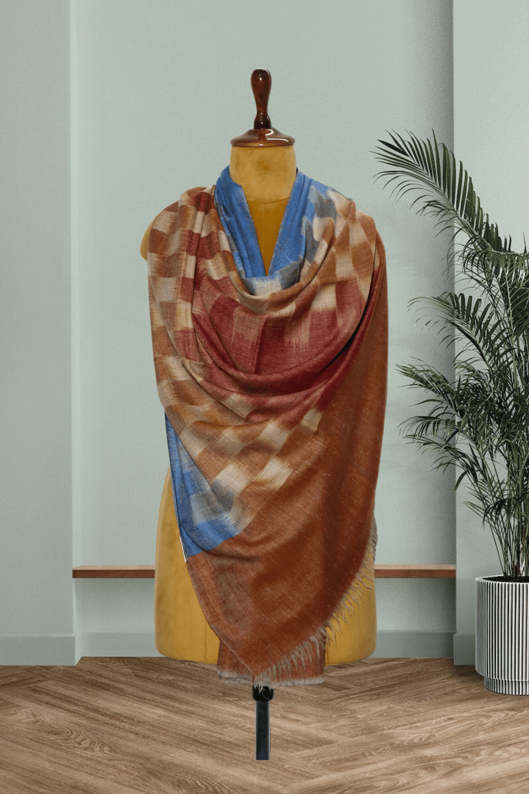 Elevate your style with the artistic flair of this Pure Pashmina Ikkat Shawl. Expertly hand-weaved in Kashmir from the finest Pure Pashmina wool, it delivers ultimate softness, lightweight comfort, and a gorgeous drape. The design showcases a striking Ikkat pattern—distinguished by its characteristic blurry, geometric motifs—in a rich, autumnal palette of Rust Red, Terracotta Brown, and Sky Blue. This technique involves tie-dyeing the threads before weaving, resulting in a complex, painterly effect across the fabric. The generous inch size ensures comfortable styling, making this shawl a contemporary, luxurious, and timeless statement piece.