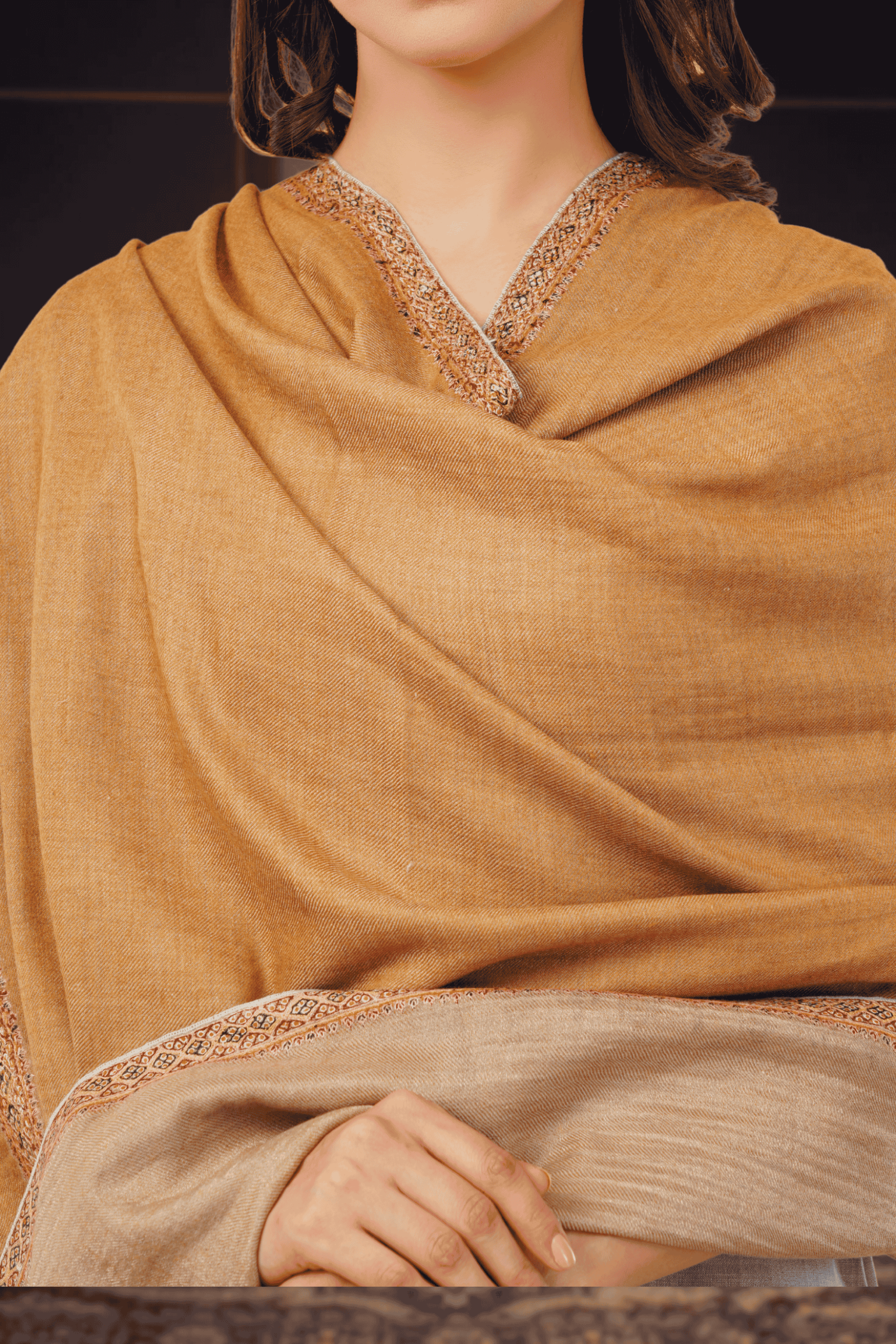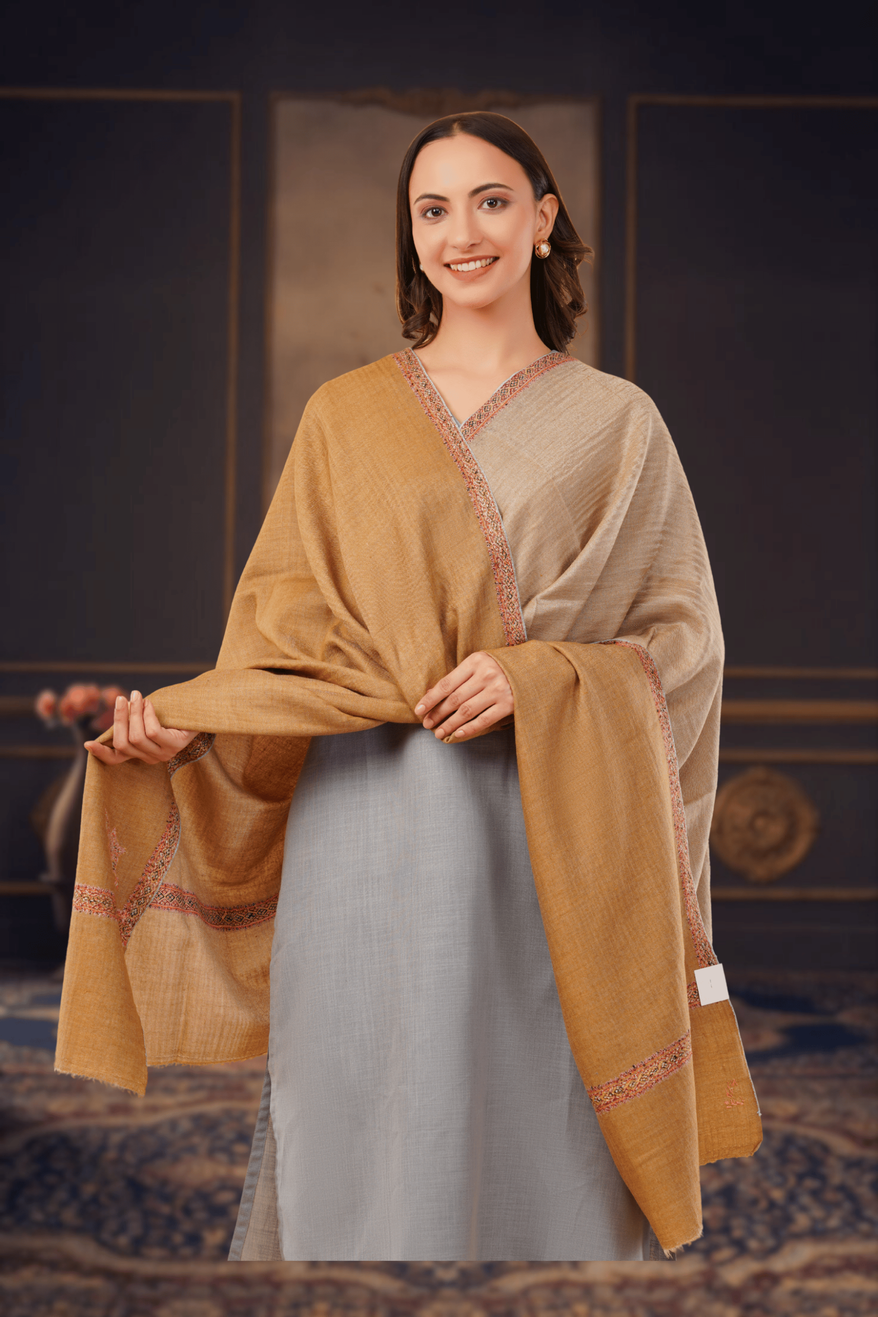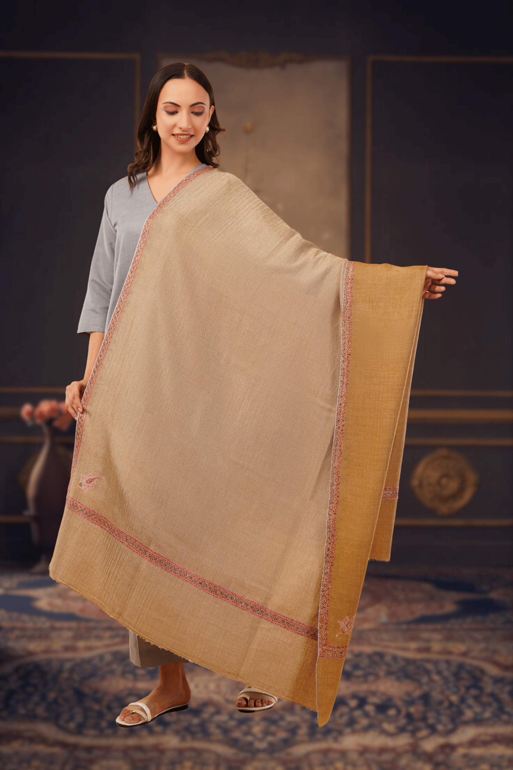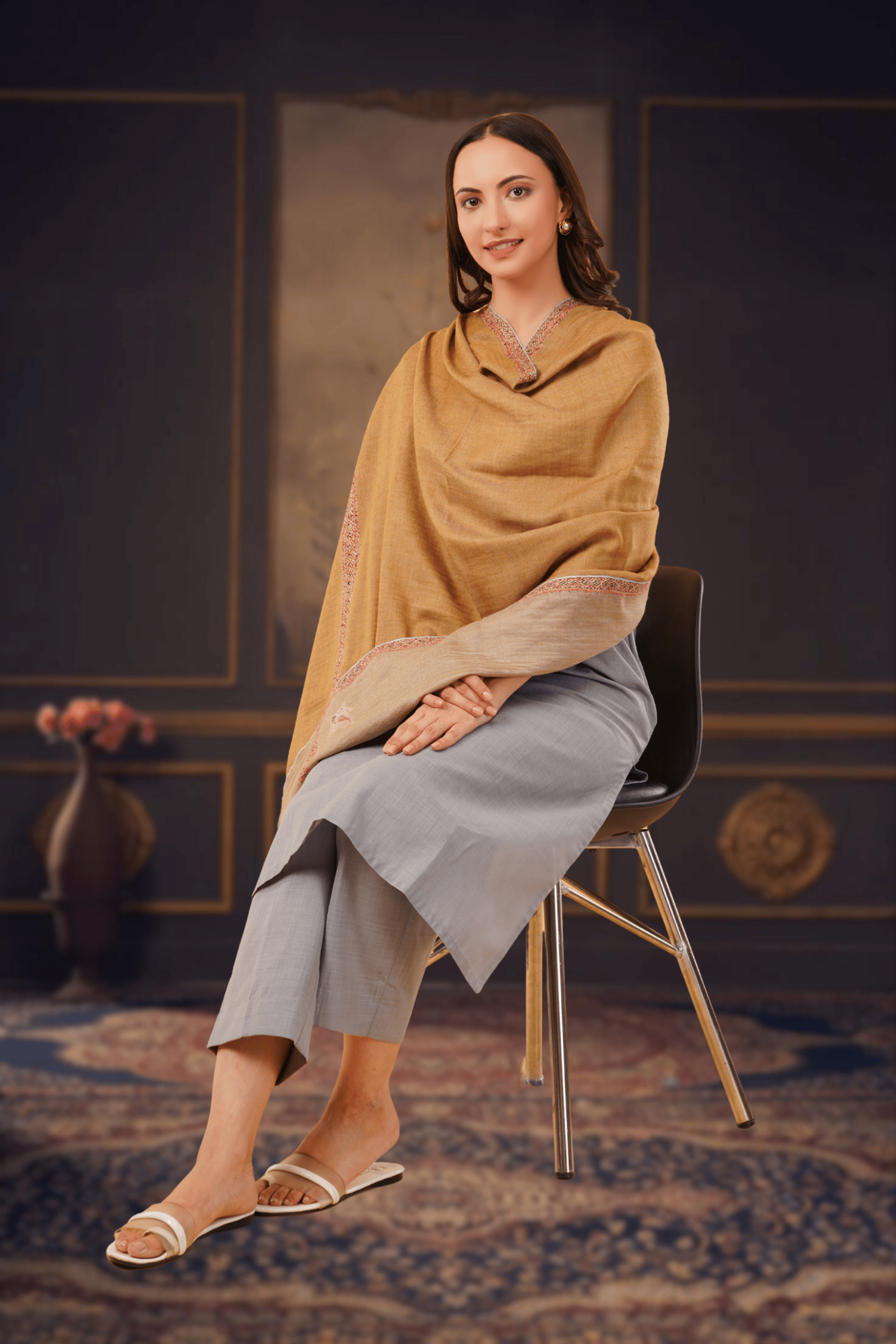 A true double-sided beauty, this reversible Haishidaar shawl offers versatility and charm. Subtle Base in soft greys and neutrals with reversible embroidery create a quiet sophistication that adapts to any look—formal or casual. Made from pure Pashmina, its feather-light warmth and reversible finish make it a perfect travel companion and all-season staple.