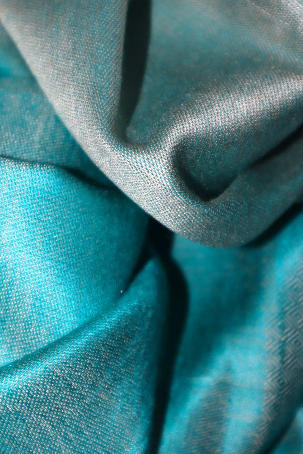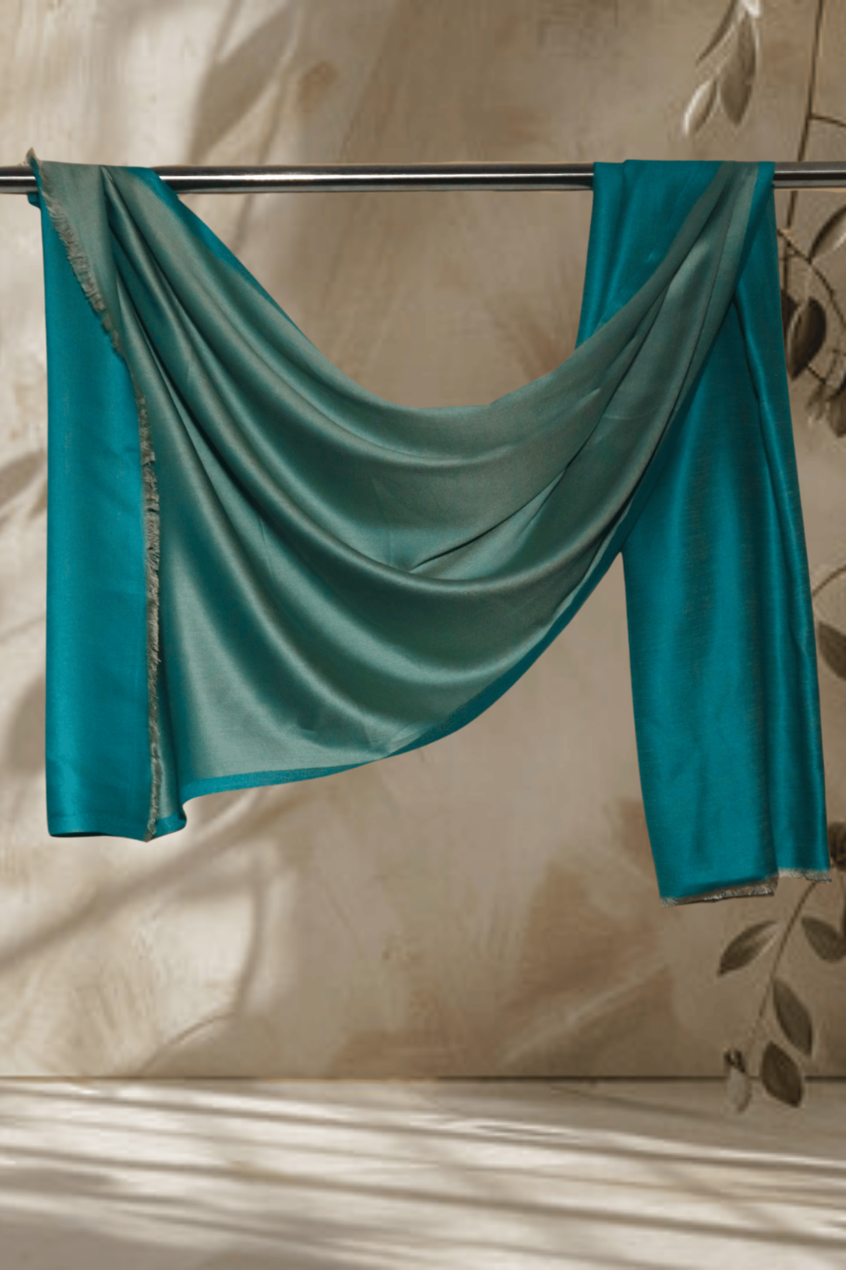 Embrace the serene beauty of this Reversible Teal Blue Silk stole. One side features a vibrant teal blue, while the reverse is a lighter, subtle aqua blue, both exhibiting a beautiful shimmer. Crafted from a premium silk, the stole offers a smooth, flowing drape and a luxurious feel.