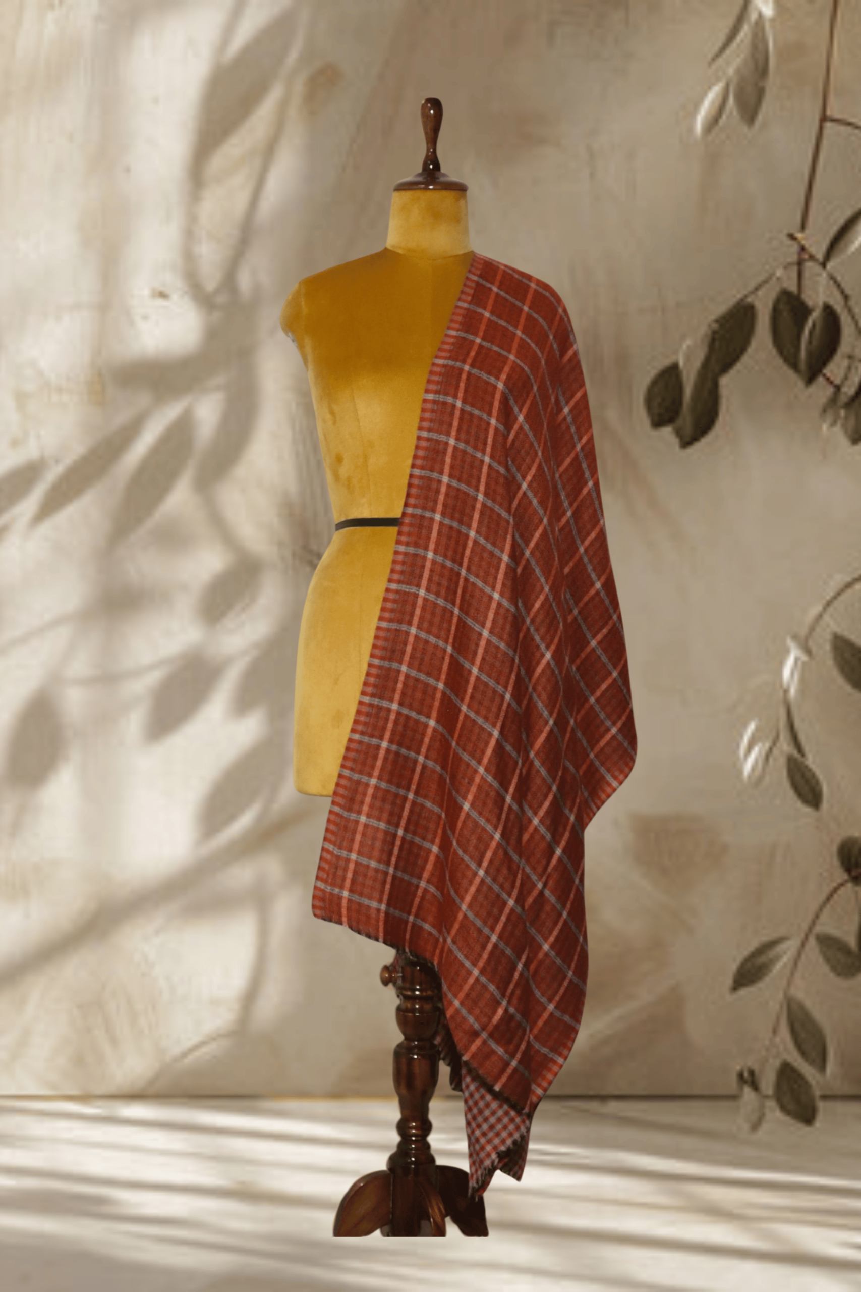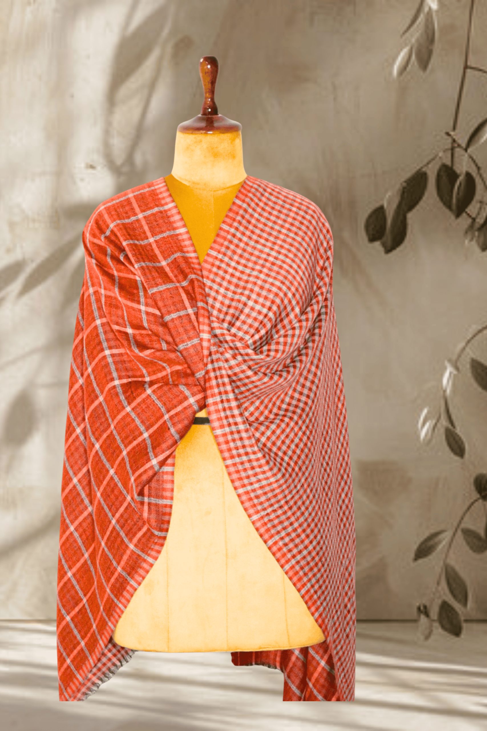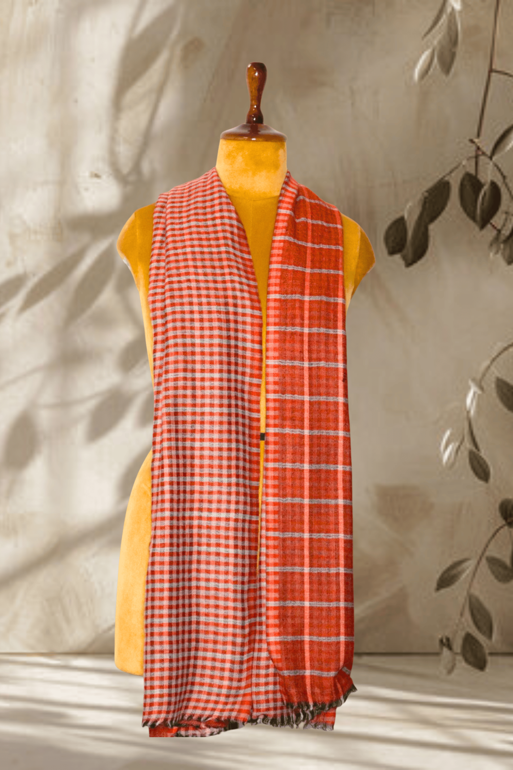 Description: This inviting Reversible Terracotta Checkered Stole brings a touch of earthy elegance to any look. One side features a rustic terracotta and light grey windowpane check, offering a striking yet subtle pattern. The reverse side showcases a finer terracotta and light grey micro-check, providing textural variation. Made from Cashmera fine wool, this Stole is not only visually appealing but also exceptionally warm and soft, perfect for adding a cozy and stylish layer.