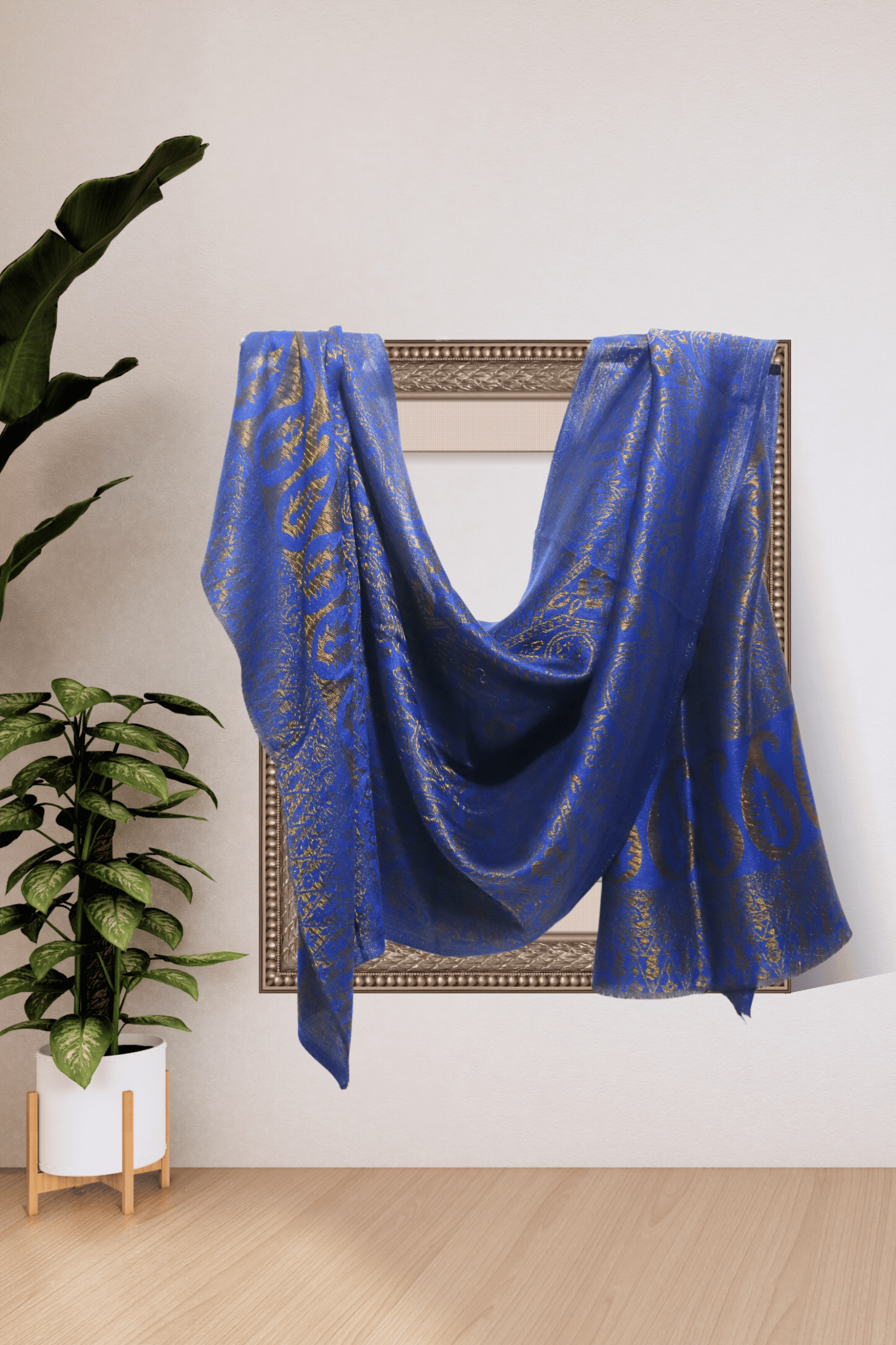 The stole features a stunning, all-over pattern of intricate paisley and floral motifs in shimmering Gold Zari, set against a deep, vibrant Royal Blue background.