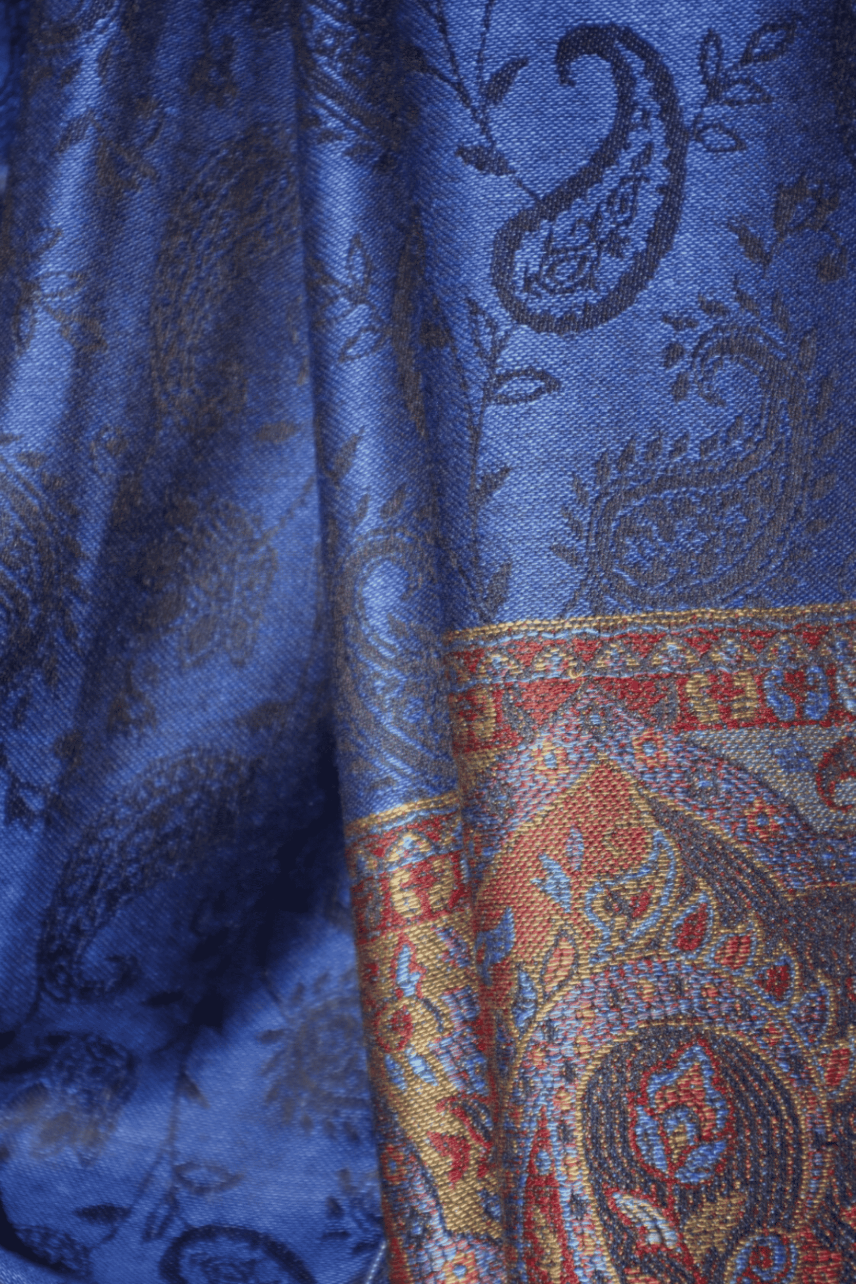 Colour: Royal Blue with multi-colour (red, orange, gold, blue) paisley motifs on borders