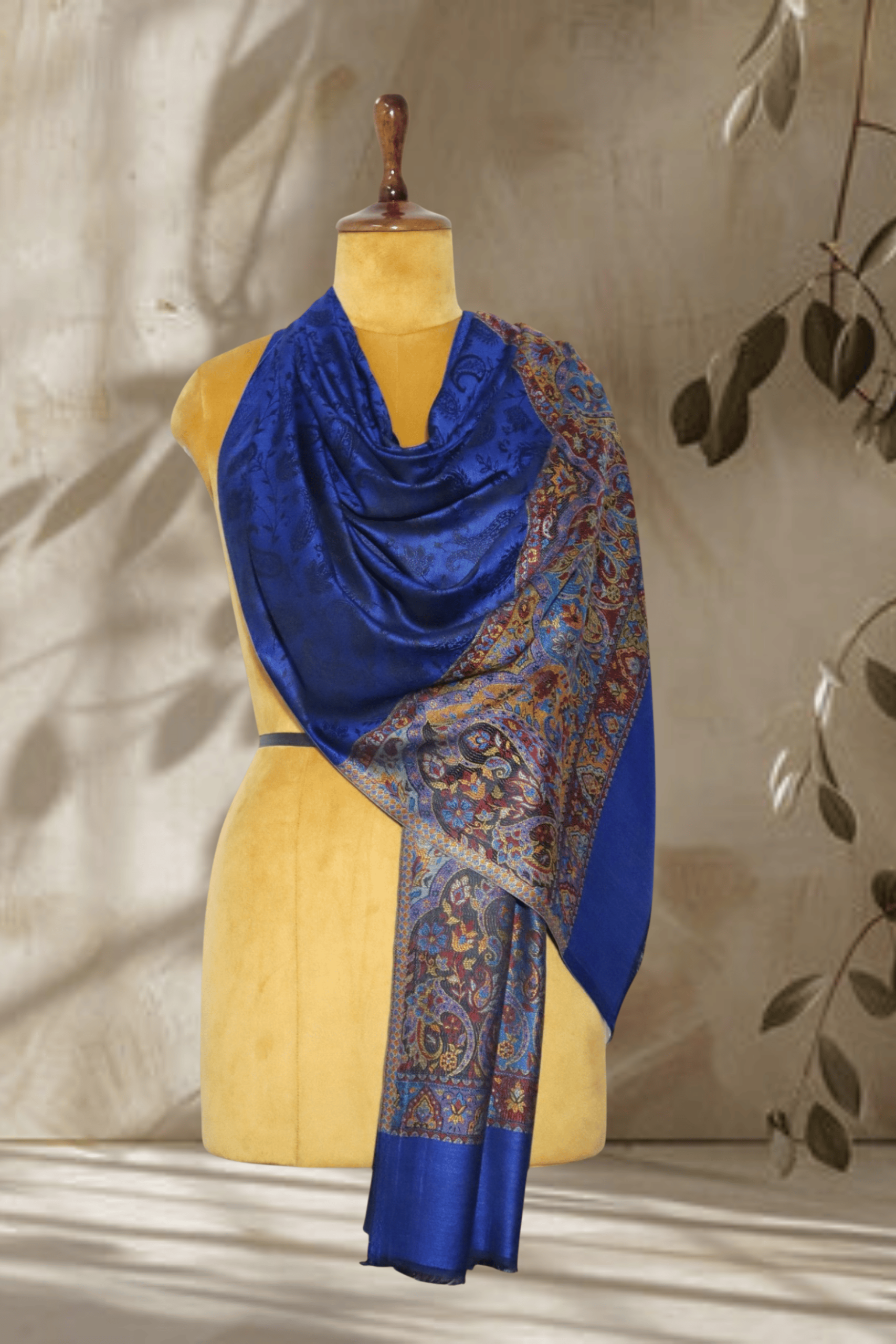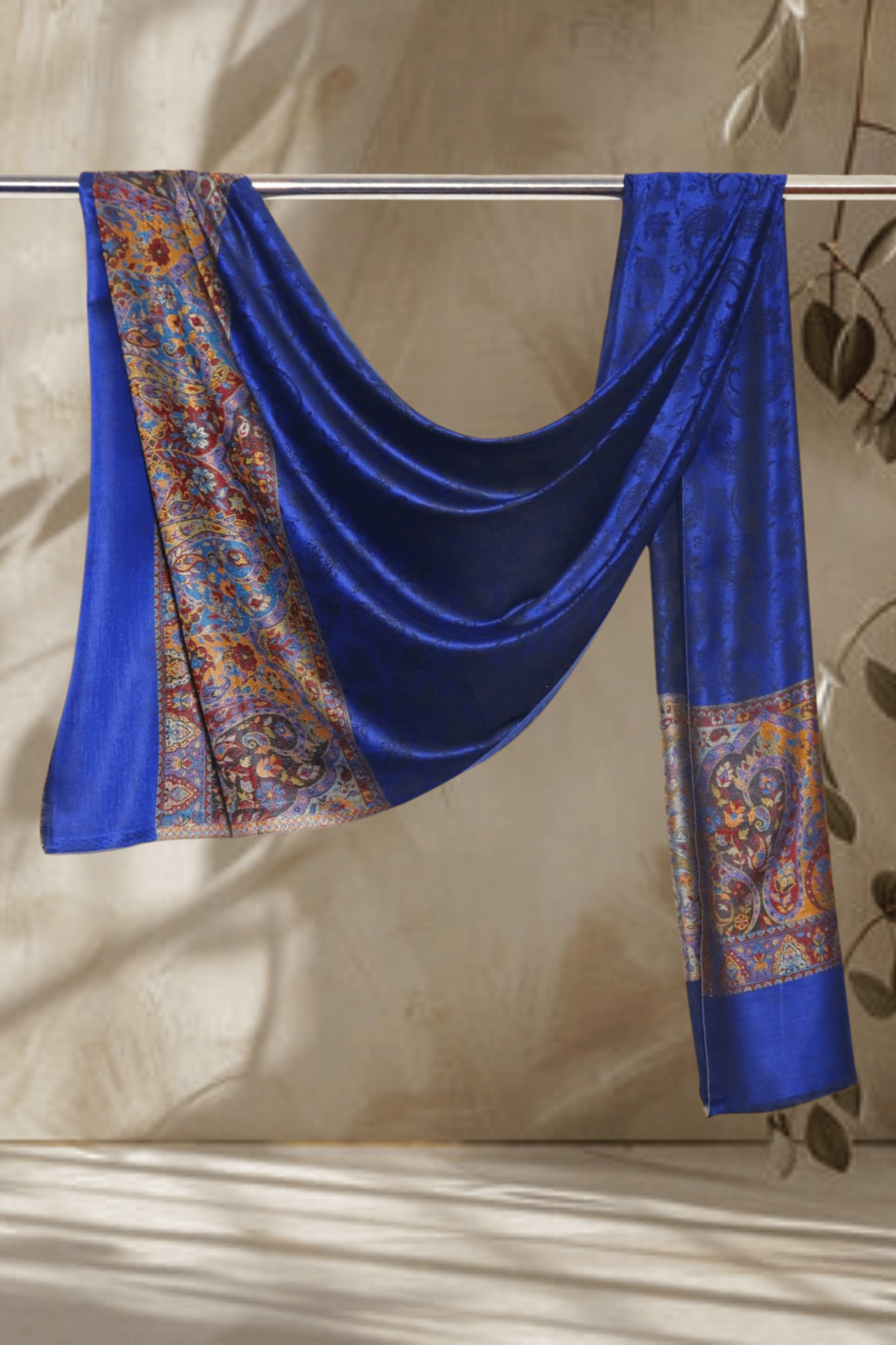 Make a regal statement with this stunning Royal Blue Silk Self Jama stole. The deep royal blue body is subtly textured with self-woven paisley (buta) patterns, offering an understated elegance. The true highlight lies in the magnificent, richly woven borders at both ends, featuring a dazzling array of multi-coloured paisley motifs in shades of red, orange, gold, and blue.