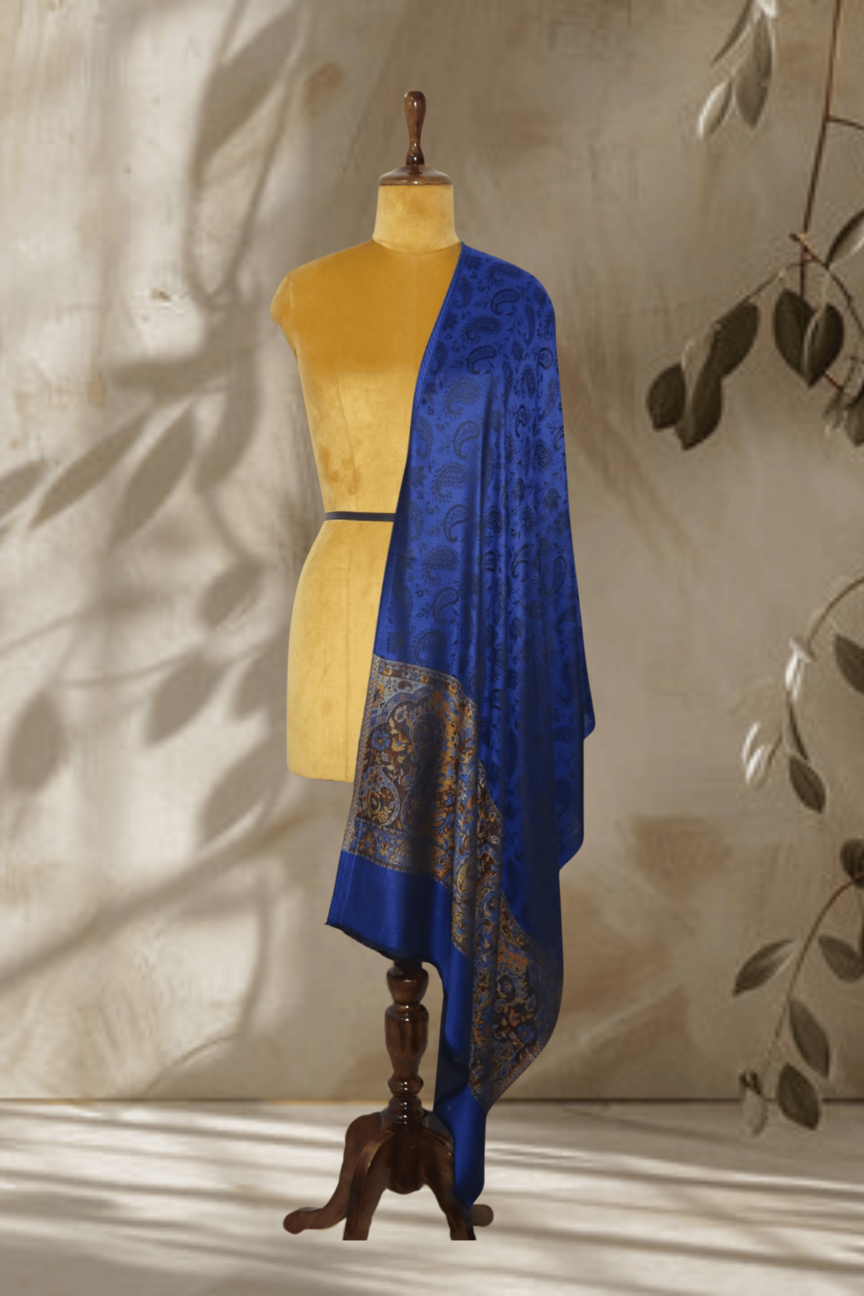 Description: Make a regal statement with this stunning Royal Blue Silk Self Jama stole. The deep royal blue body is subtly textured with self-woven paisley (buta) patterns, offering an understated elegance. The true highlight lies in the magnificent, richly woven borders at both ends, featuring a dazzling array of multi-coloured paisley motifs in shades of red, orange, gold, and blue. Made from luxurious silk, this stole promises a graceful drape and a sophisticated sheen, perfect for adding a touch of grandeur to any occasion.