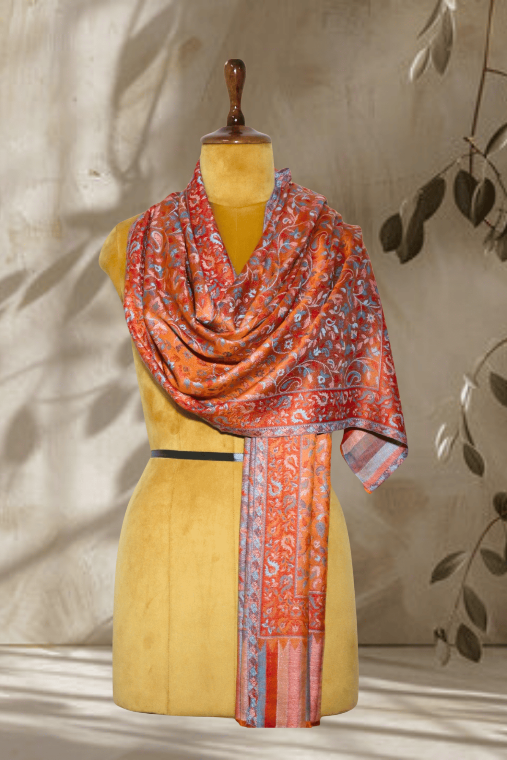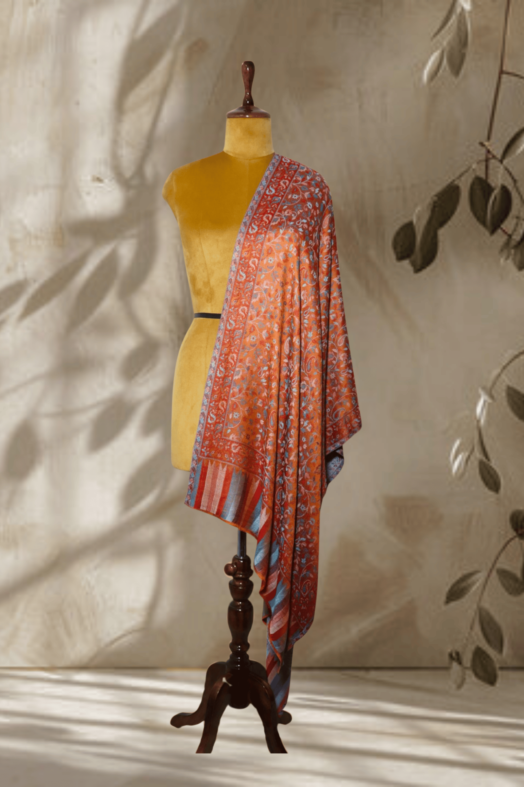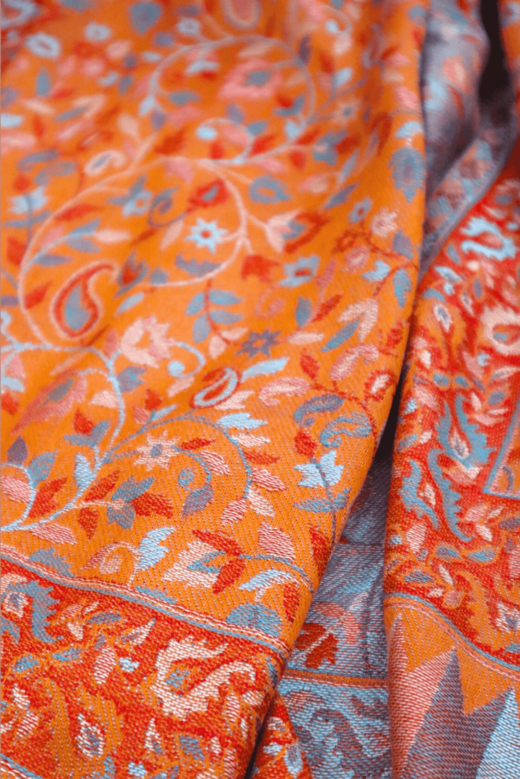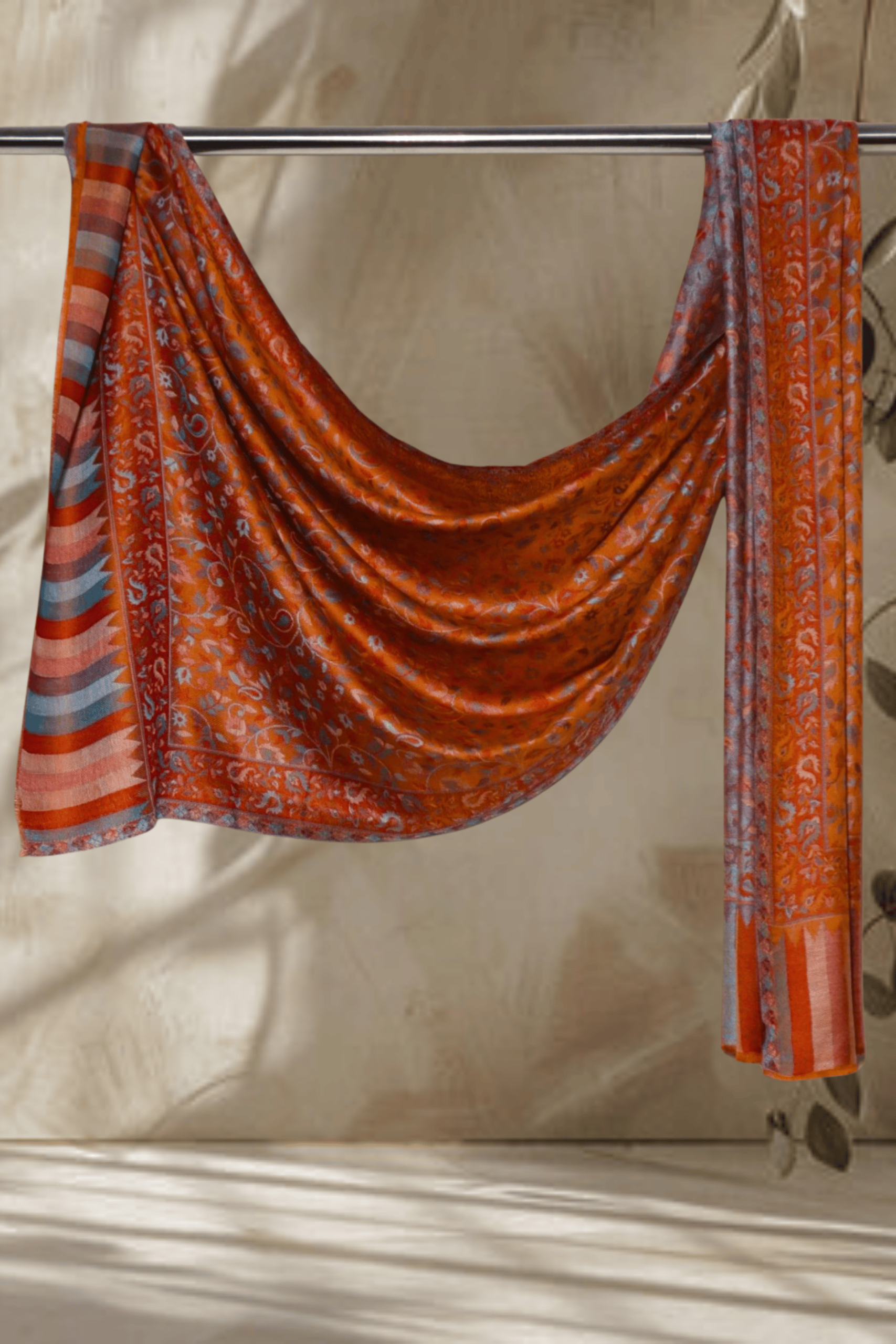 Experience the artistry of Kashmir with this stunning Rust Orange Silk Kani Jama stole. This exquisite piece features an all-over intricate floral and vine pattern, reminiscent of traditional Kani weaving, meticulously rendered in shades of rust orange, blue, and grey.