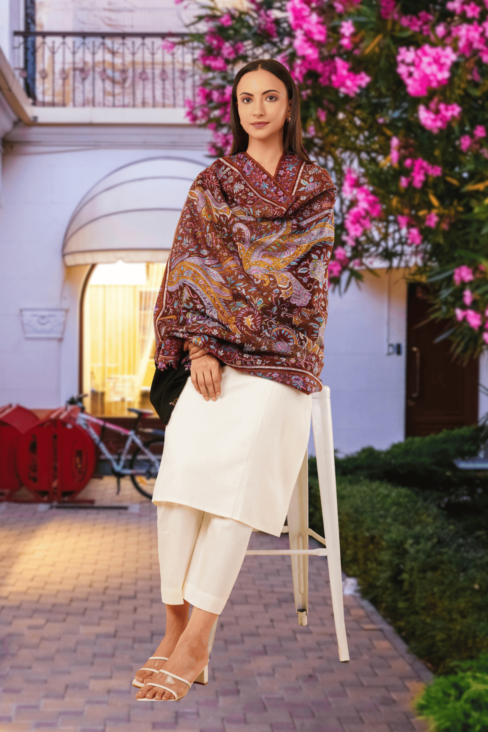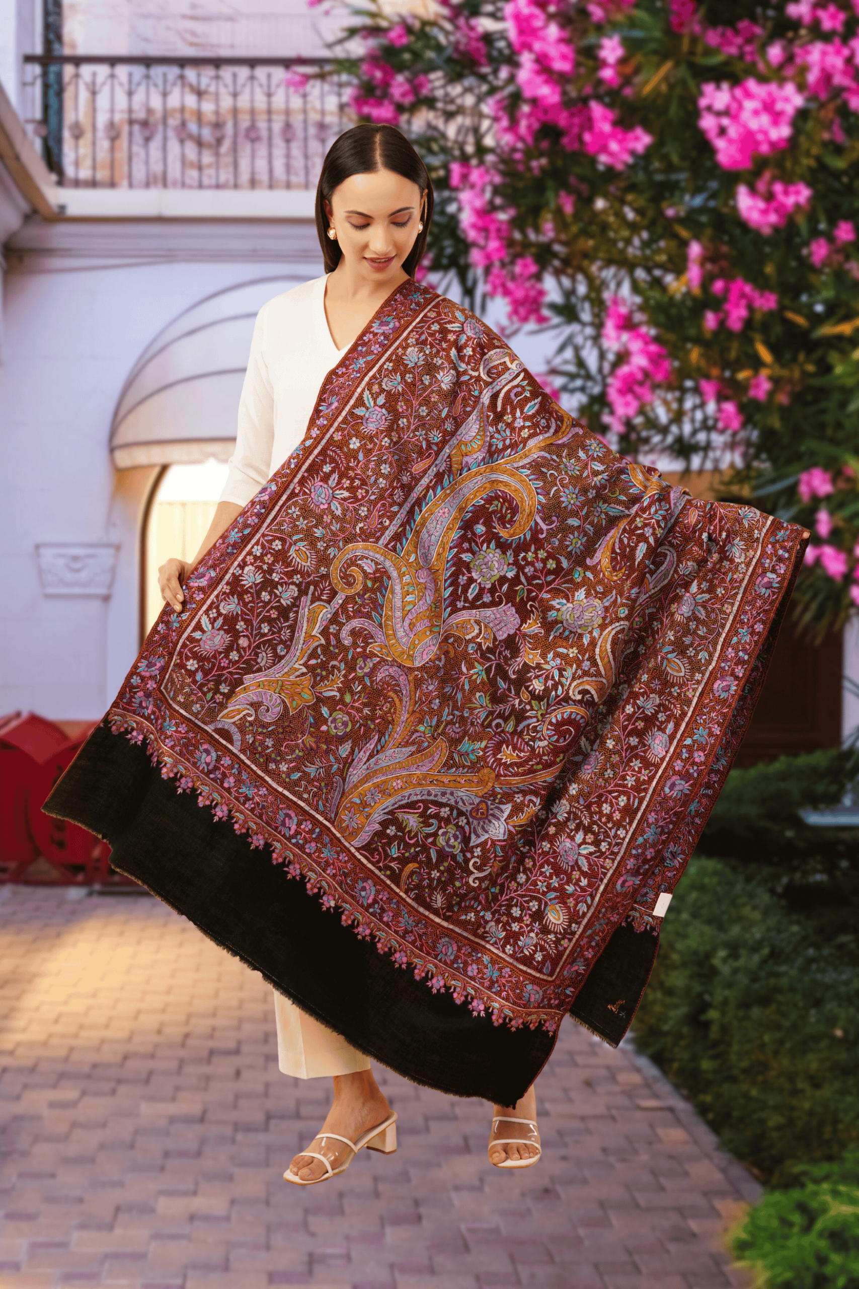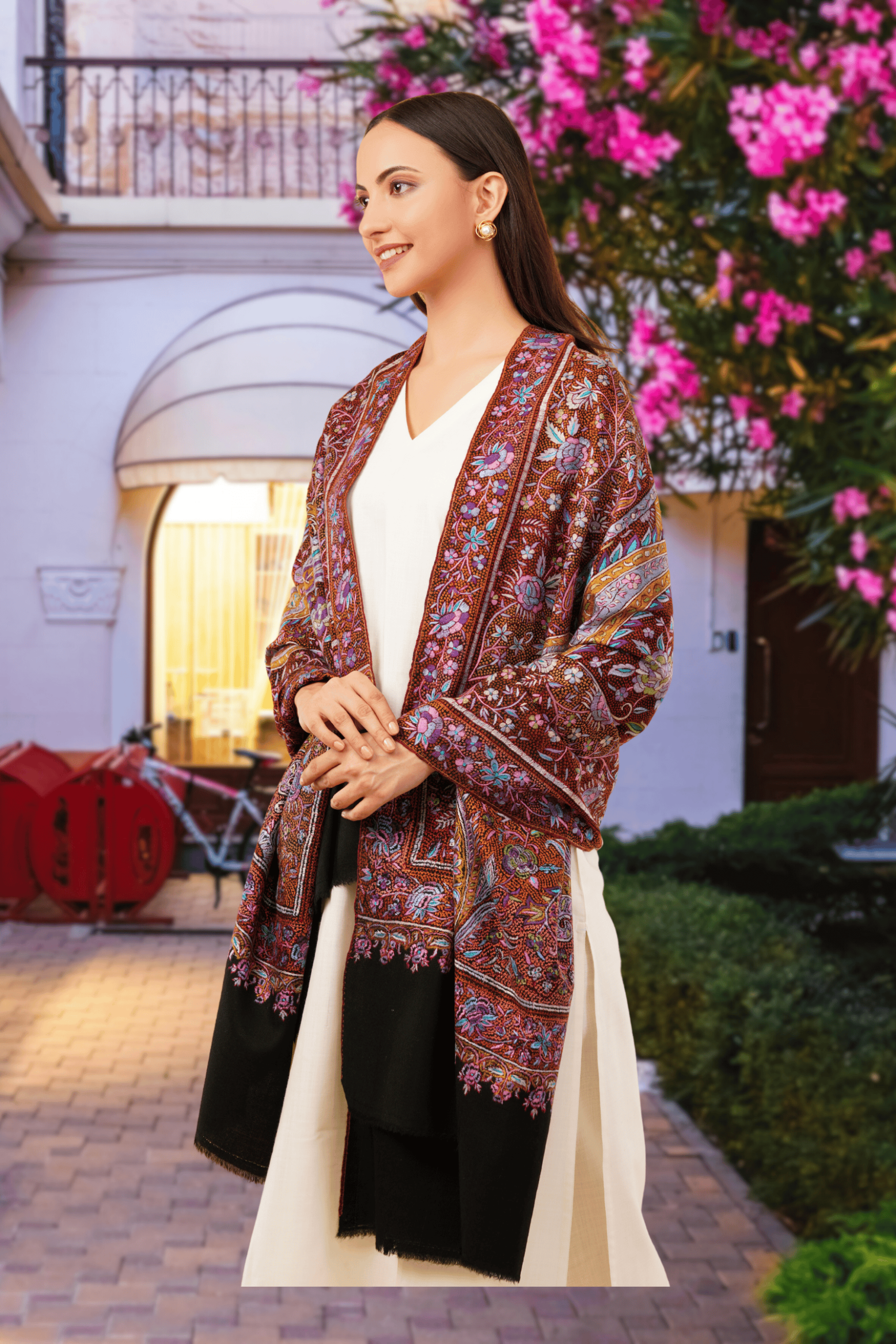 A masterpiece of hand embroidery, this Taikatkaar shawl celebrates the depth of Kashmiri craftsmanship. Taikatkaar refers to the meticulous, time-intensive needlework that covers the shawl in delicate motifs. The black base offers an elegant canvas to the vibrant floral designs in reds, blues, and greens. Warm, soft, and incredibly lightweight, this shawl exudes quiet luxury—perfect for formal occasions or heirloom gifting.